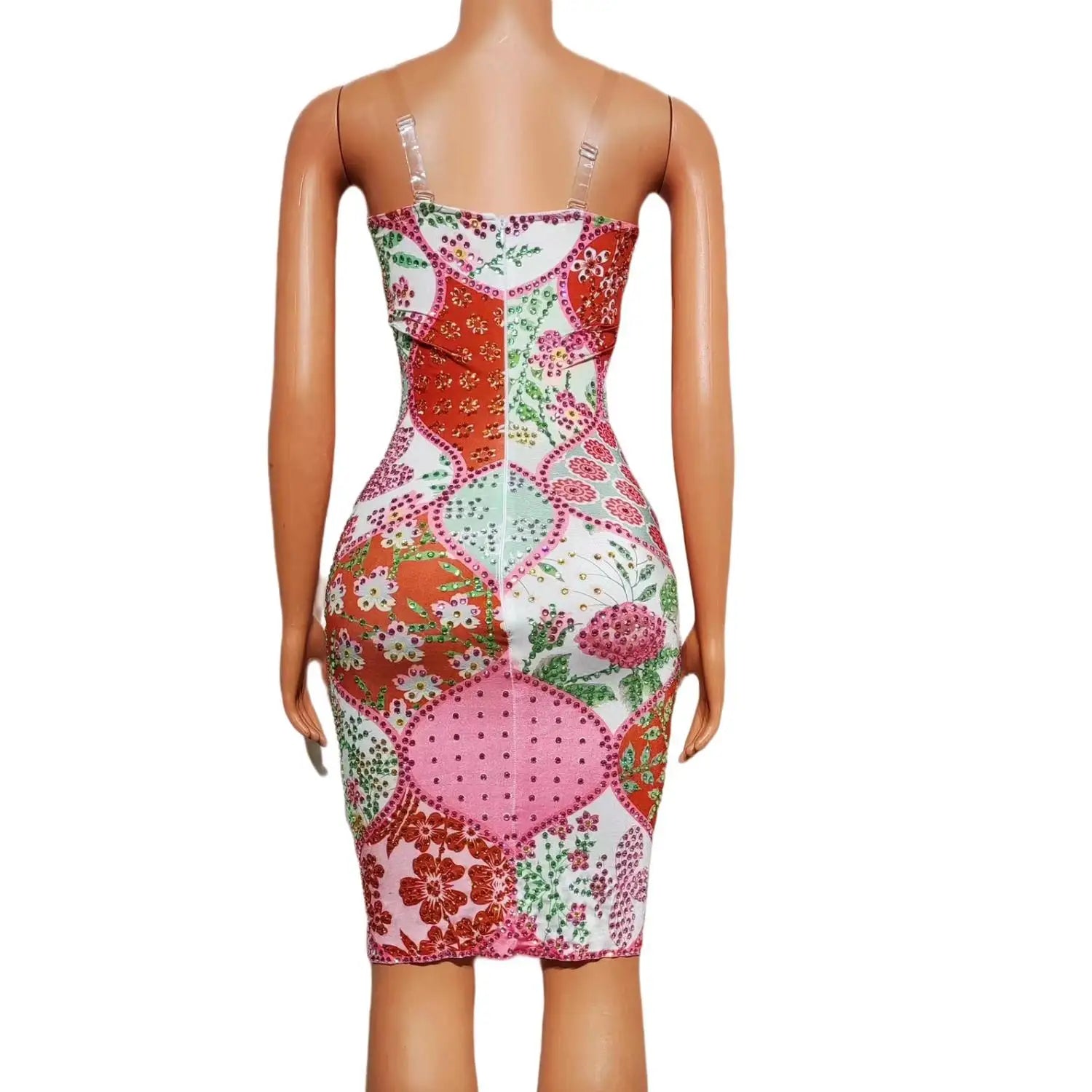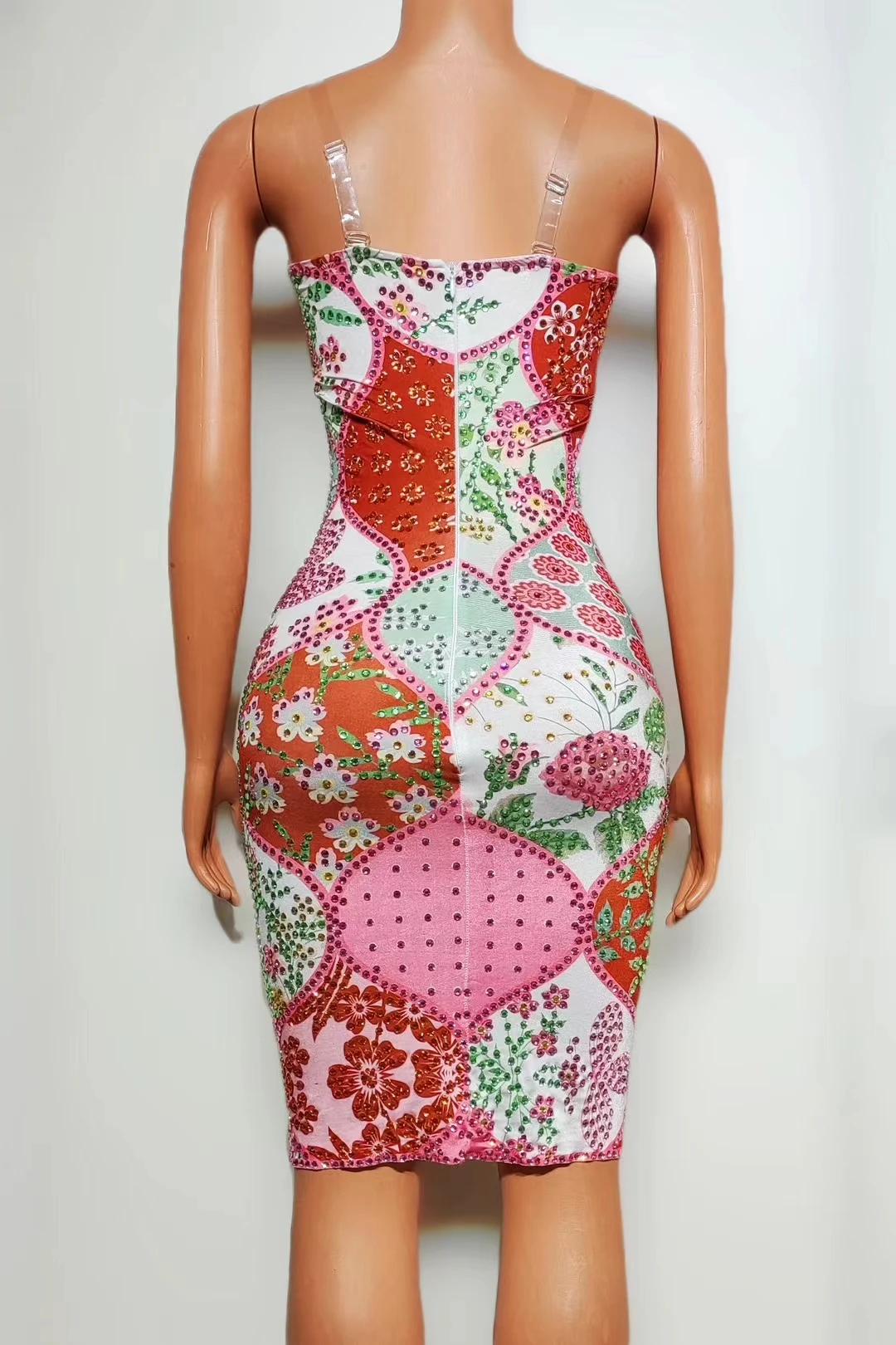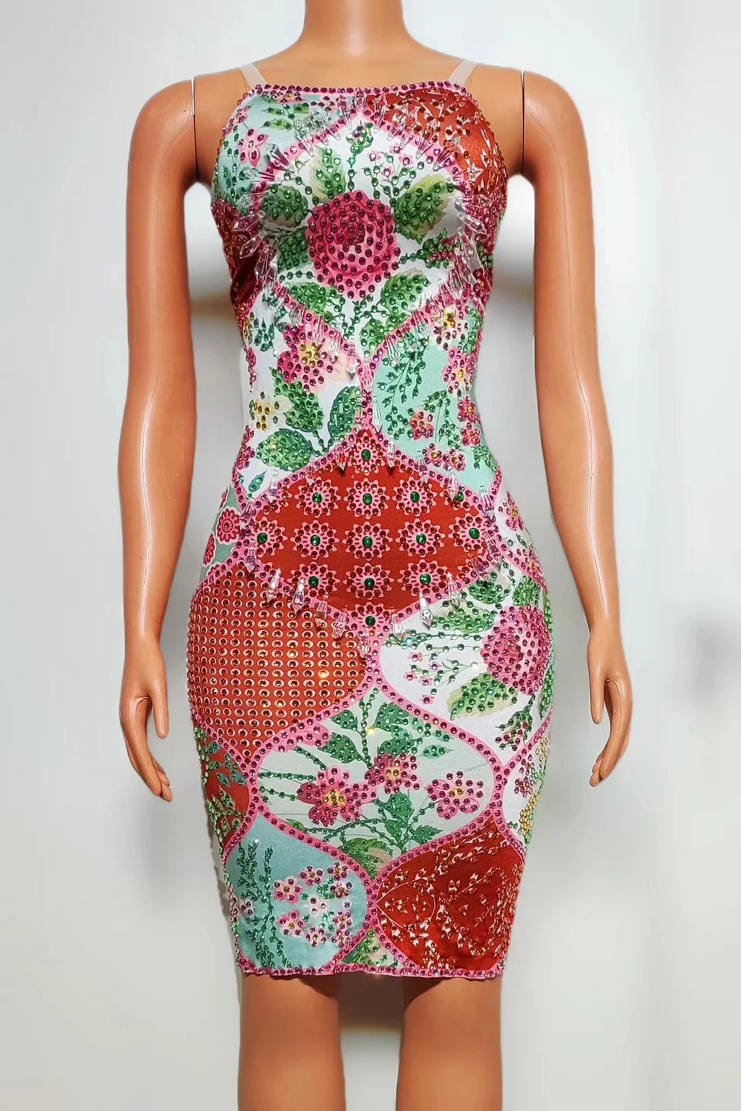 Sexy Sparkly Red Flower Rhinestones Short Dress Lady Sleeveless Birthday Party Outfit Singer Stage Show Slim Fit Dress Huabei