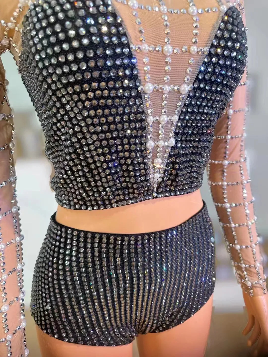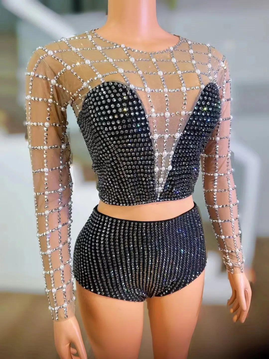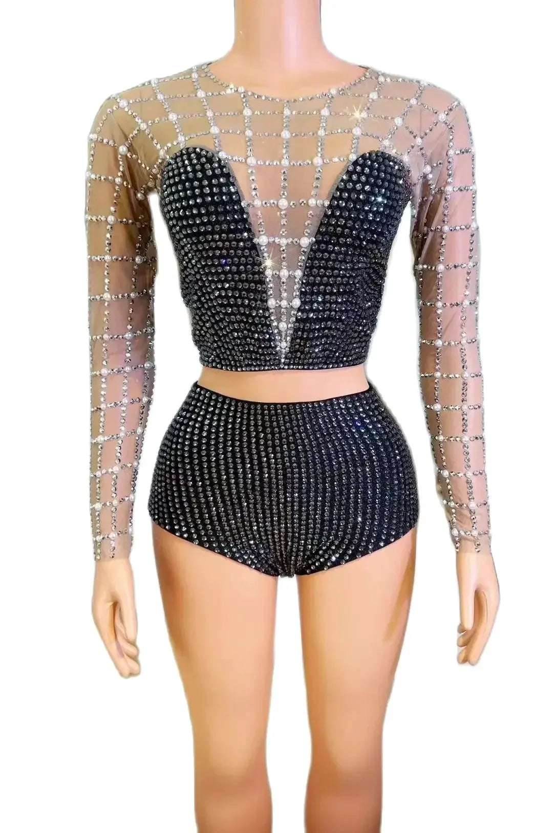 Make a statement in our sexy two-piece set featuring a sparkly rhinestones and pearls long sleeve top paired with shorts. This outfit is perfect for parties, birthday celebrations, or stage performances. The intricate detailing and glamorous design will make you stand out and shine on any occasion. Elevate your show-stopping style with this stunning ensemble, designed for women who want to make a bold statement.
