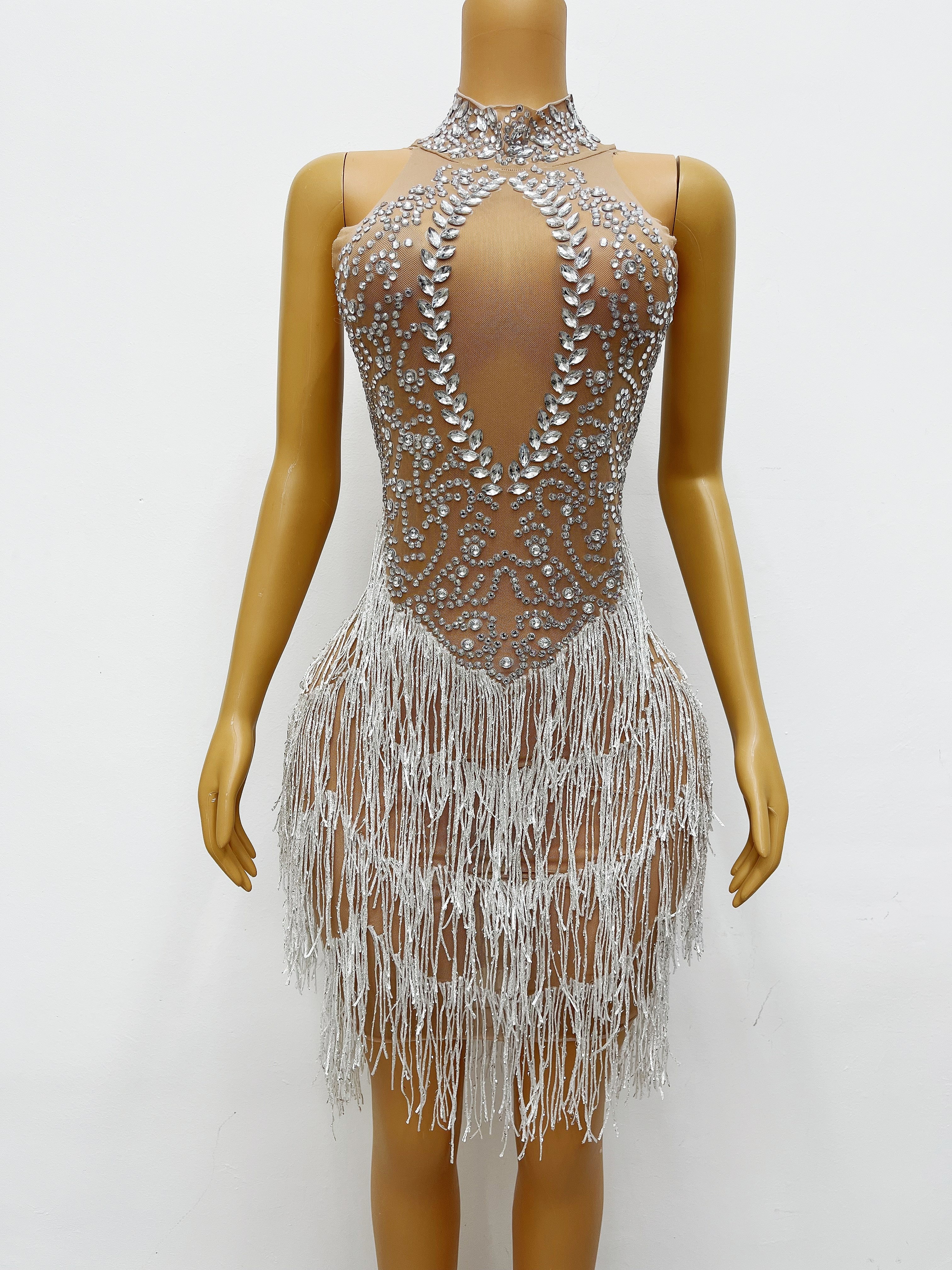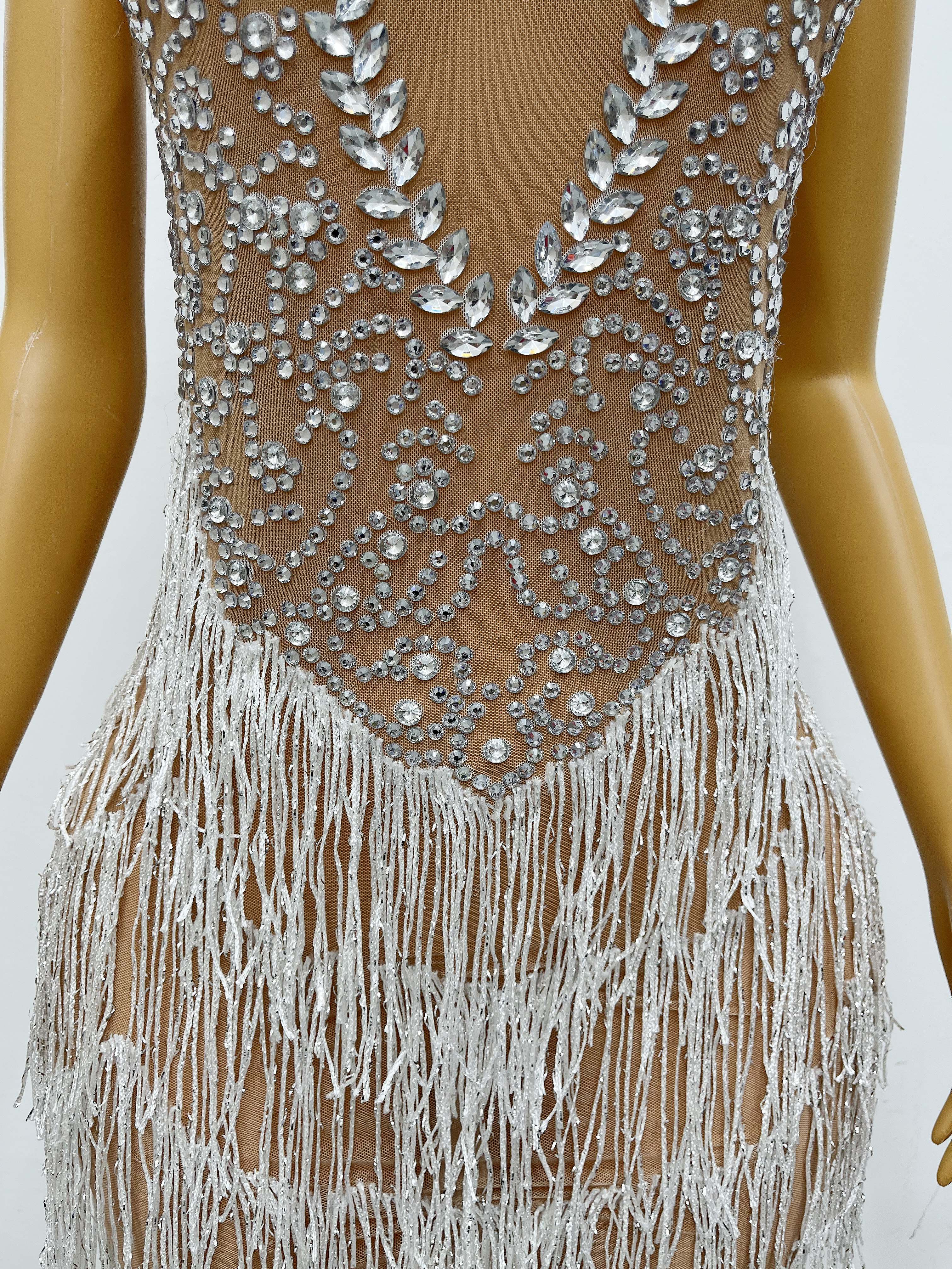 Sexy Sparkly Rhinestones White Fringes Sleeveless Dress Women Costume Stage Performance Wear Dance Singer
