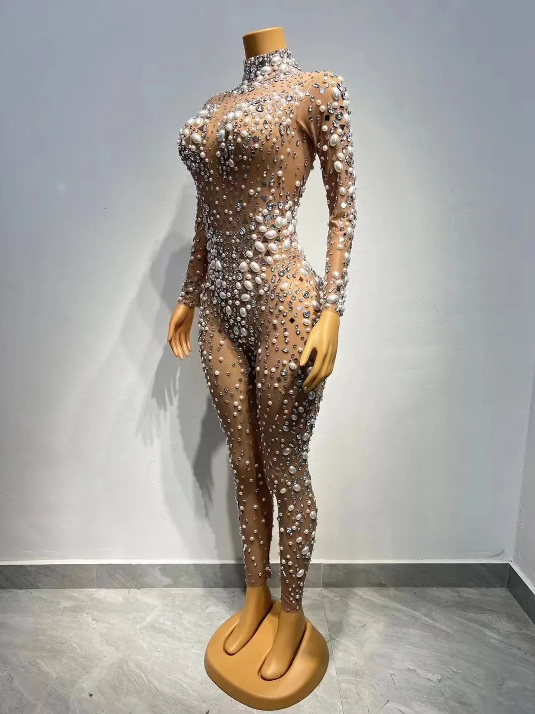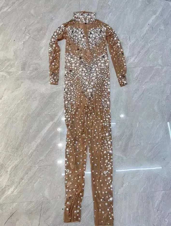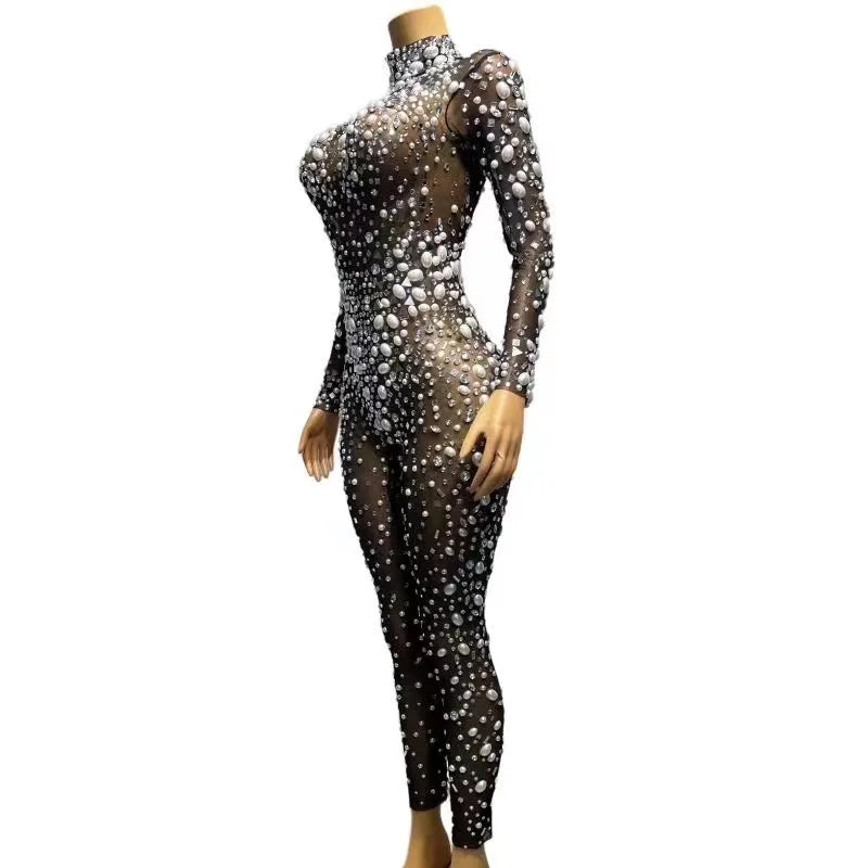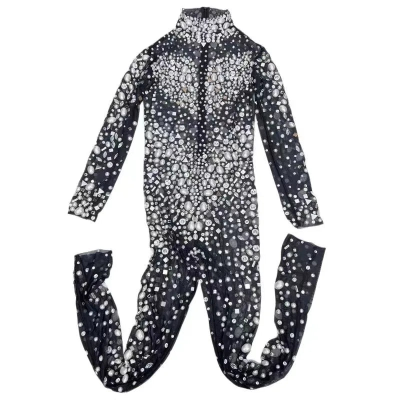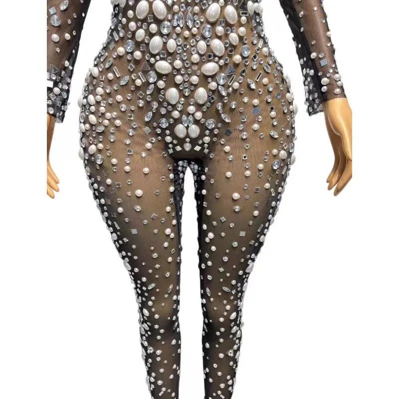 Make every spotlight moment unforgettable with this daring, transparent jumpsuit lavishly adorned with oversized pearls, crystals, and rhinestones. Designed for performers, models, and anyone who wants to celebrate in bold, photographed-perfect style, this piece fuses sultry transparency with high-impact embellishment for a look that’s both glamorous and performance-ready.