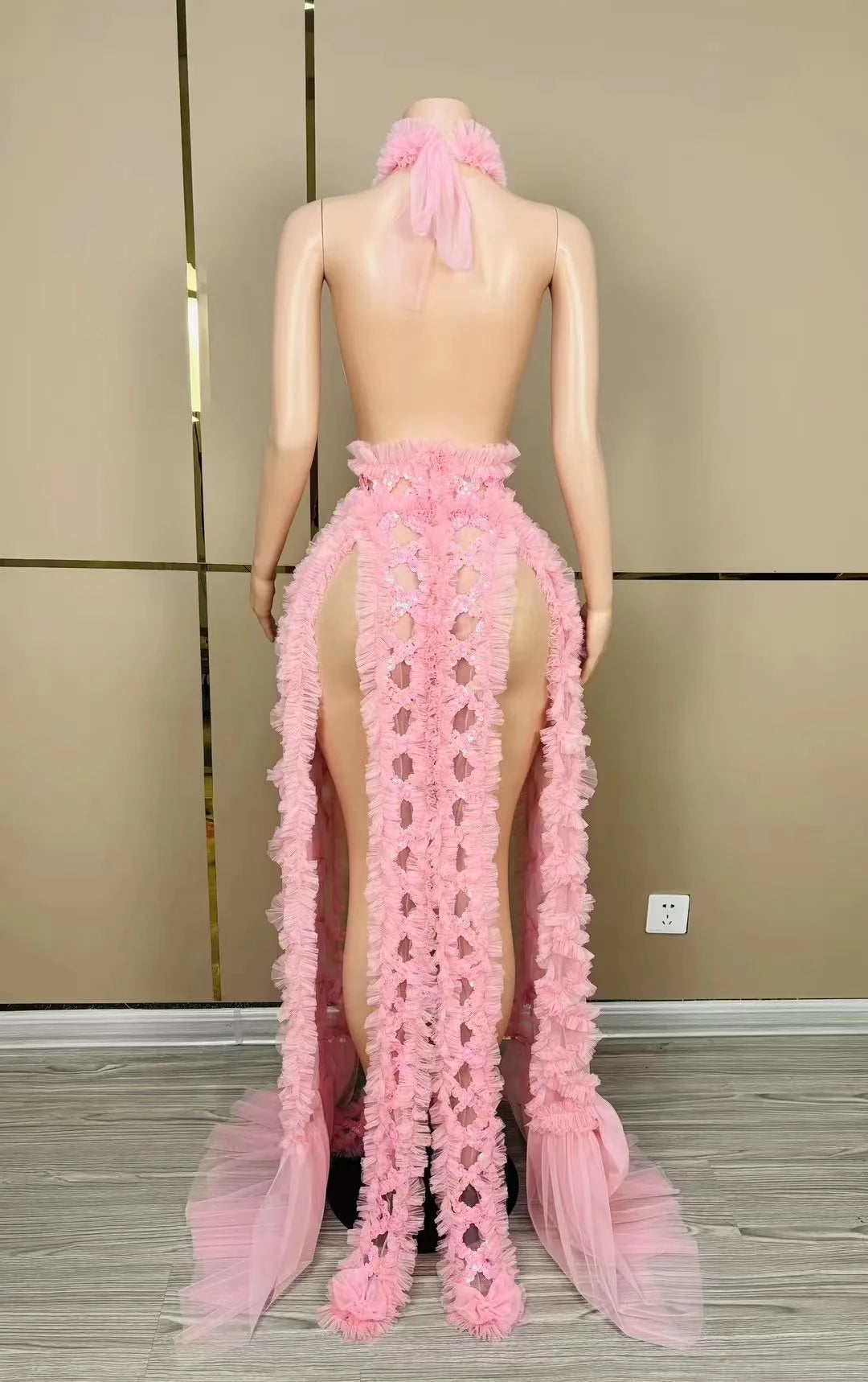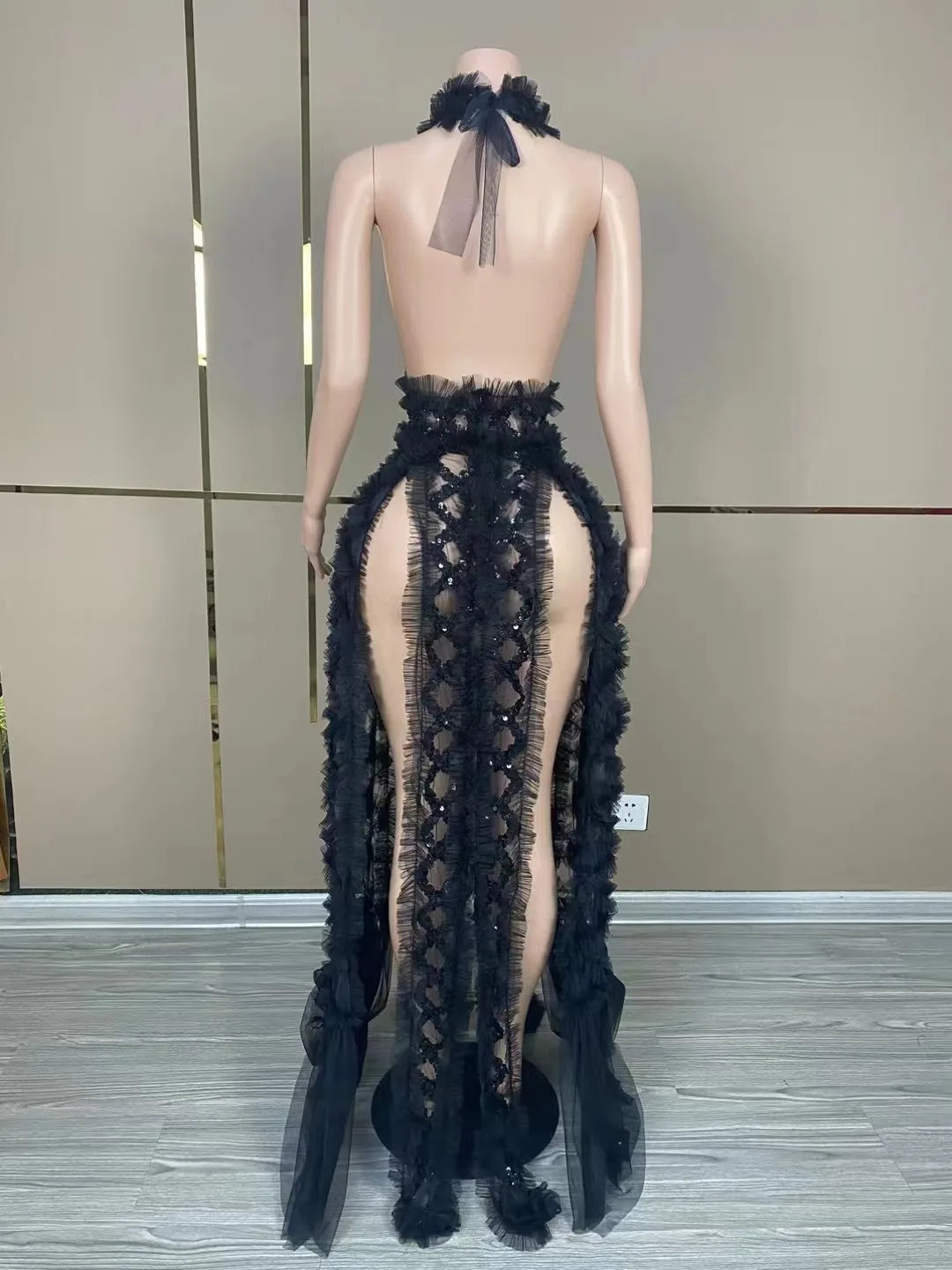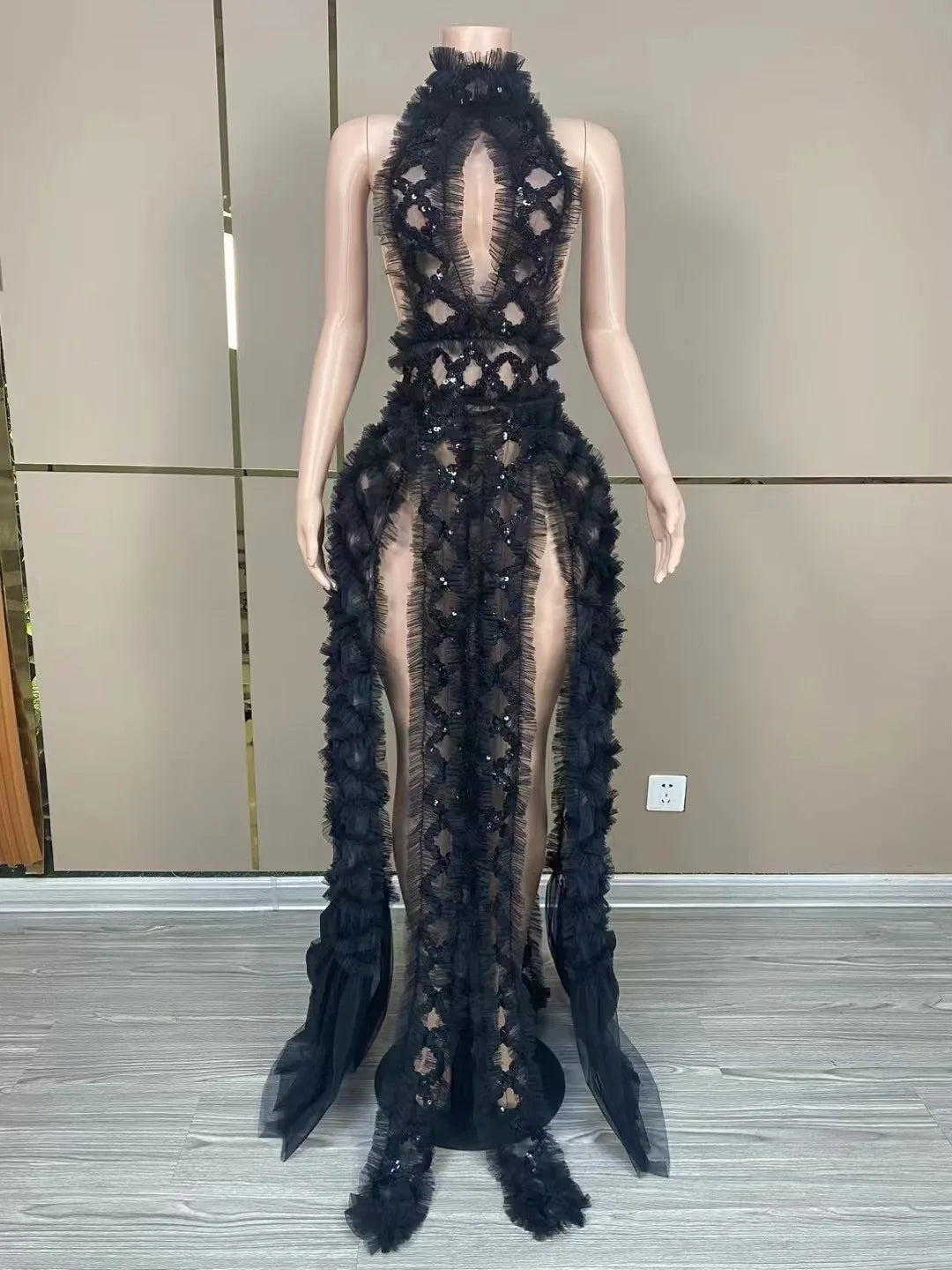 Turn heads in this sexy stage dress in black and red, featuring a mesh backless design that exudes allure. Perfect for performances, birthday parties, photo shoots, and gown collections. Make a bold statement with this transparent and eye-catching outfit that is sure to captivate attention.