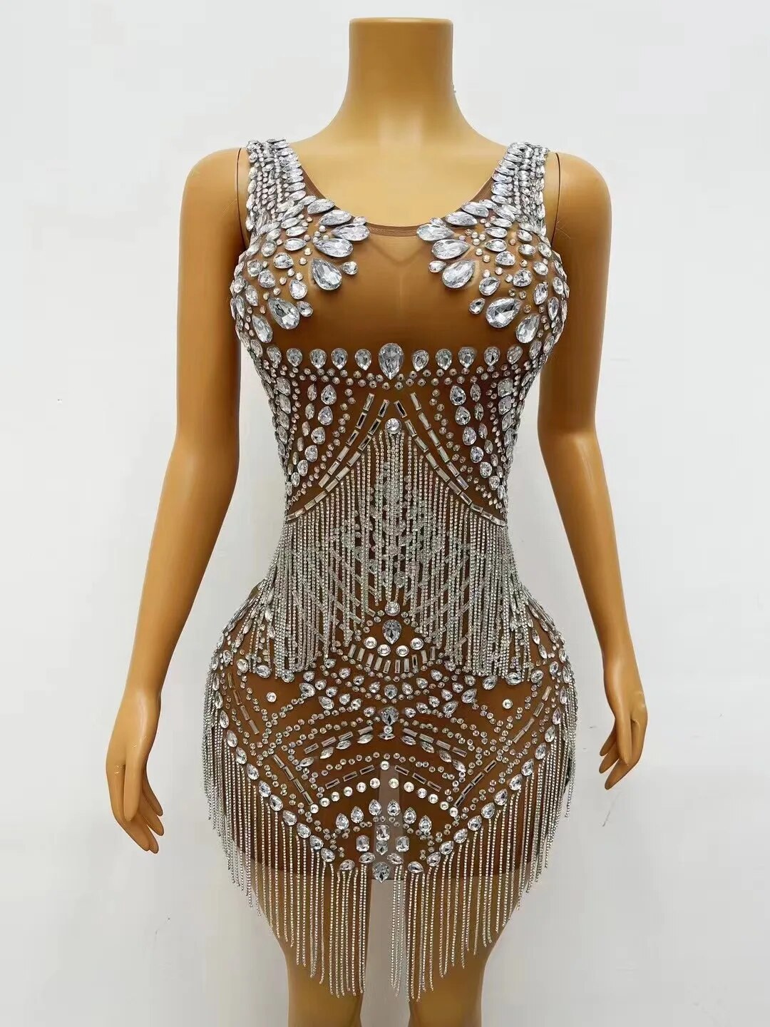 Sexy Stage Bling Silver Crystals Chains Dress See Through Mesh Costume Stage Wear Women Singer Show Rhinestones Photoshoot Dress