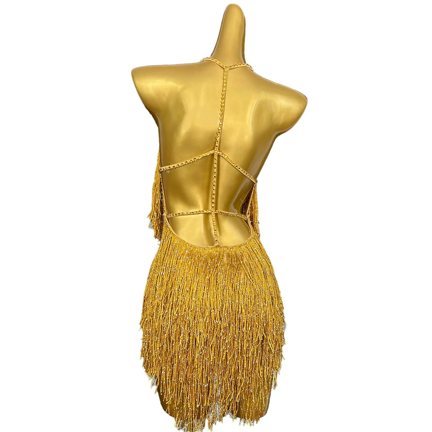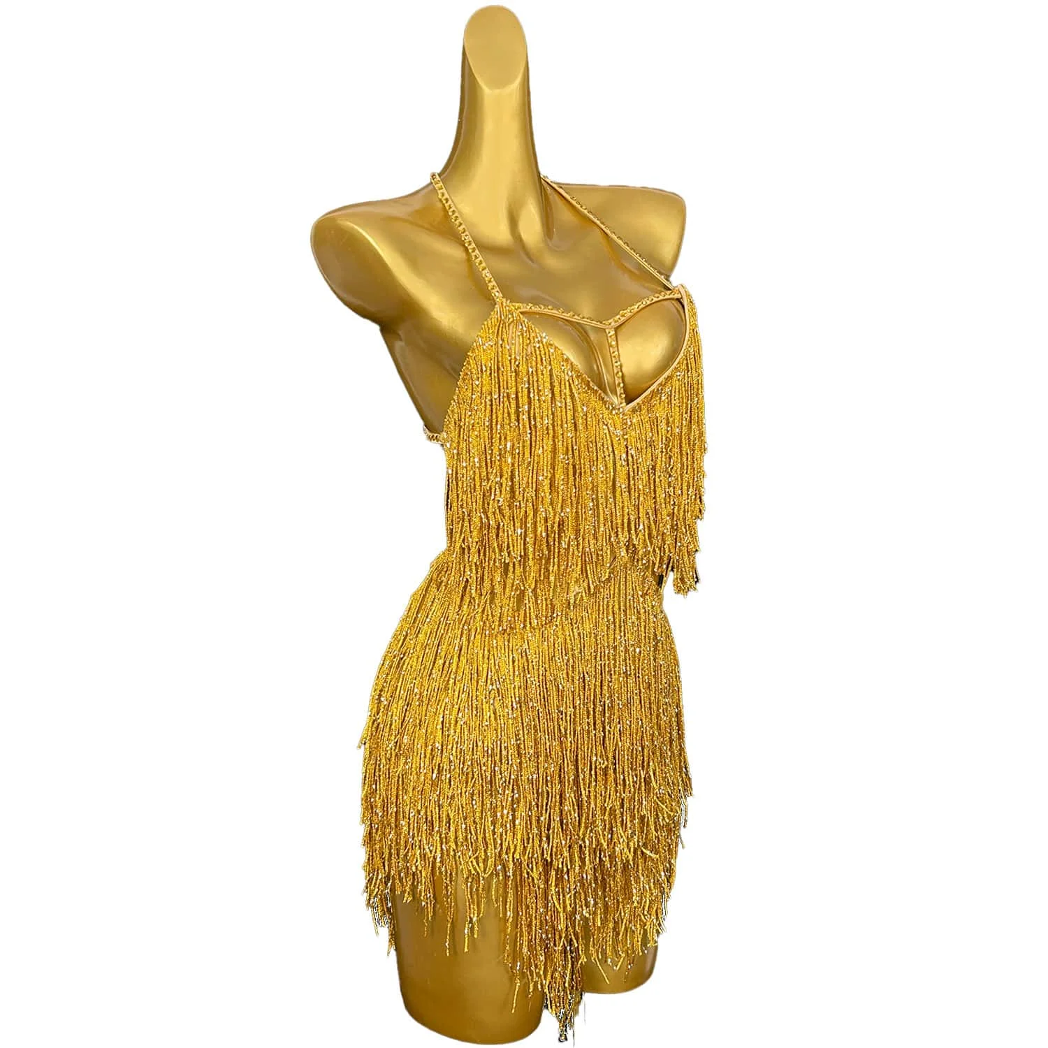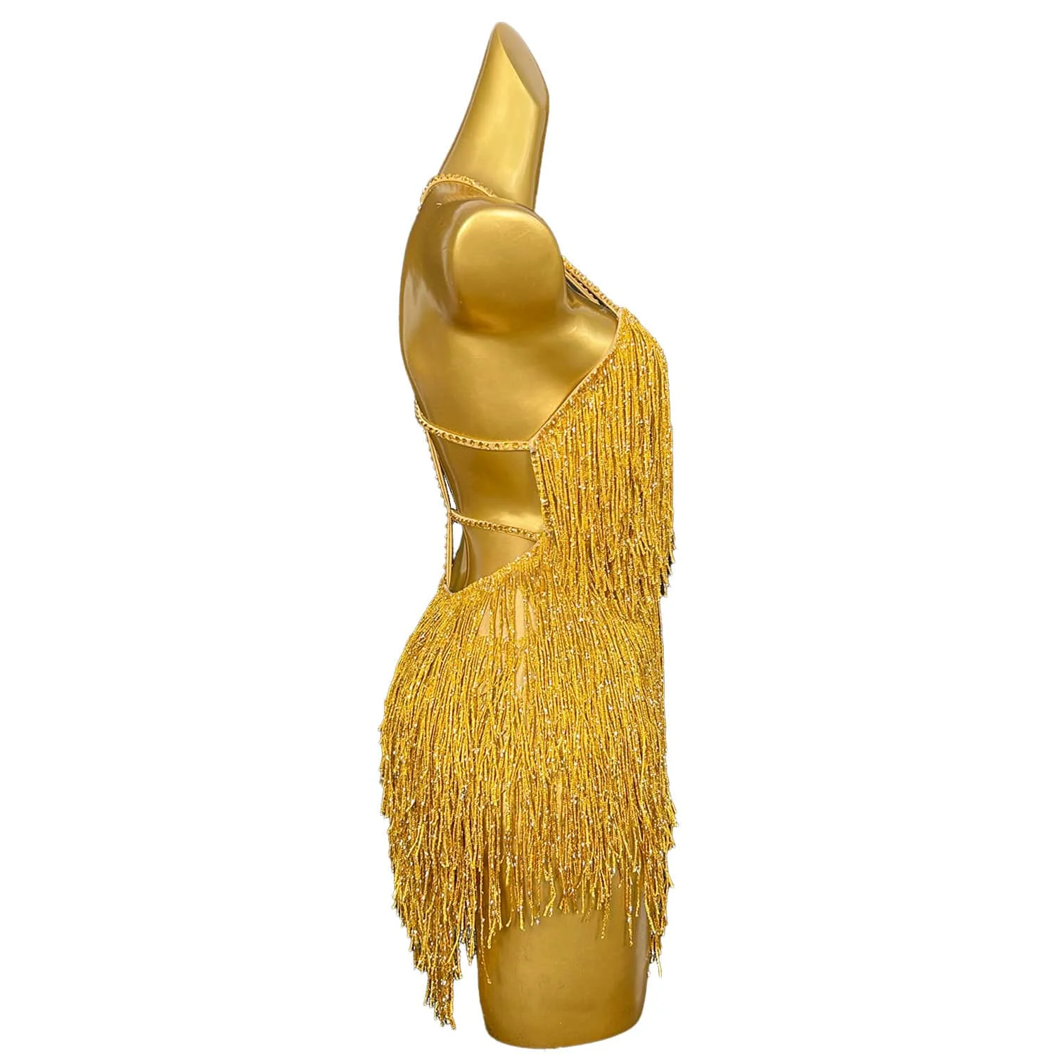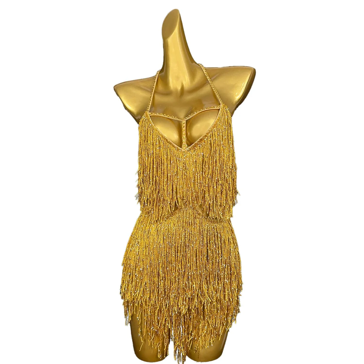 Sexy Stage Gold Fringes Dance Costume Outfit Tassel Bodysuit Evening Birthday Party Wear Nightclub Performance Dress Jintiao