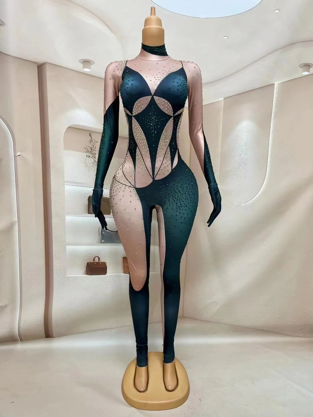 This sexy stage jumpsuit in green and gold is adorned with rhinestones, perfect for singers, dancers, evening celebrations, birthdays, club outings, and stretchy leggings.