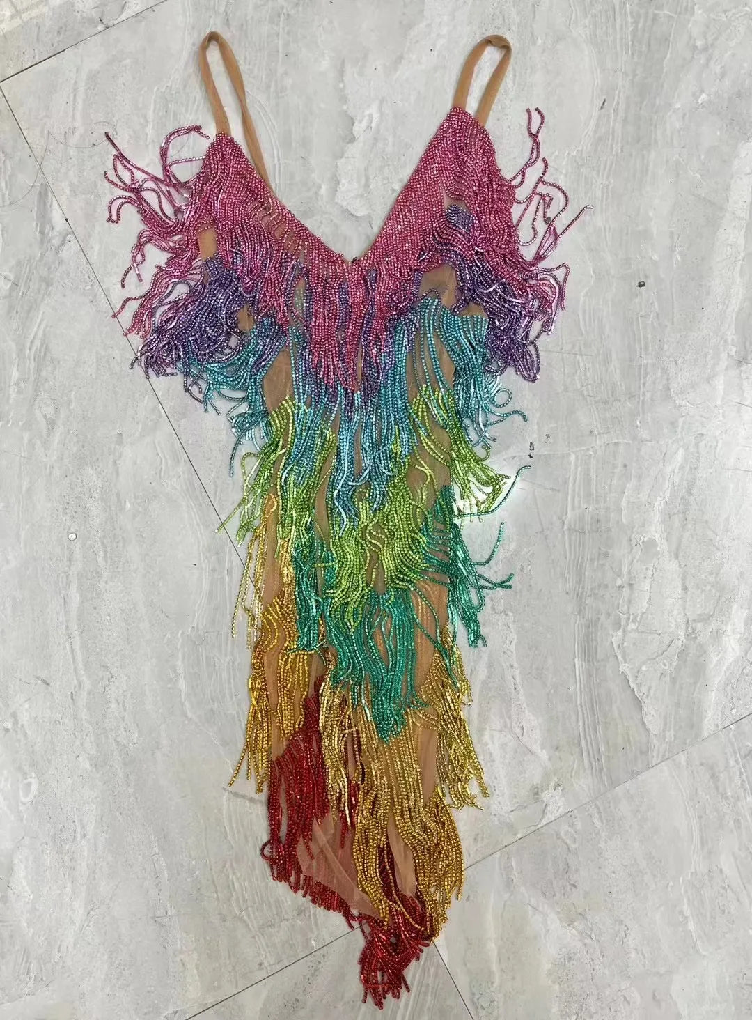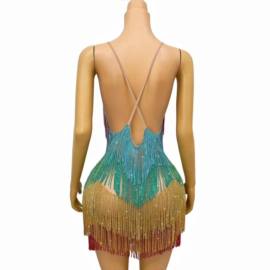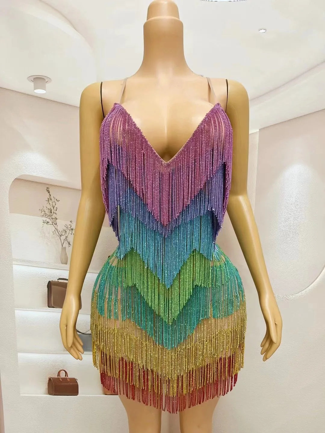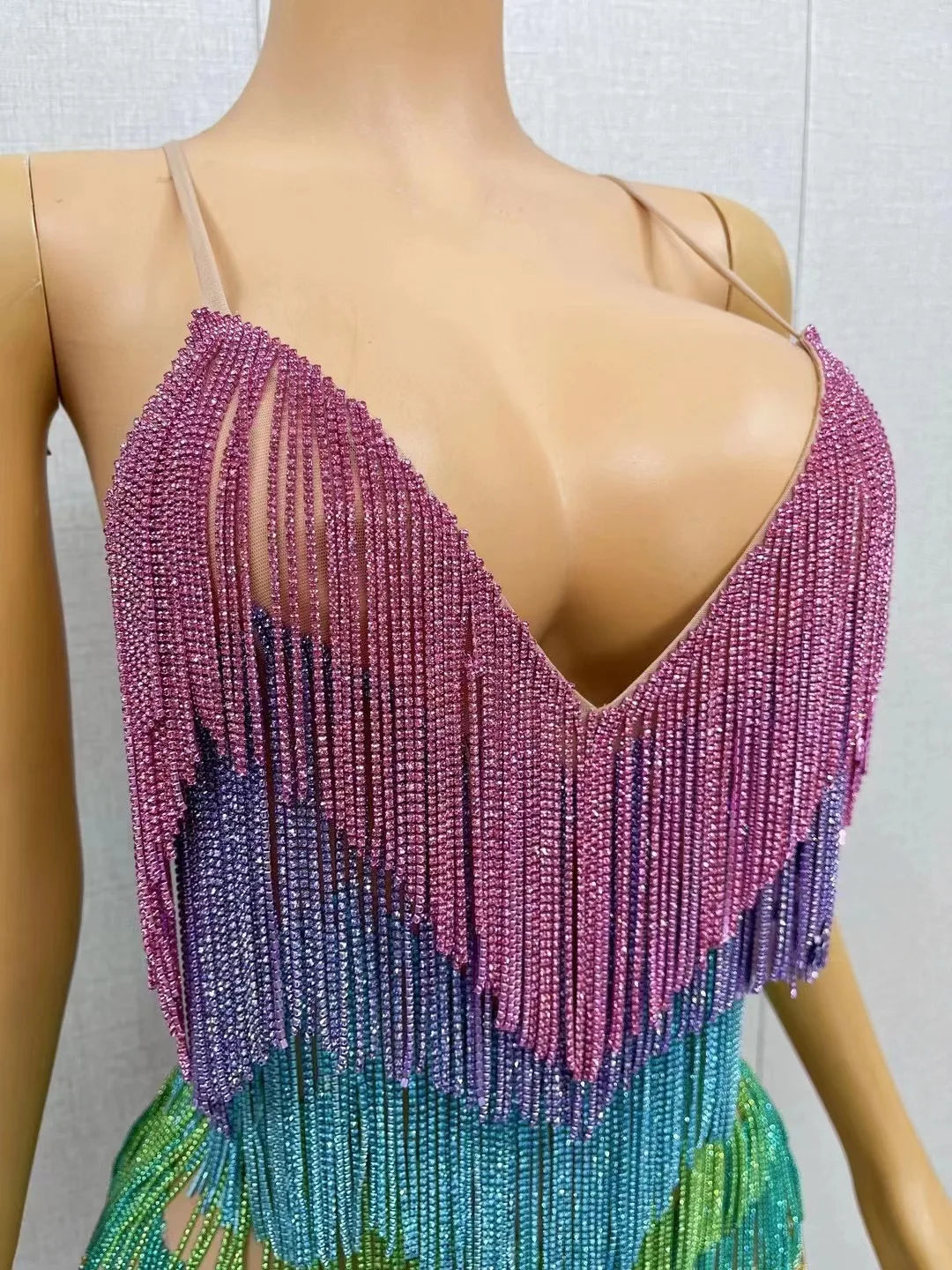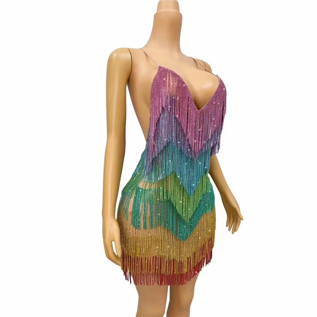 Sexy Stage Heavy Blingbling Rainbow Colour Crystals Chains V-neck Suspenders Dress Women Singer Dancer Photoshoot Costume