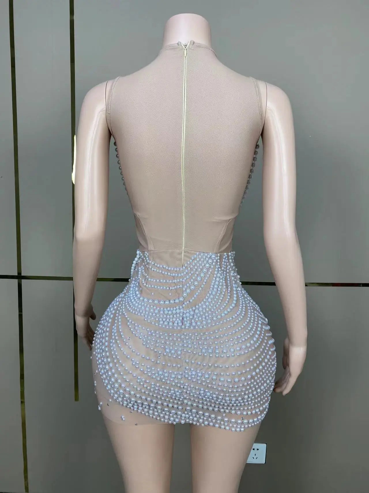 Step into the spotlight with this sexy stage mini dress featuring pearls, strings, and a mesh see-through design. Perfect for drag queen performances, club parties, birthdays, special occasions, and sexy photoshoots. Make a bold statement and exude confidence in this alluring and glamorous outfit.