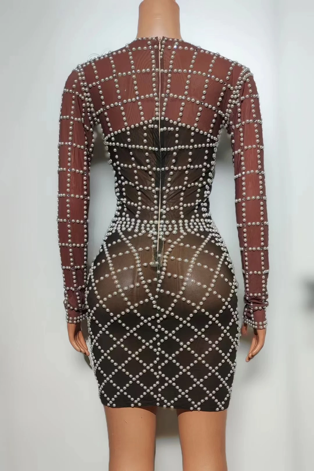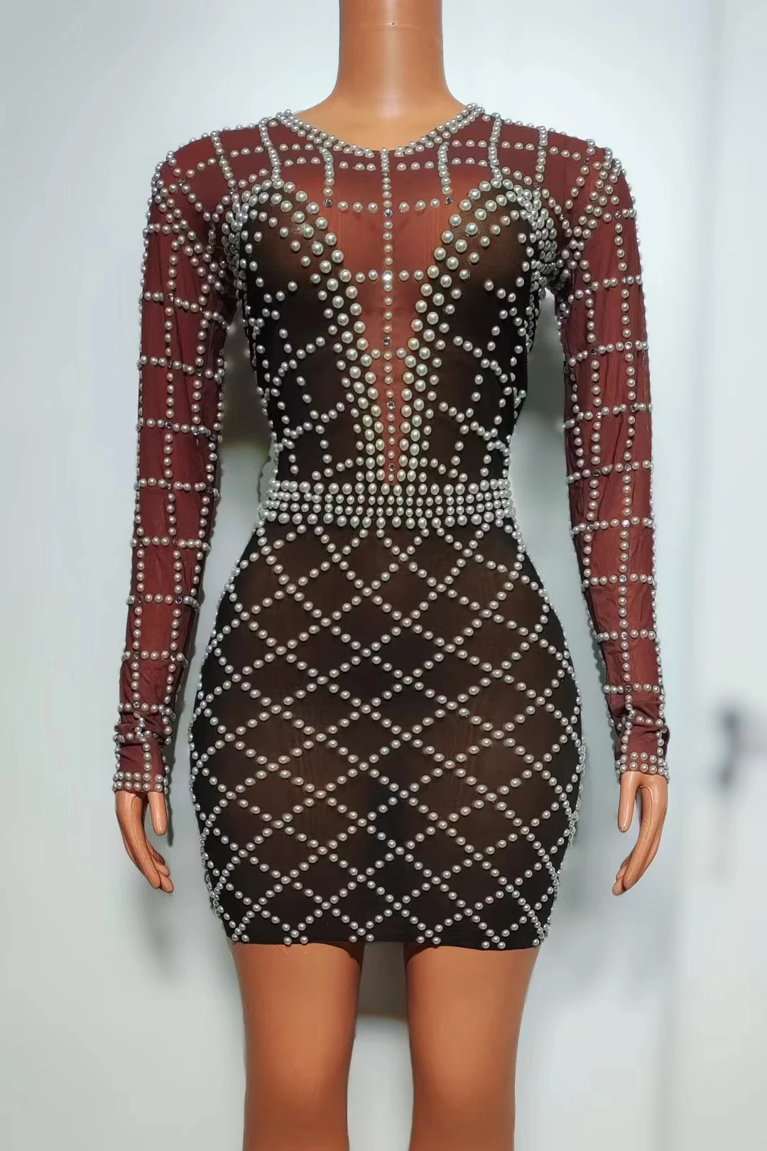 Sexy Stage Pearl Short Dress Women Birthday Party Long Sleeve Pearls Dress Drag Queen Costume Banquets Evening Dress Xihe