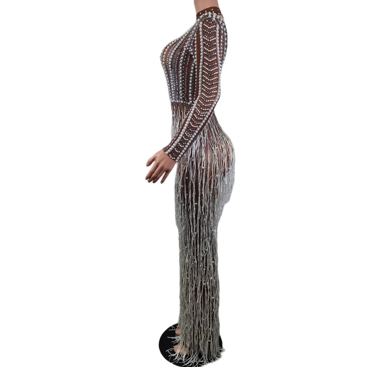 Make a bold and glamorous statement in this Sexy Stage Pearls Fringes Mesh Dress. Perfect for evening events, birthdays, celebrations, performances, dance outfits, and costumes, this dress is designed to captivate attention. The pearls and fringes embellishments add a touch of luxury and movement, while the mesh material creates a sultry and alluring look. Embrace the stylish and eye-catching design of this dress and celebrate in style at your next event. Stand out on stage and showcase your unique style in this dazzling and elegant costume that is sure to make you shine and sparkle.