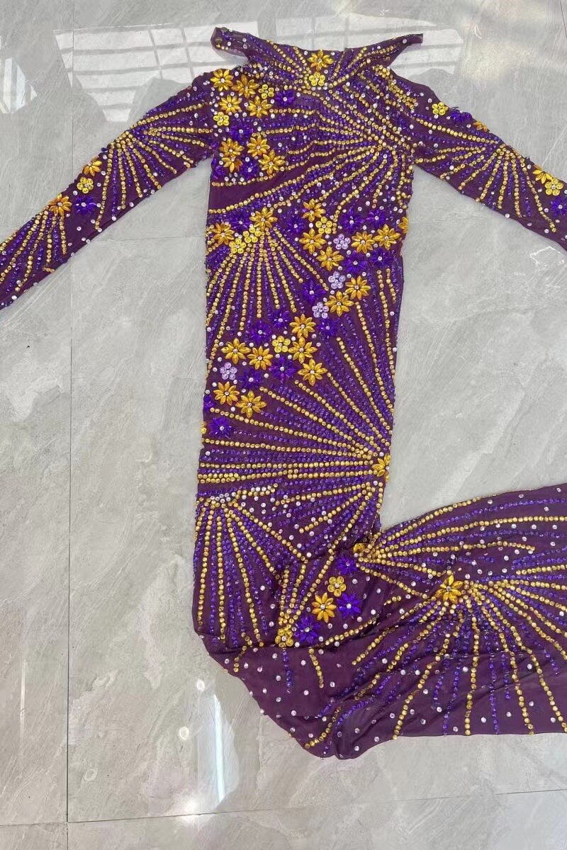 Sexy Stage Purple Gold Rhinestones Transparent Long Sleeves Dress Birthday Celebrate Sexy Outfit Prom Party Photoshoot Dress