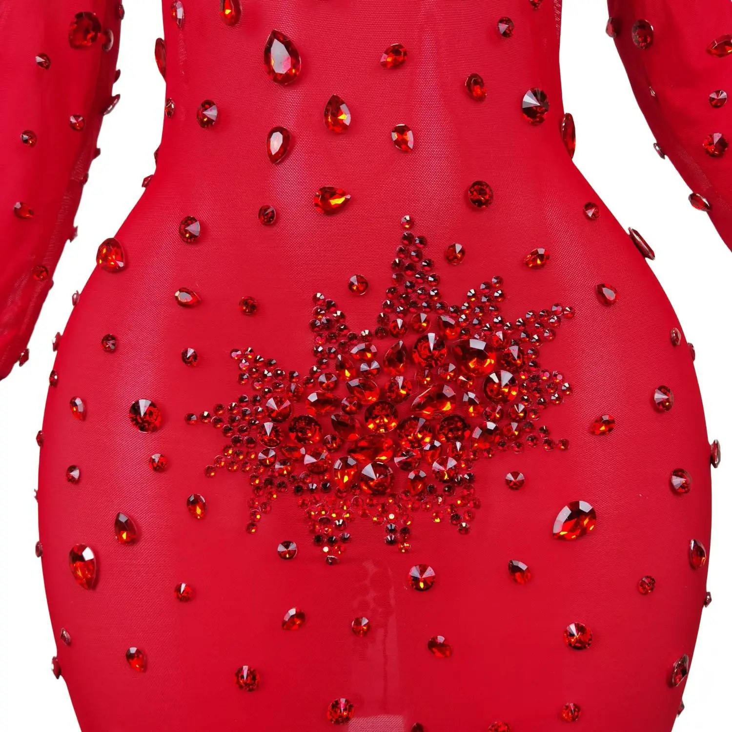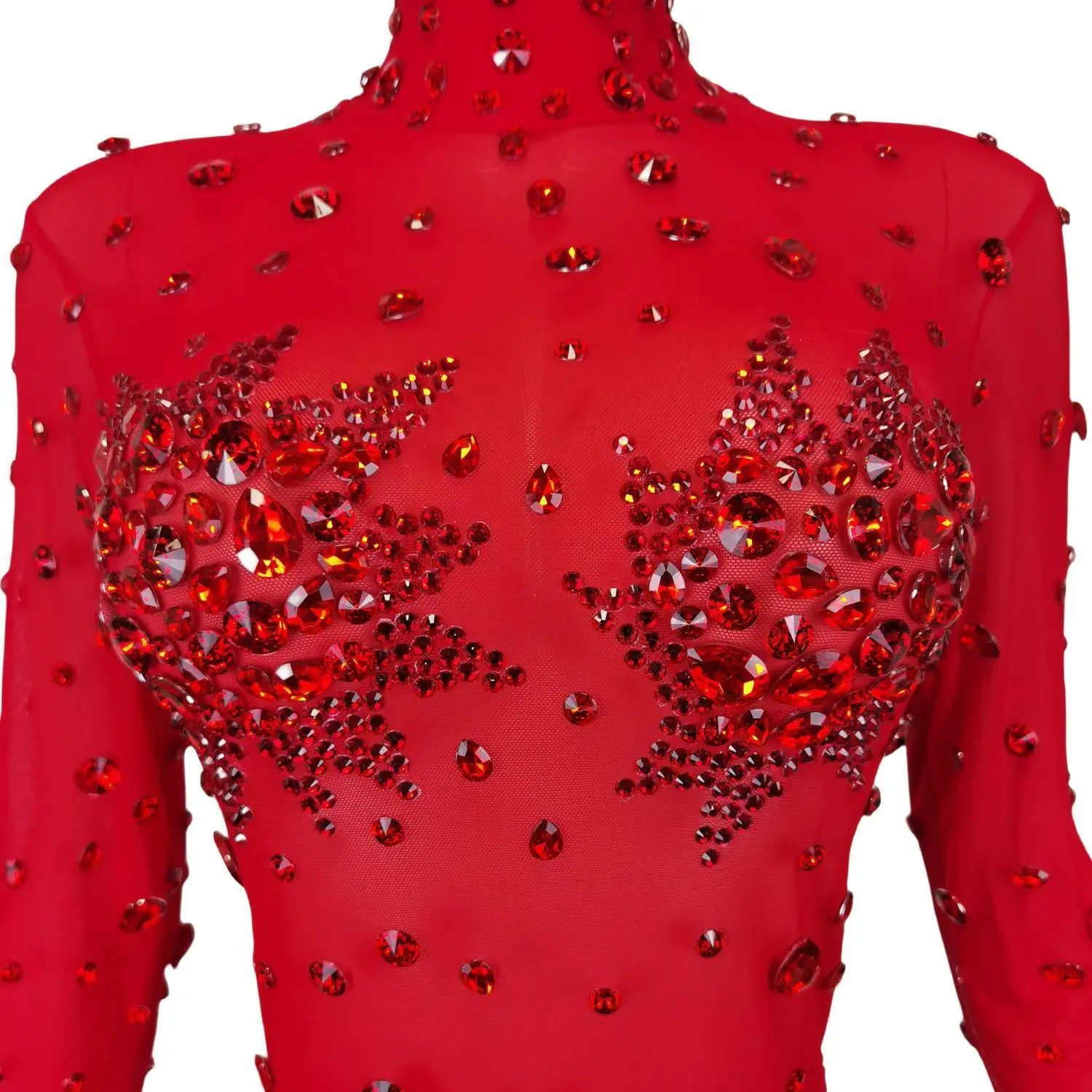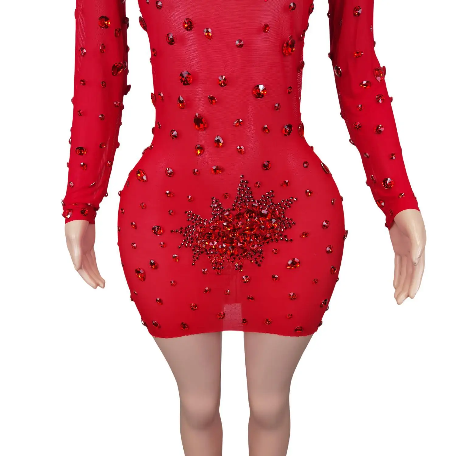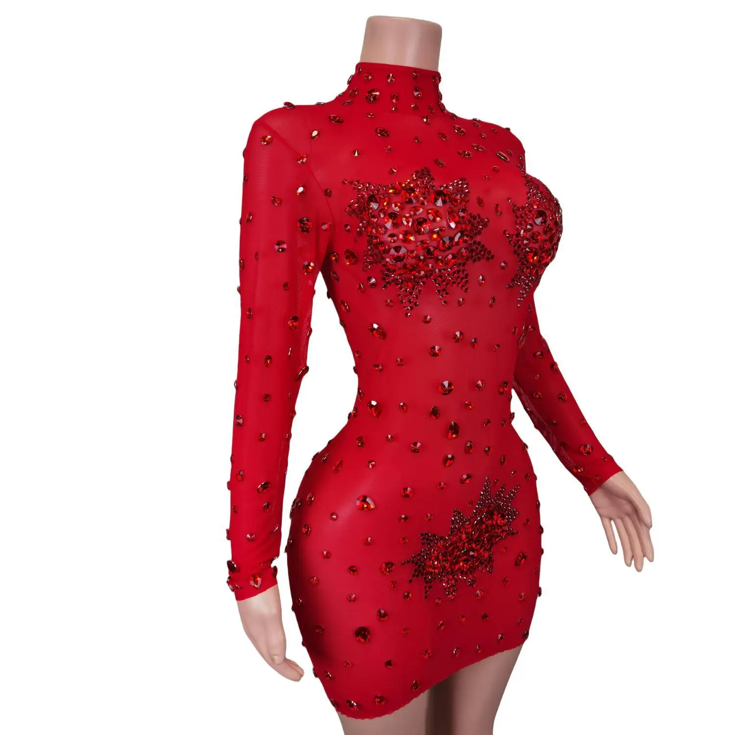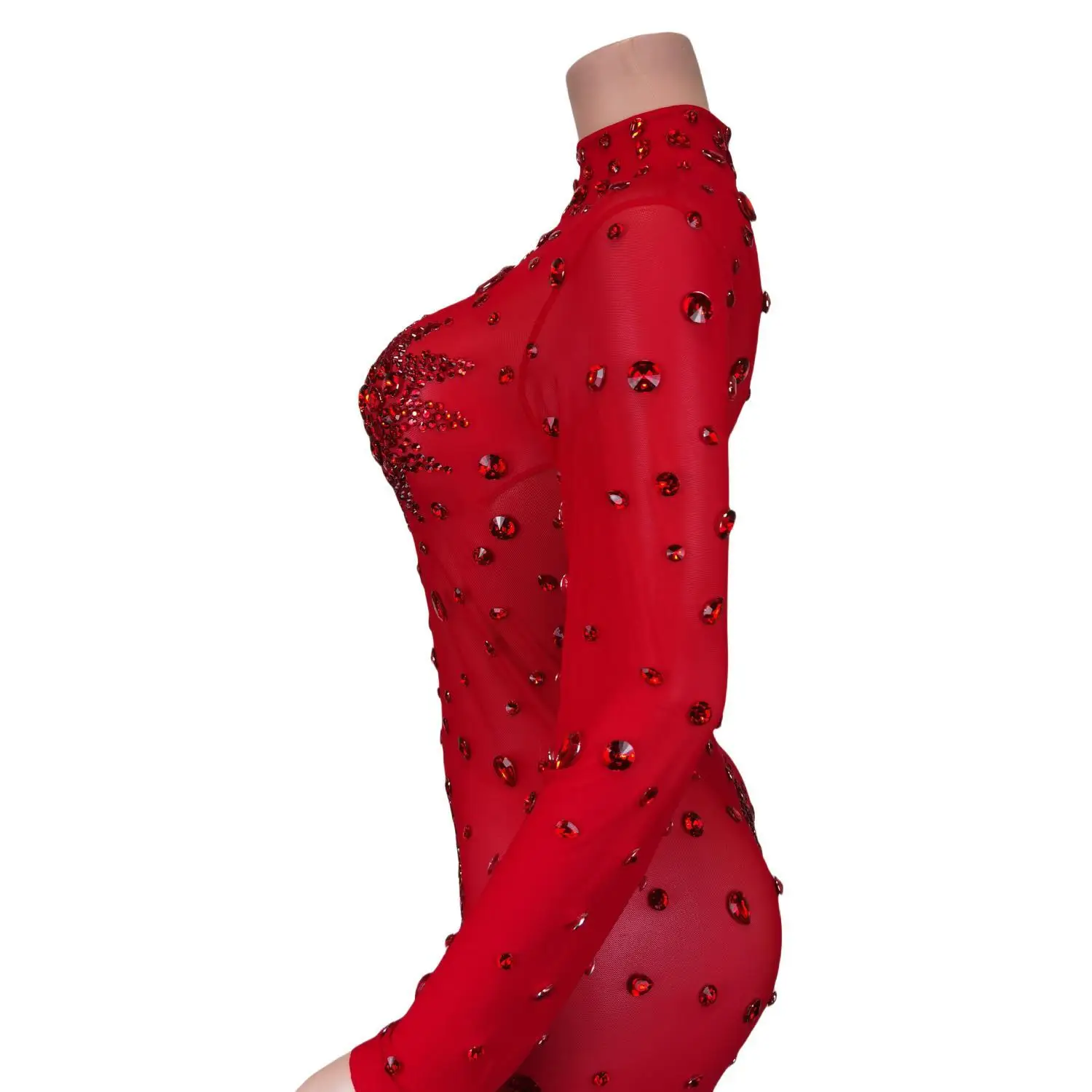 Sexy Stage Red Sparkly Rhinestones Long Sleeves Dress Birthday Celebrate Party Costume Dance Performance Dress Guibin