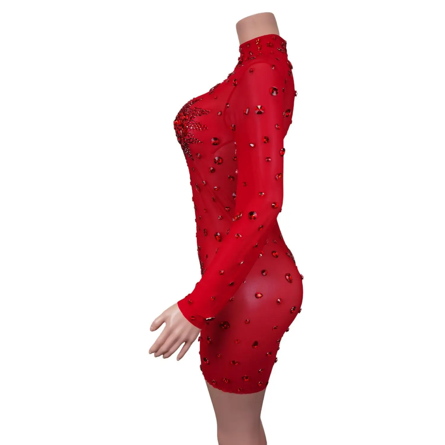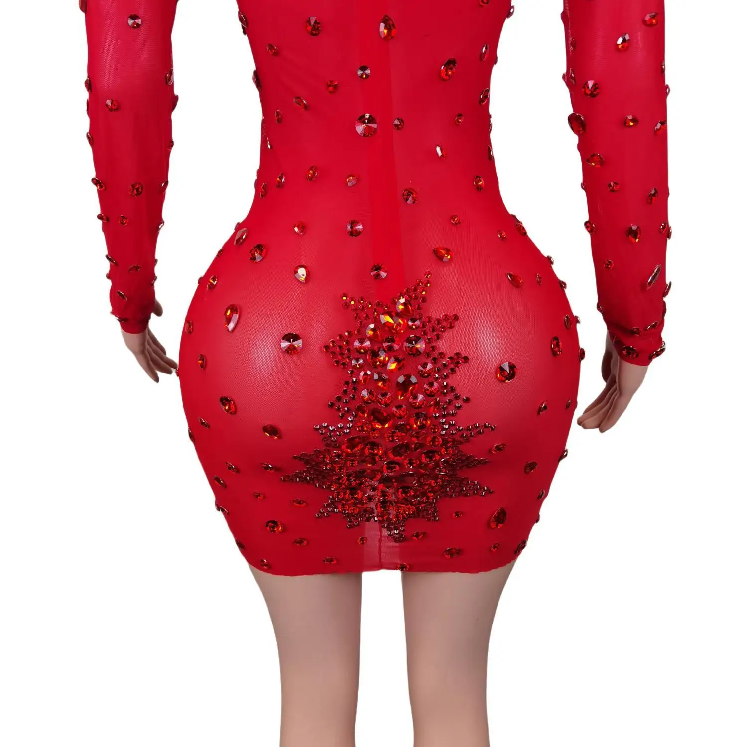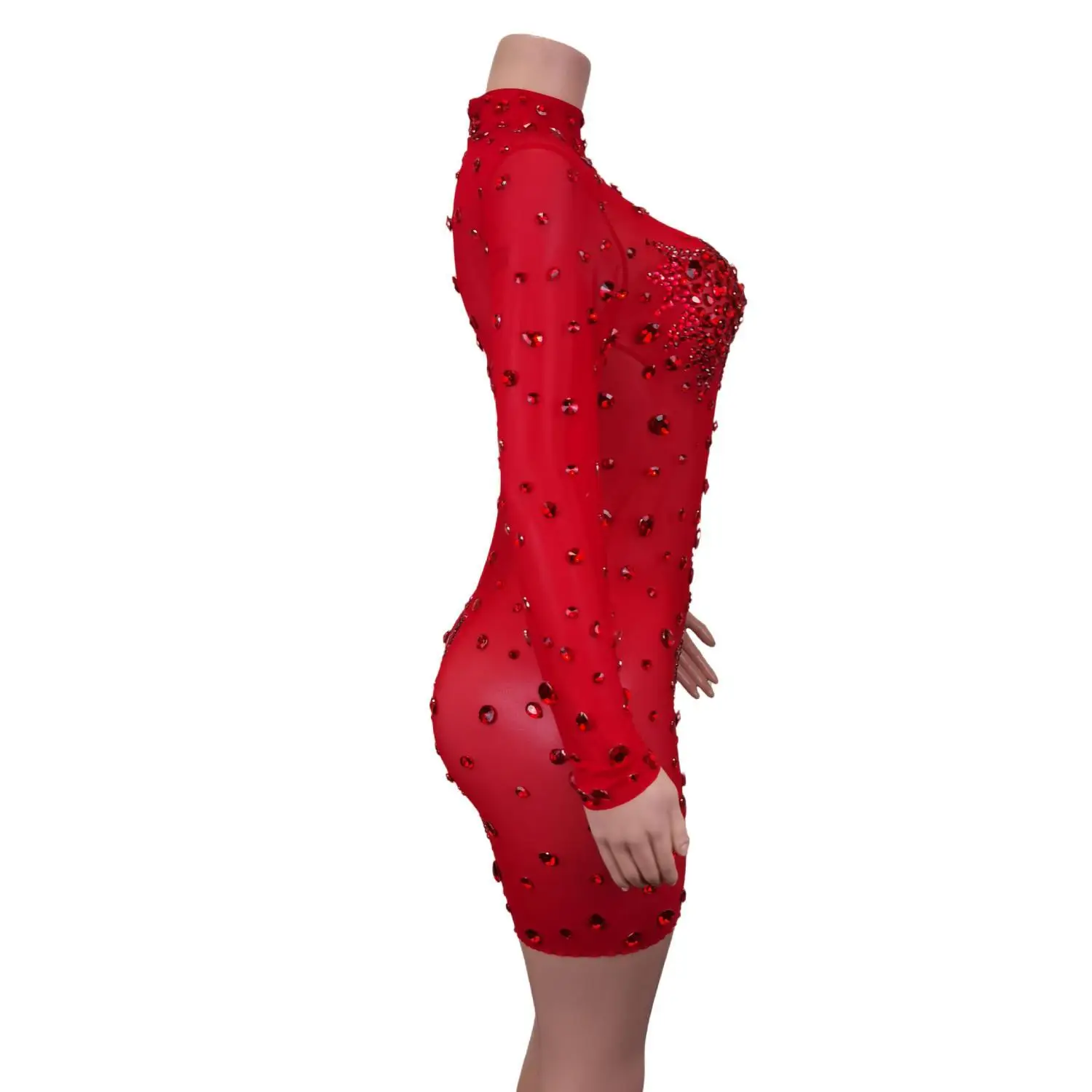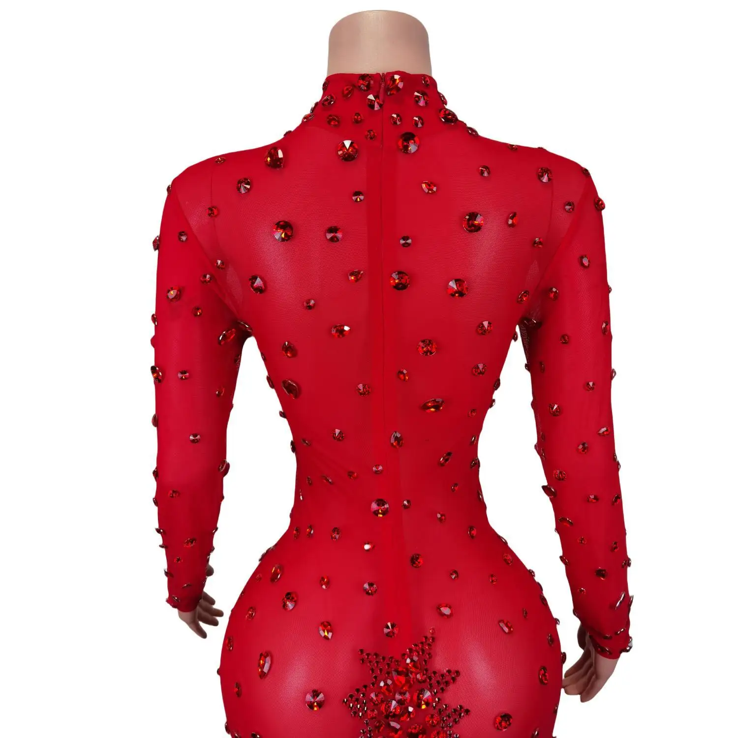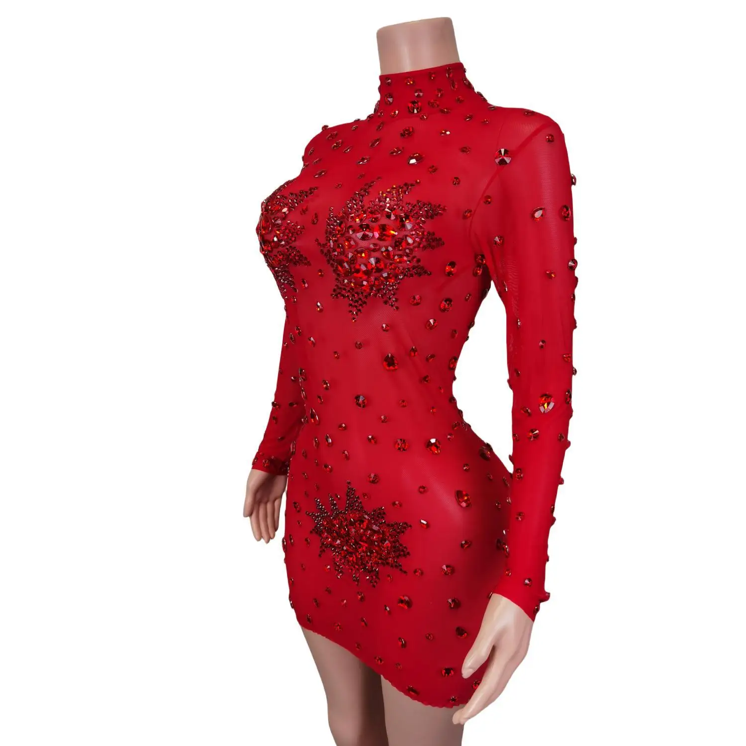 Sexy Stage Red Sparkly Rhinestones Long Sleeves Dress Birthday Celebrate Party Costume Dance Performance Dress Guibin