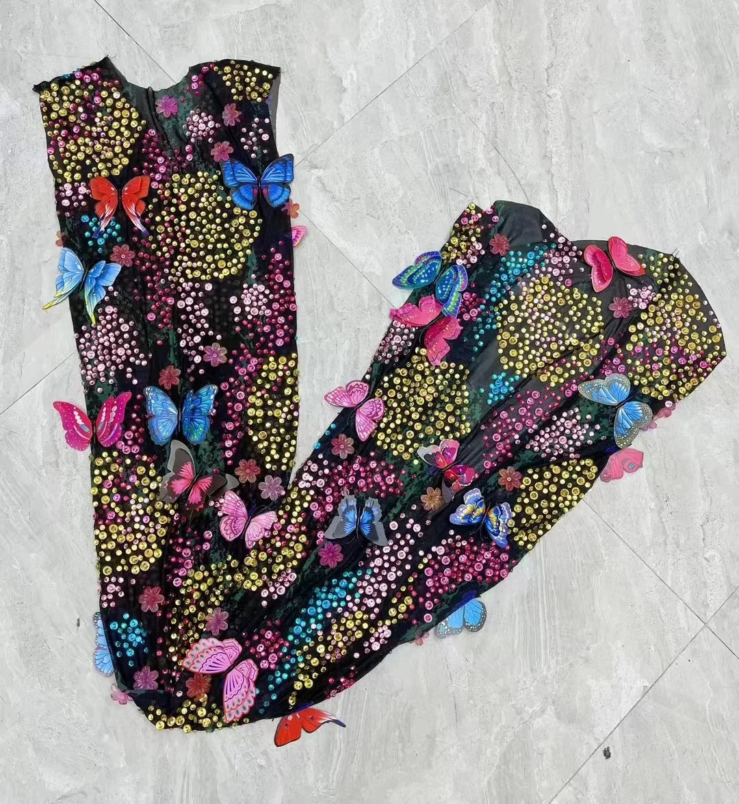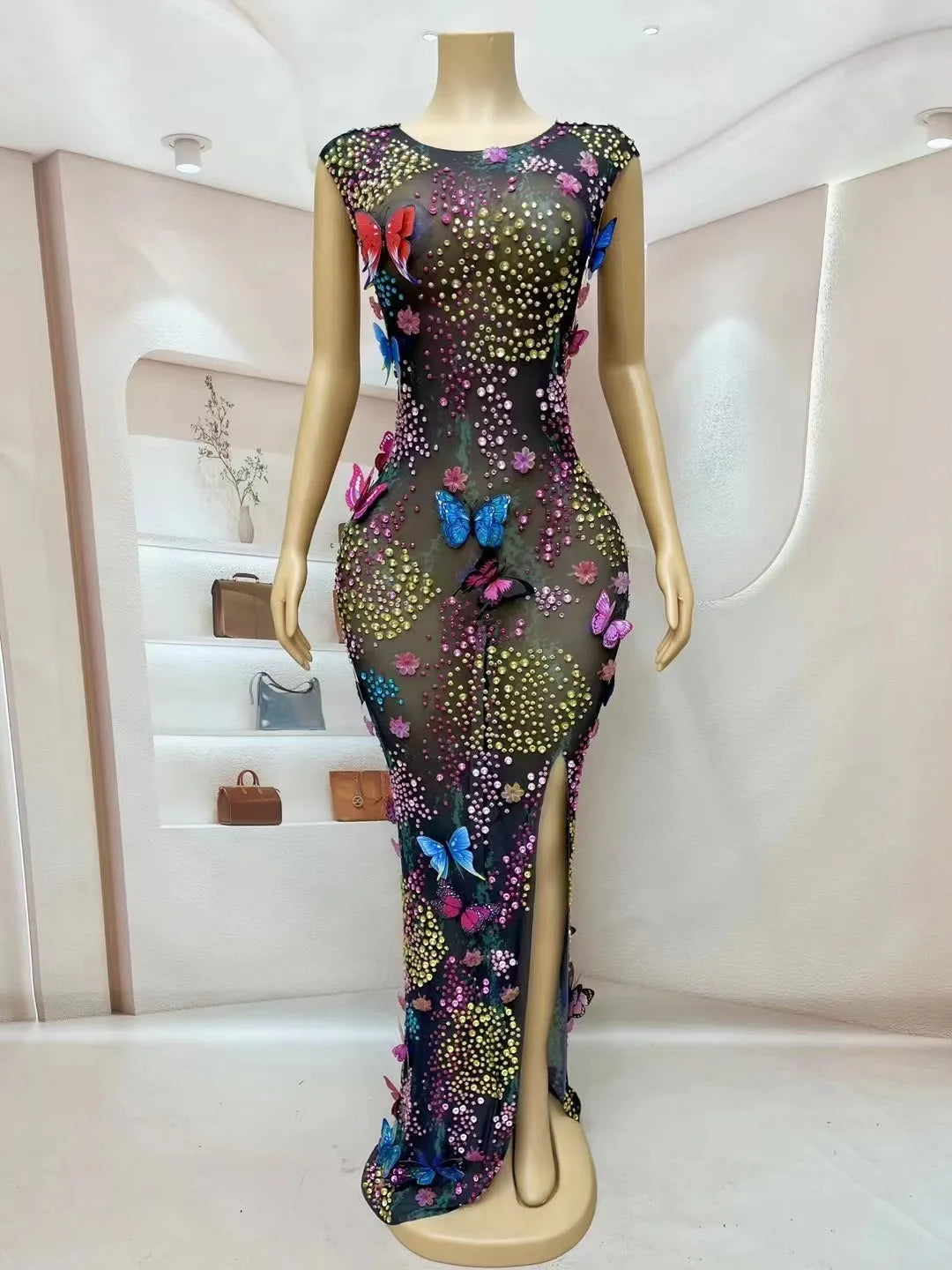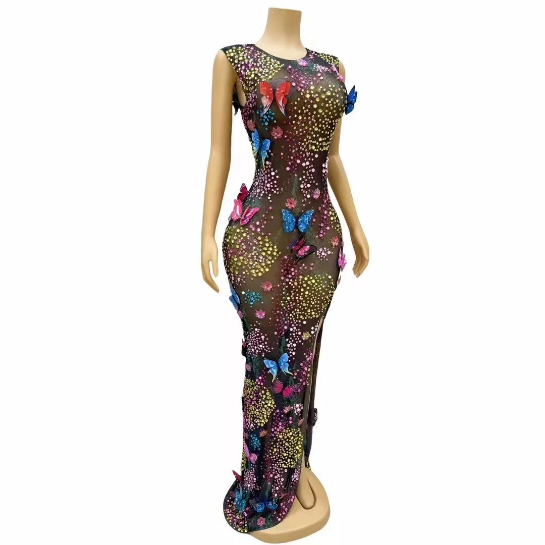 Step into the spotlight with the Sexy Stage Shining Colourful Rhinestones Butterflies Mesh Dress — a breathtaking gown designed to dazzle under red‑carpet lights, on stage, or in high‑glamour photoshoots. This statement piece blends delicate femininity with bold showmanship: sheer black or nude mesh forms the base while an array of colourful rhinestones and butterfly appliqués create a fluttering, jewel‑studded tapestry across the body.