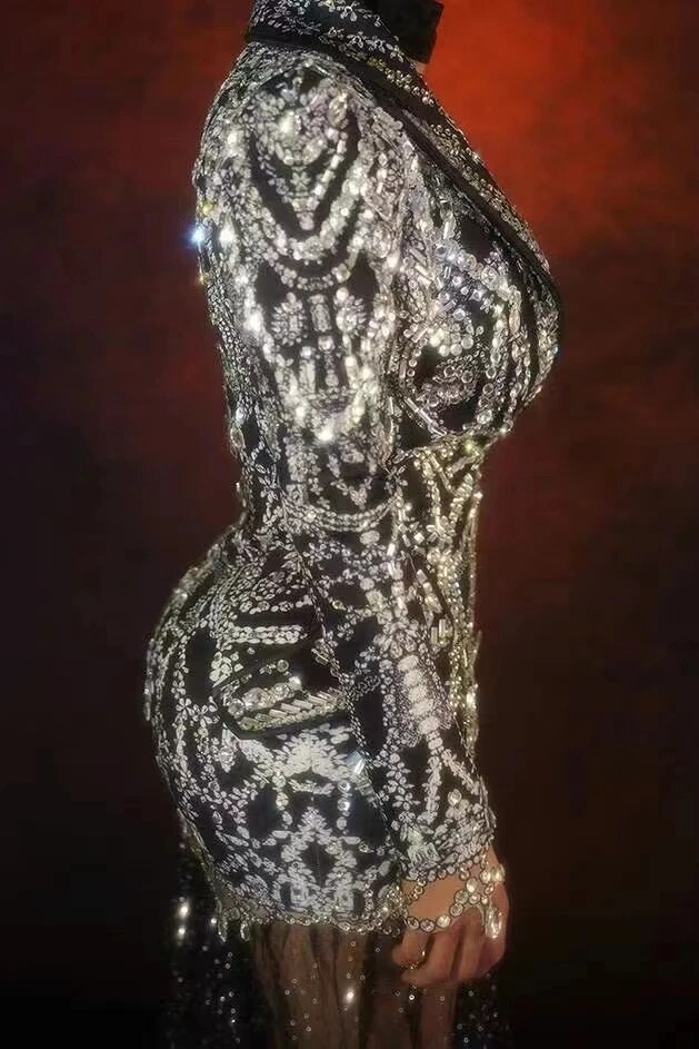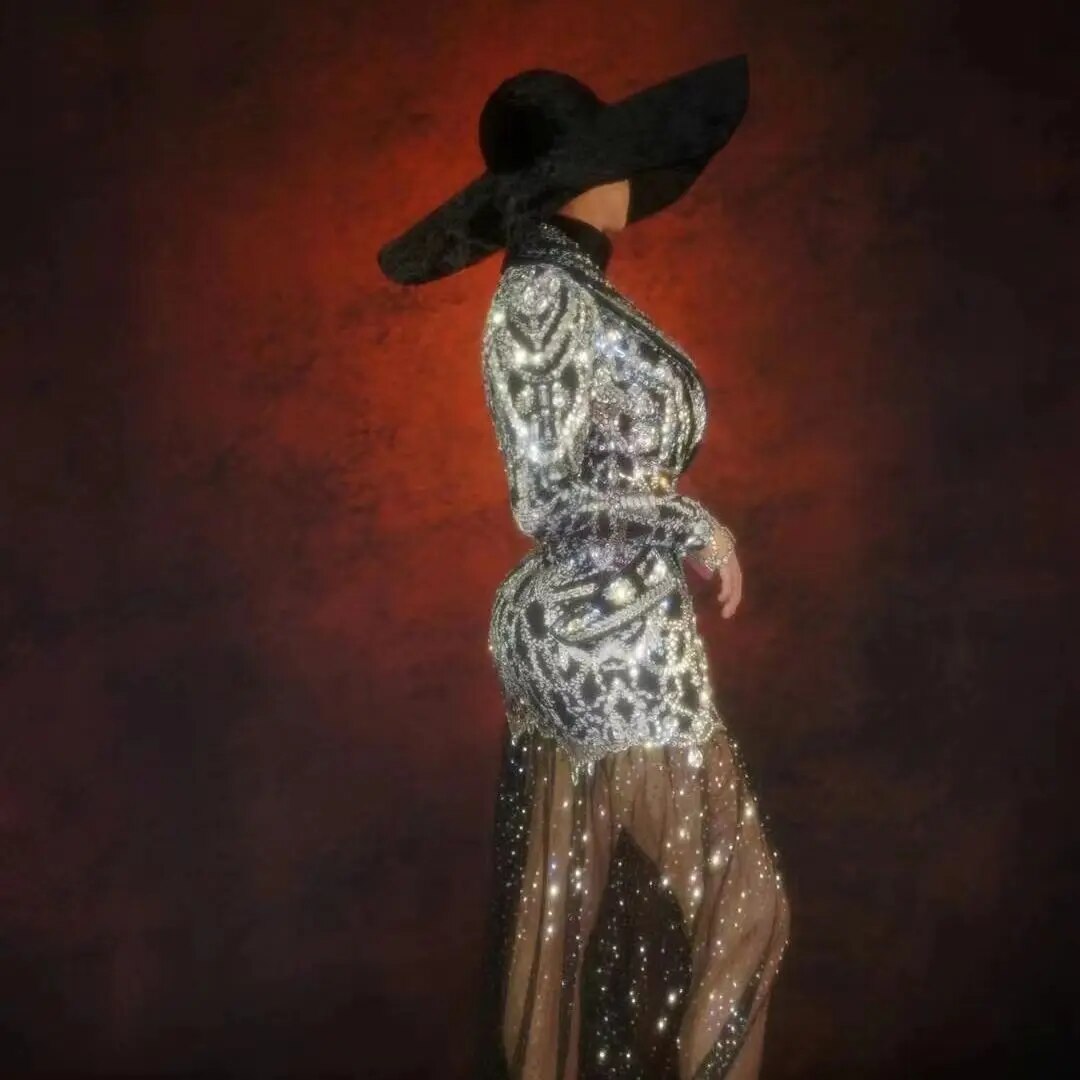 Sexy Stage Sparkling Wedding Party RhinestoneSuits With Mesh Tailing Women Deep V CrystaCoat Birthdav Clu Prom Costumes