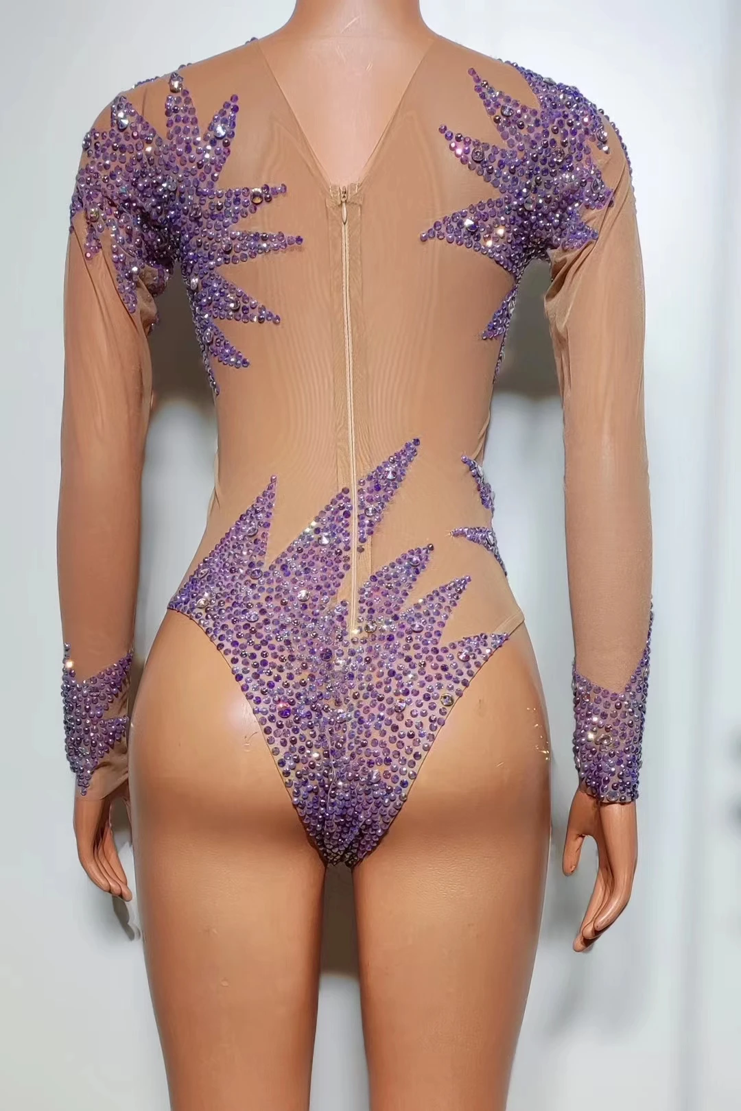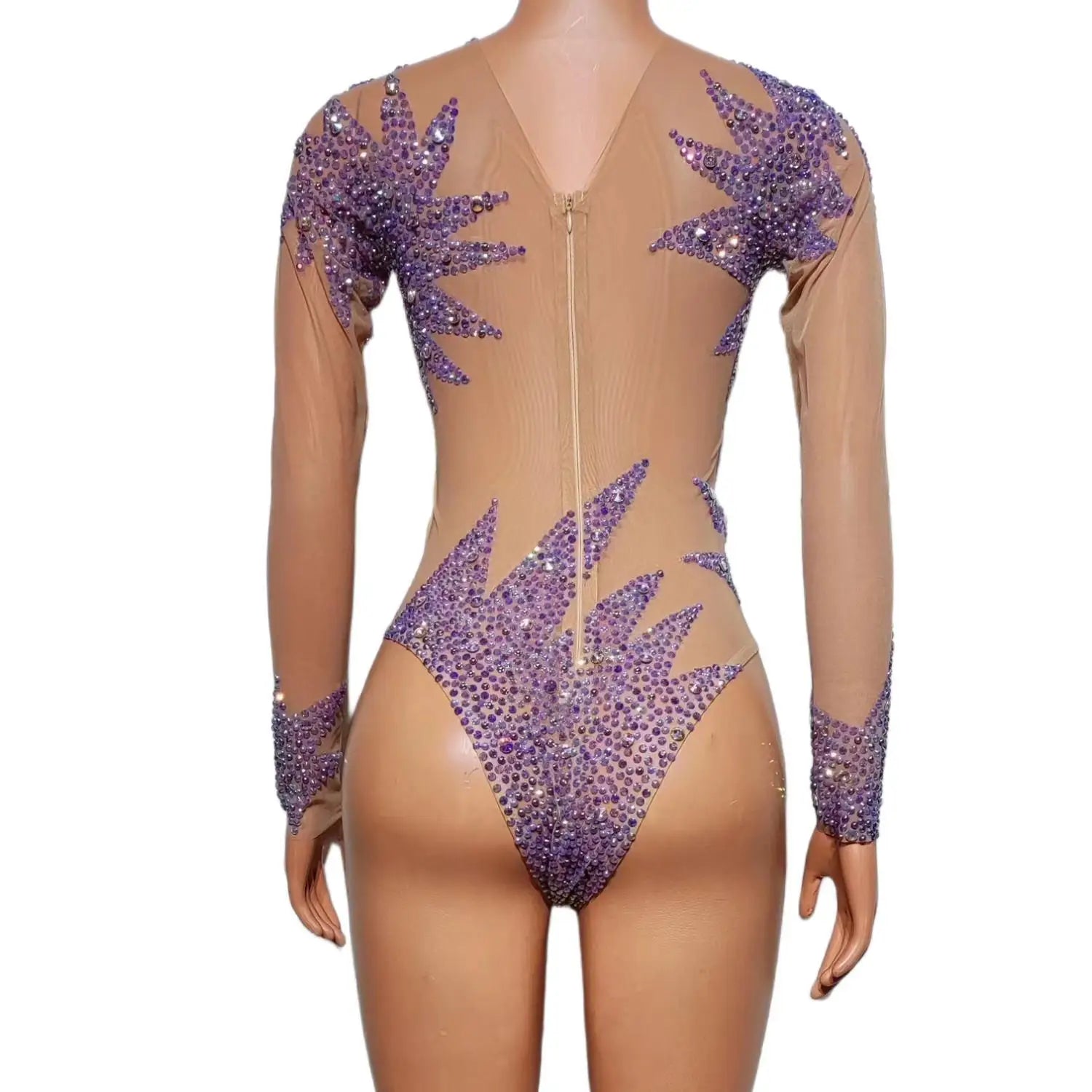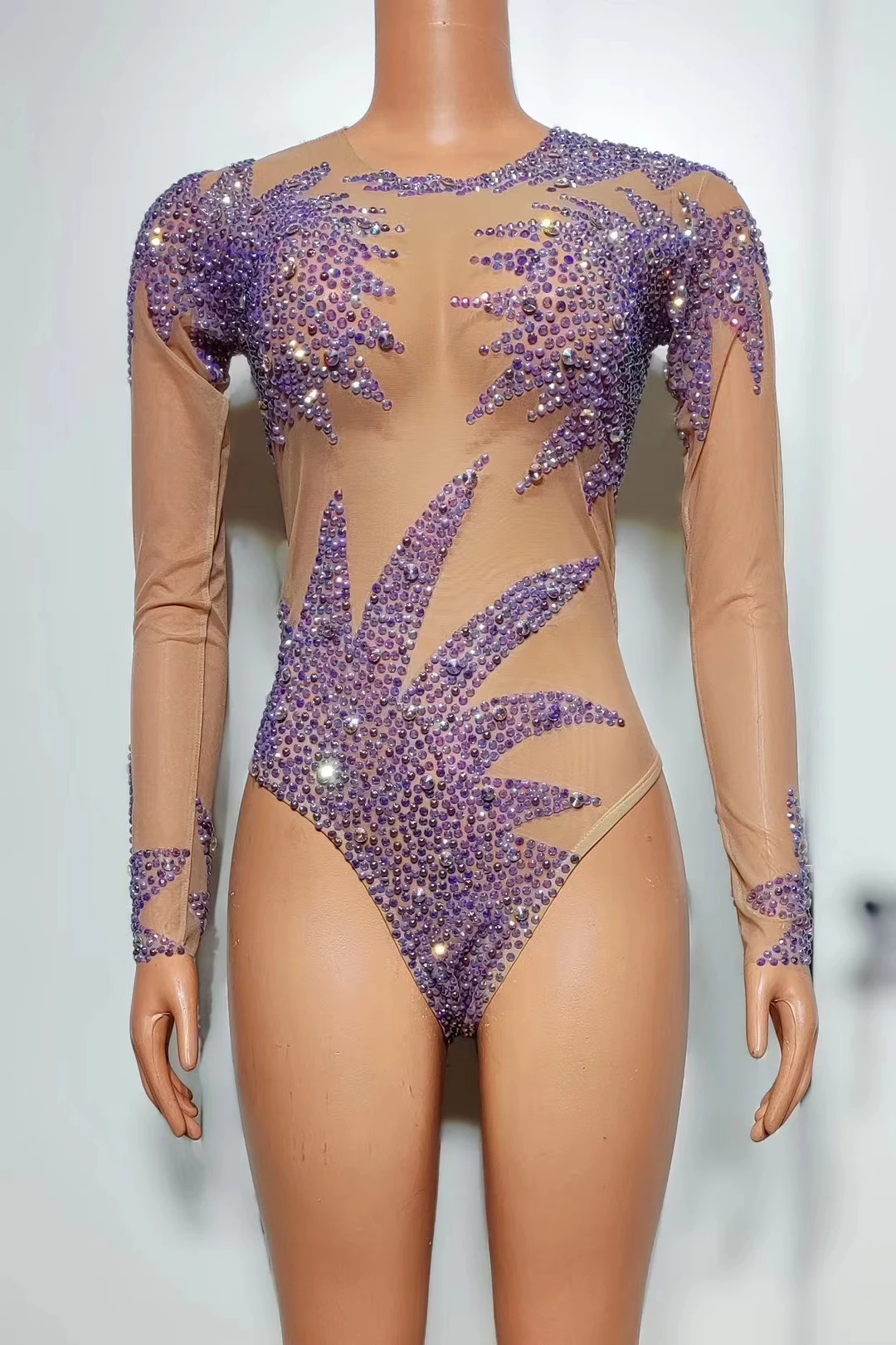 Sexy Stage Sparkly Purple Rhinestone Bodysuits for Women One Piece Stretch Sheer Long Sleeve Leotard Drag Queen Costume Ziluolan