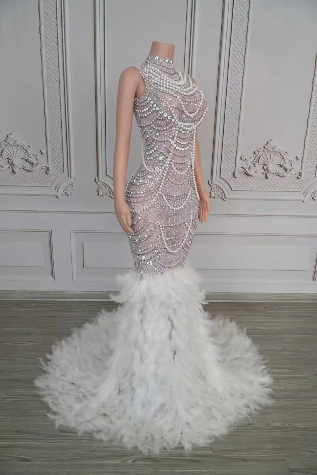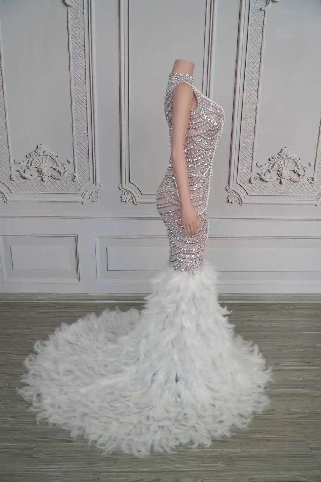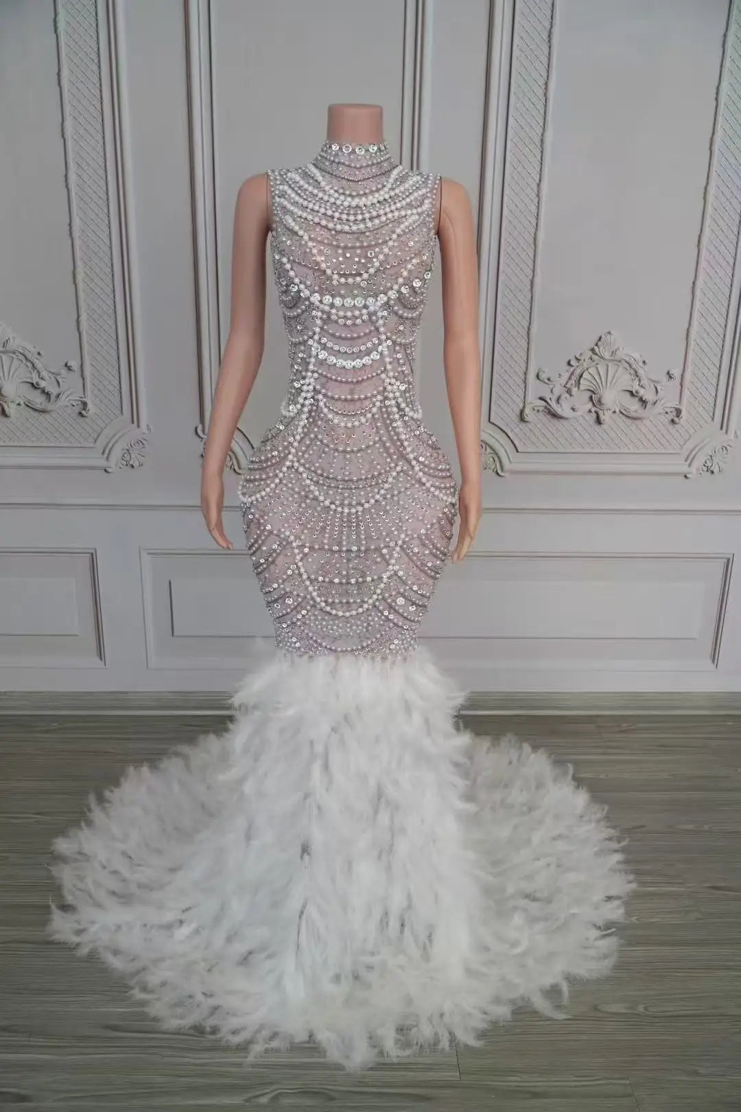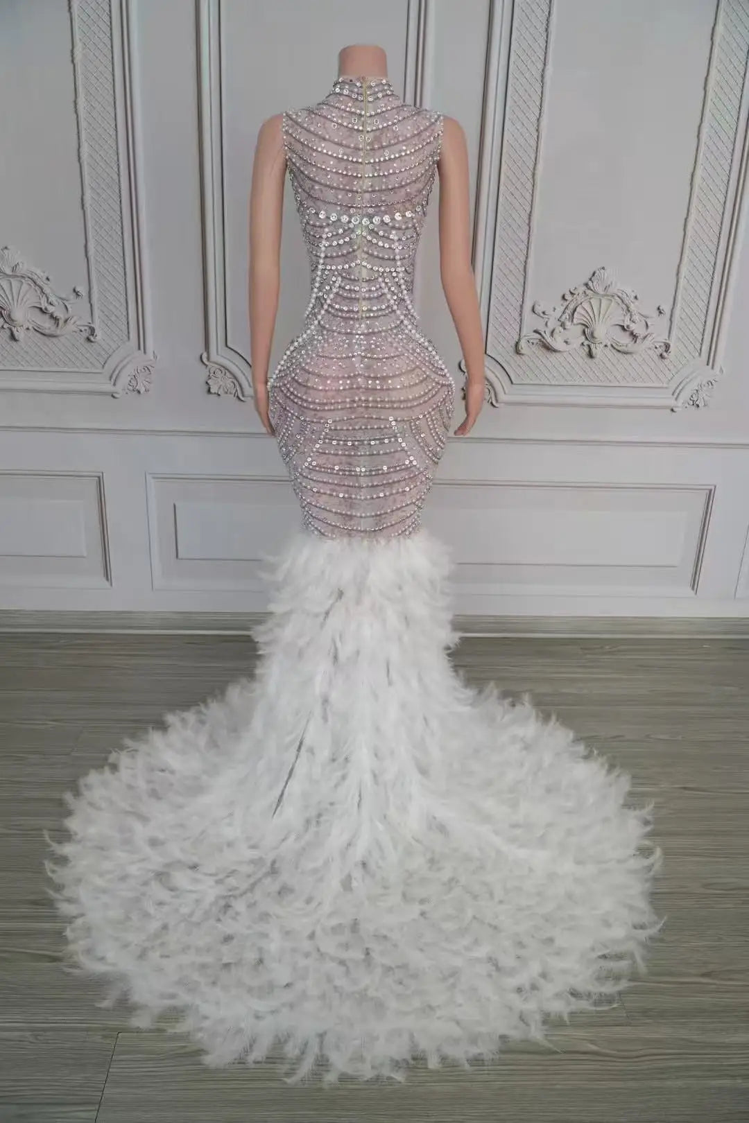 - Command the spotlight in our Sexy Sparkly Rhinestones Pearls Long Feathers Dress. This glamorous gown features dense rhinestone and pearl embellishments across the bodice and hips, a contoured silhouette that flatters the figure, and a voluminous feather hem that moves beautifully with every step. Fully lined with reinforced seams and a hidden zipper, it’s designed for comfort during long events and energetic performances. Ideal for birthdays, prom, weddings, red‑carpet moments, and photoshoots.