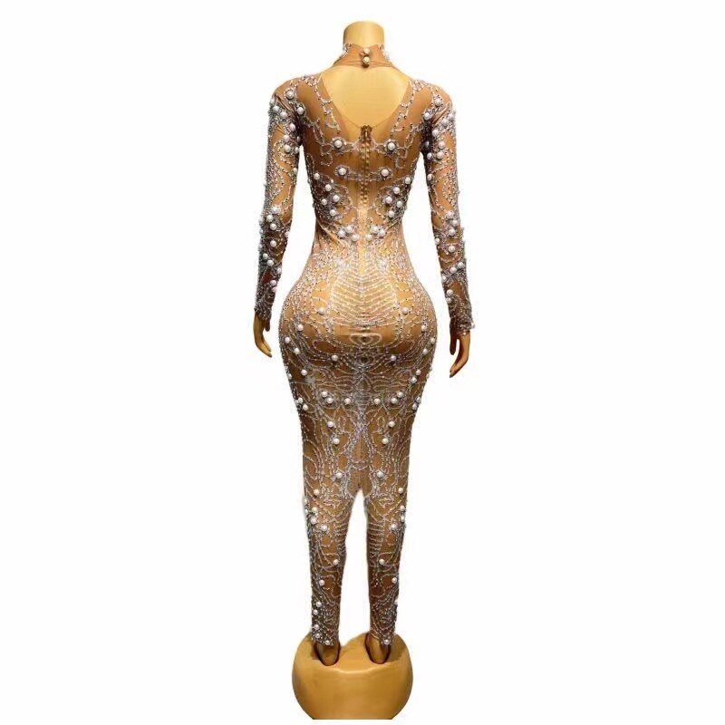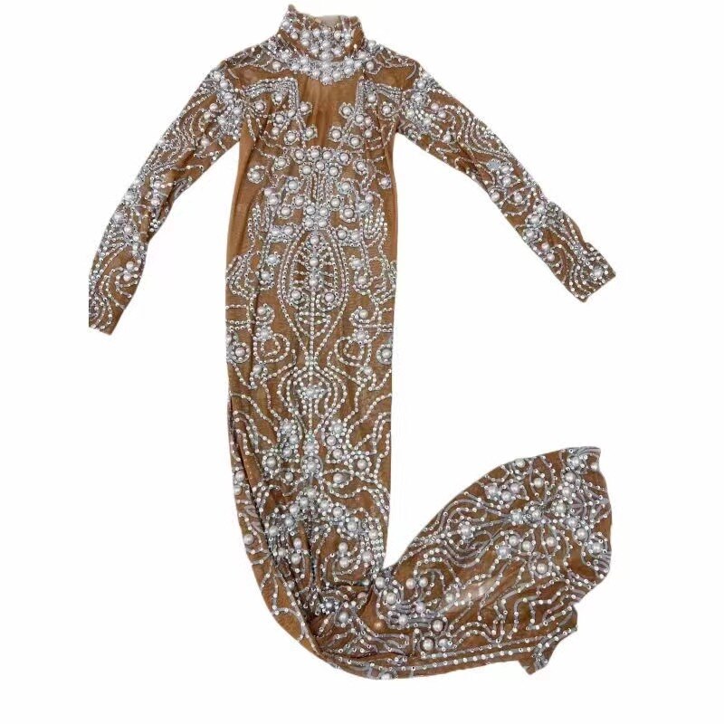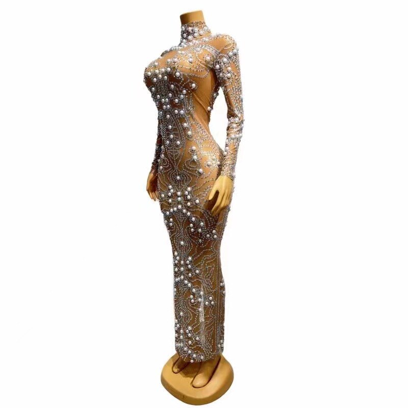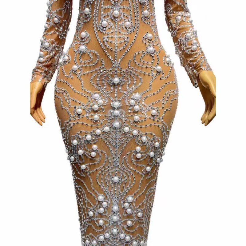 Sexy Stage Sparkly Silver Rhinstones Pearls Transparent Long Dress Evening Birthday Wedding Celebrate Costume Prom Party Dress