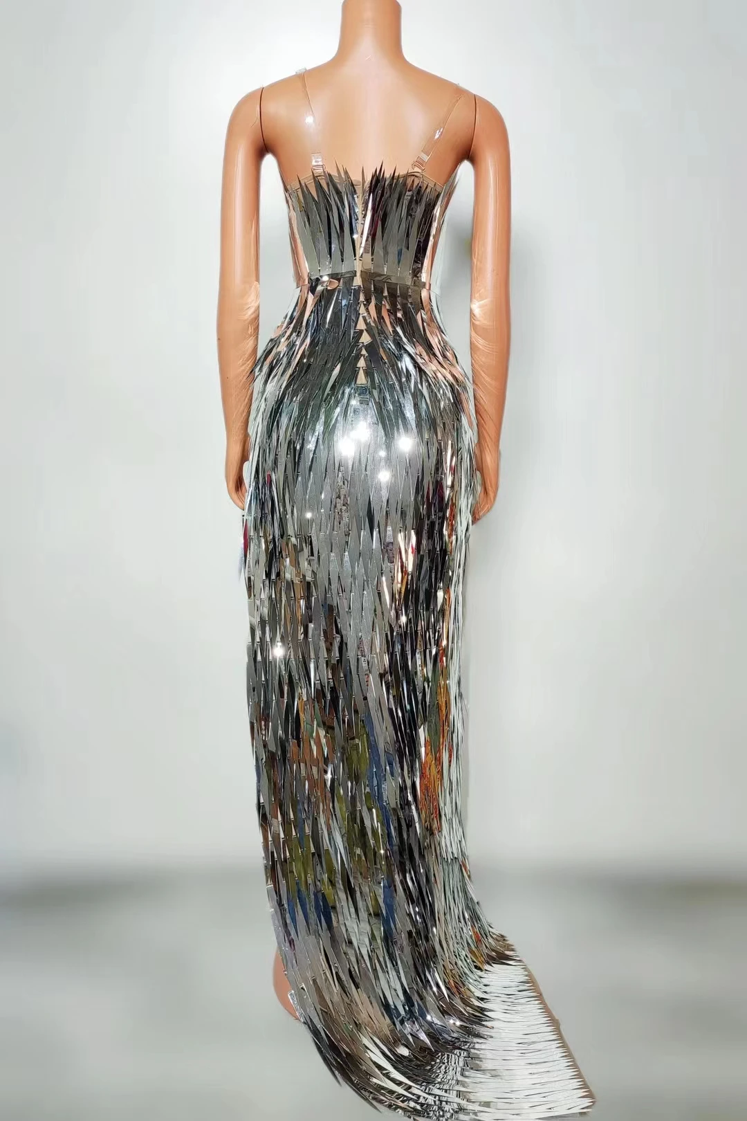Sexy Strapless Sliver Sequined High Slit Sheath Dress Evening Party Performance Costume Nightclub Singer Dancer Stage Maojian