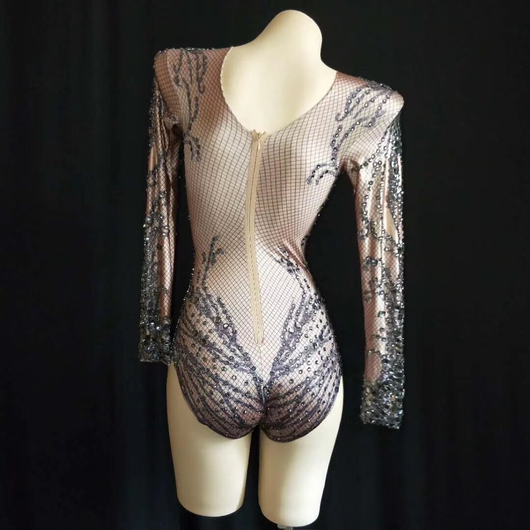 Sexy Stretch Spandex Rhinestone Bodysuit Female Nude Crystal Party Bodysuit Women Club Drag Queen Stage Leotard Dancer Outfits
