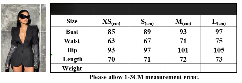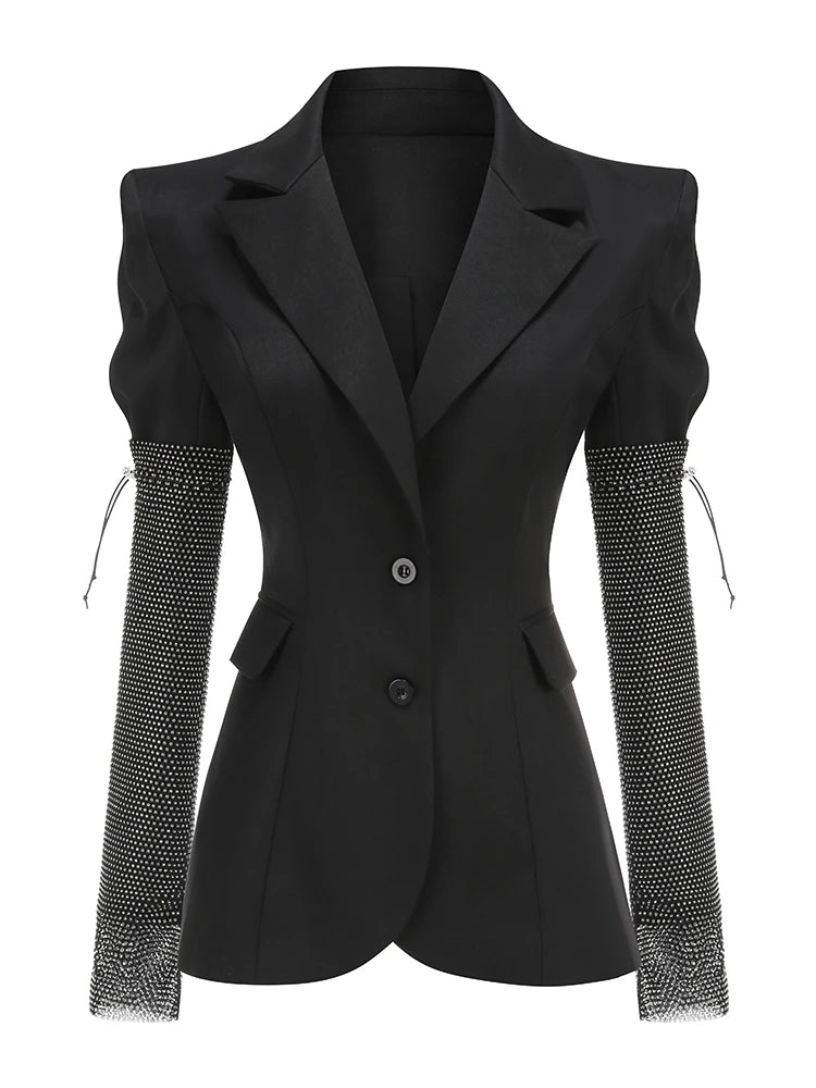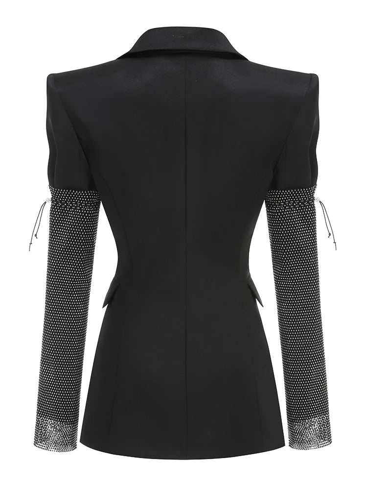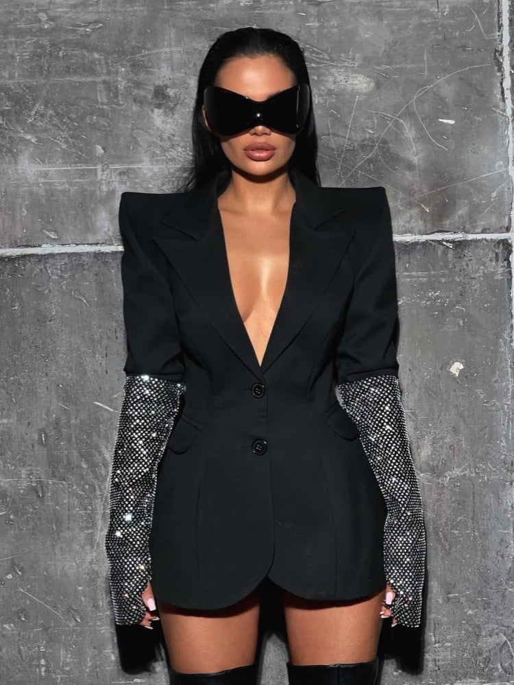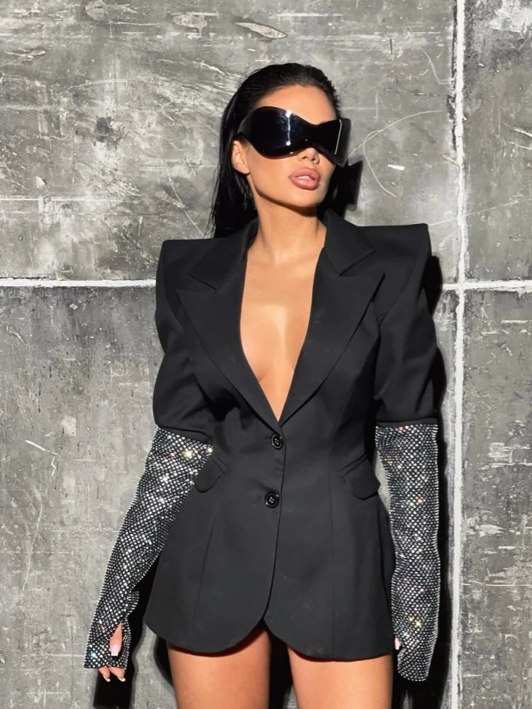Sexy V Neck Long Sleeve Blazer With Rhinestone Sleeve Women Black Diamond Patchwork Slim Jacket Evening Party Club Cocktail Coat