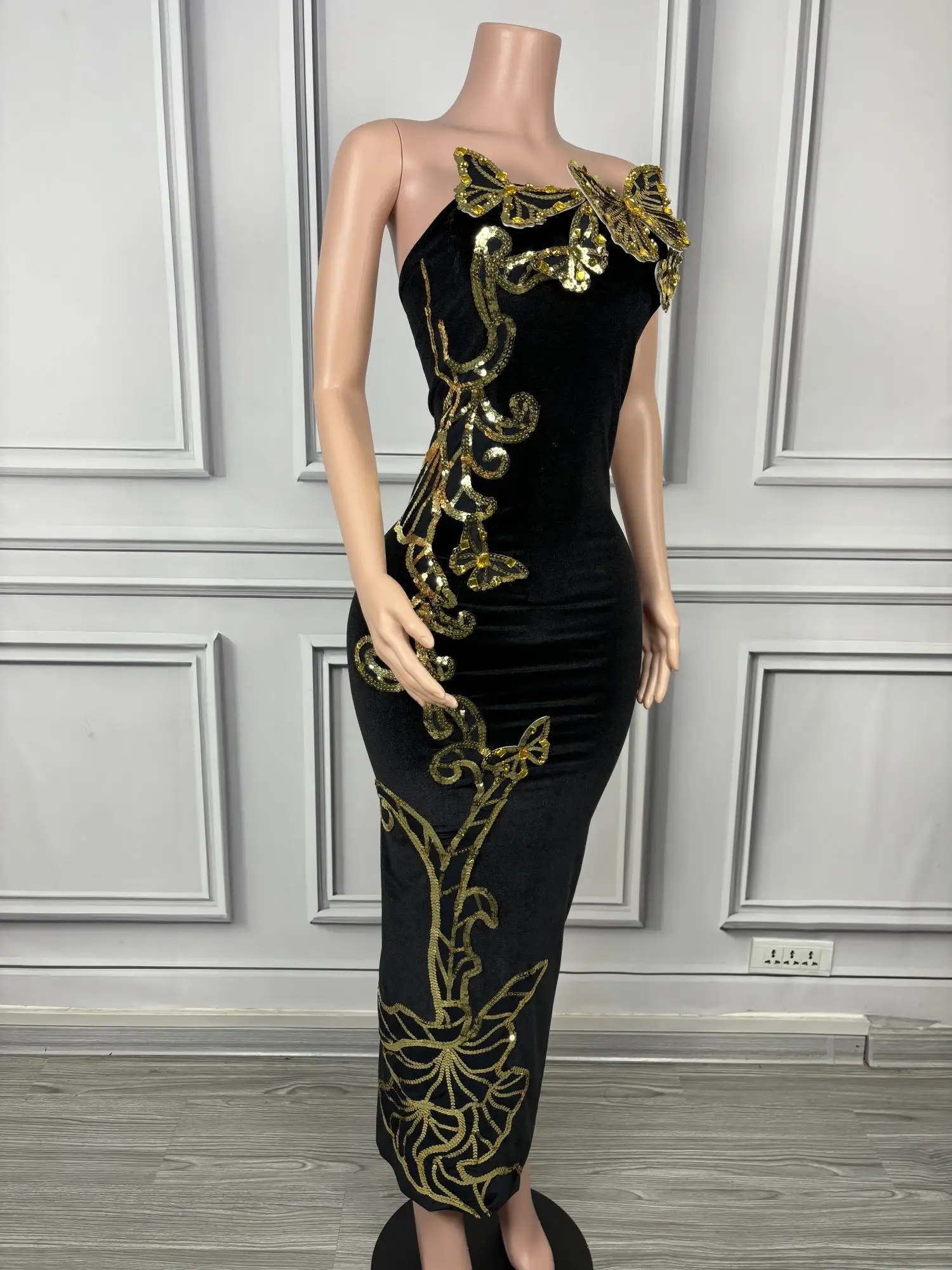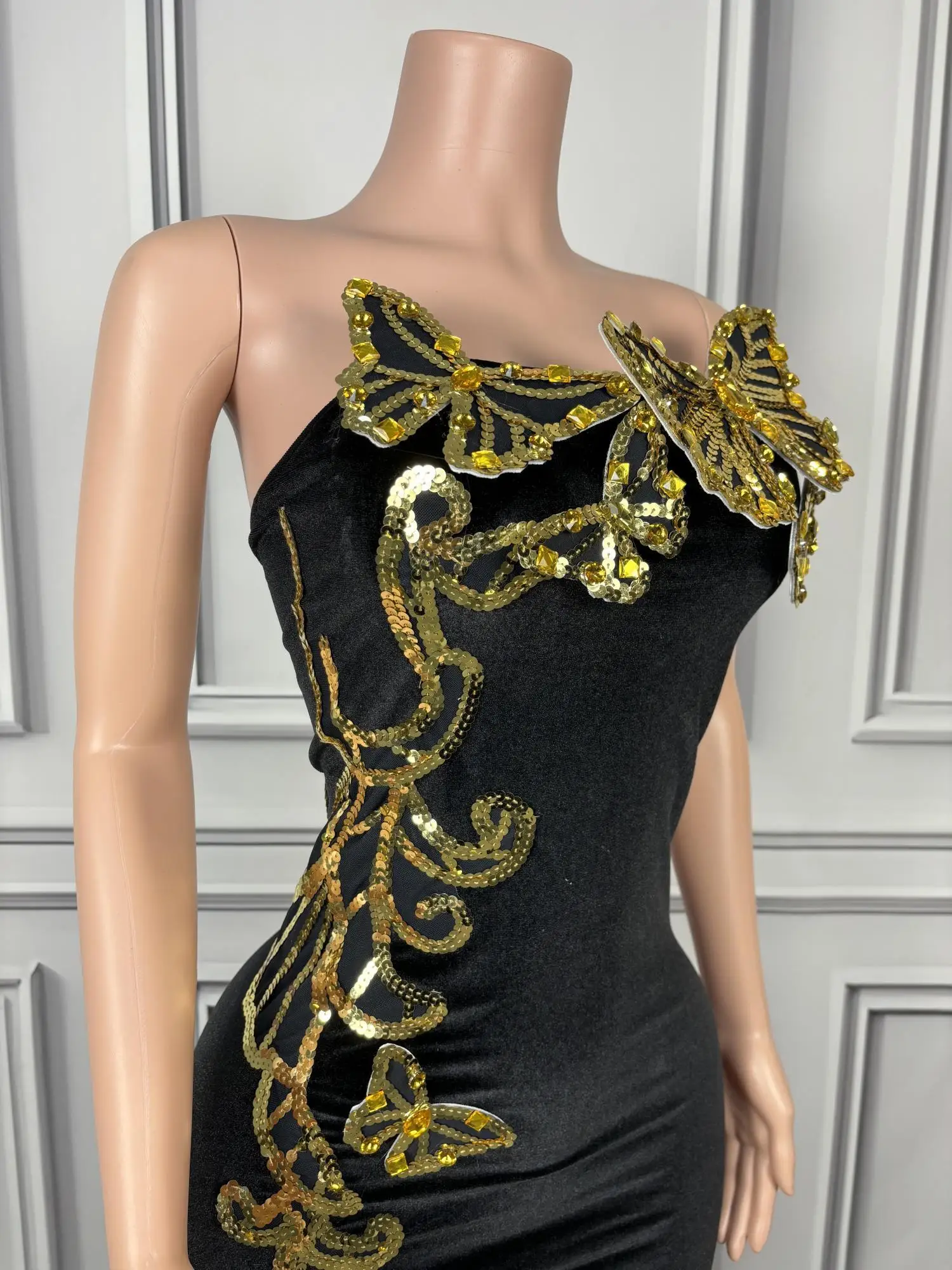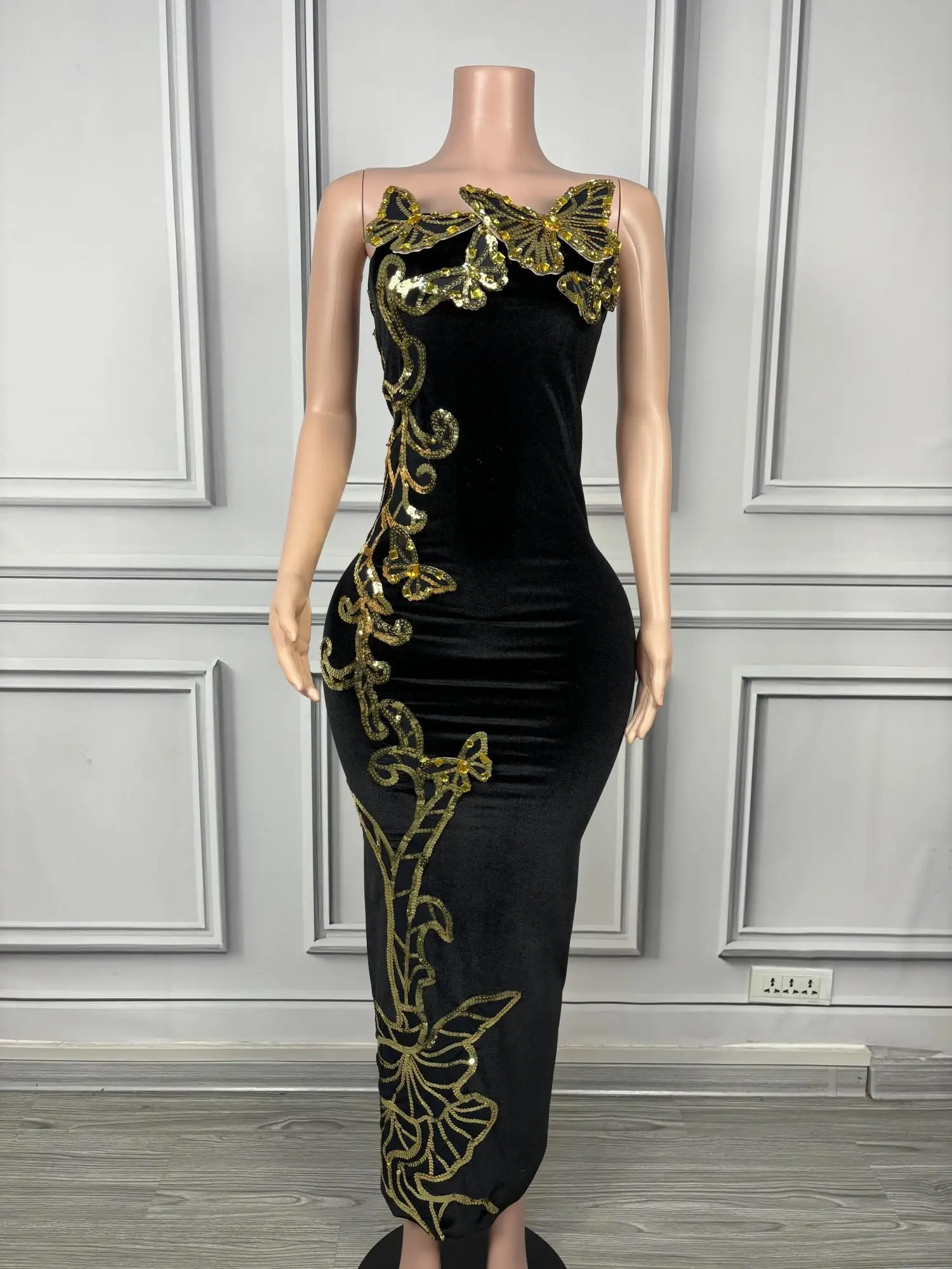 Sexy Velour Sheath Dress Sequine Butterfly Appliques Strapless Evening Party Dresses Nightclub Singer Stage Wear Sironghudie