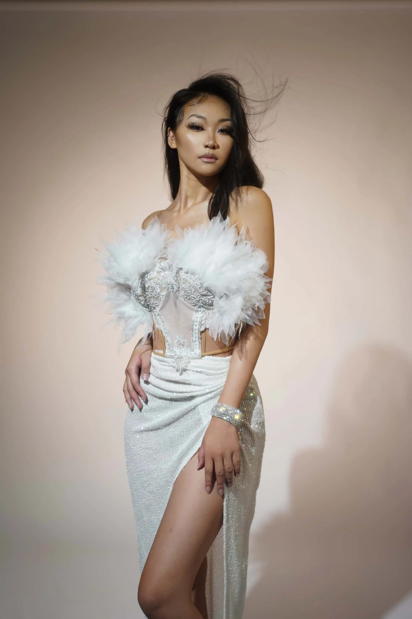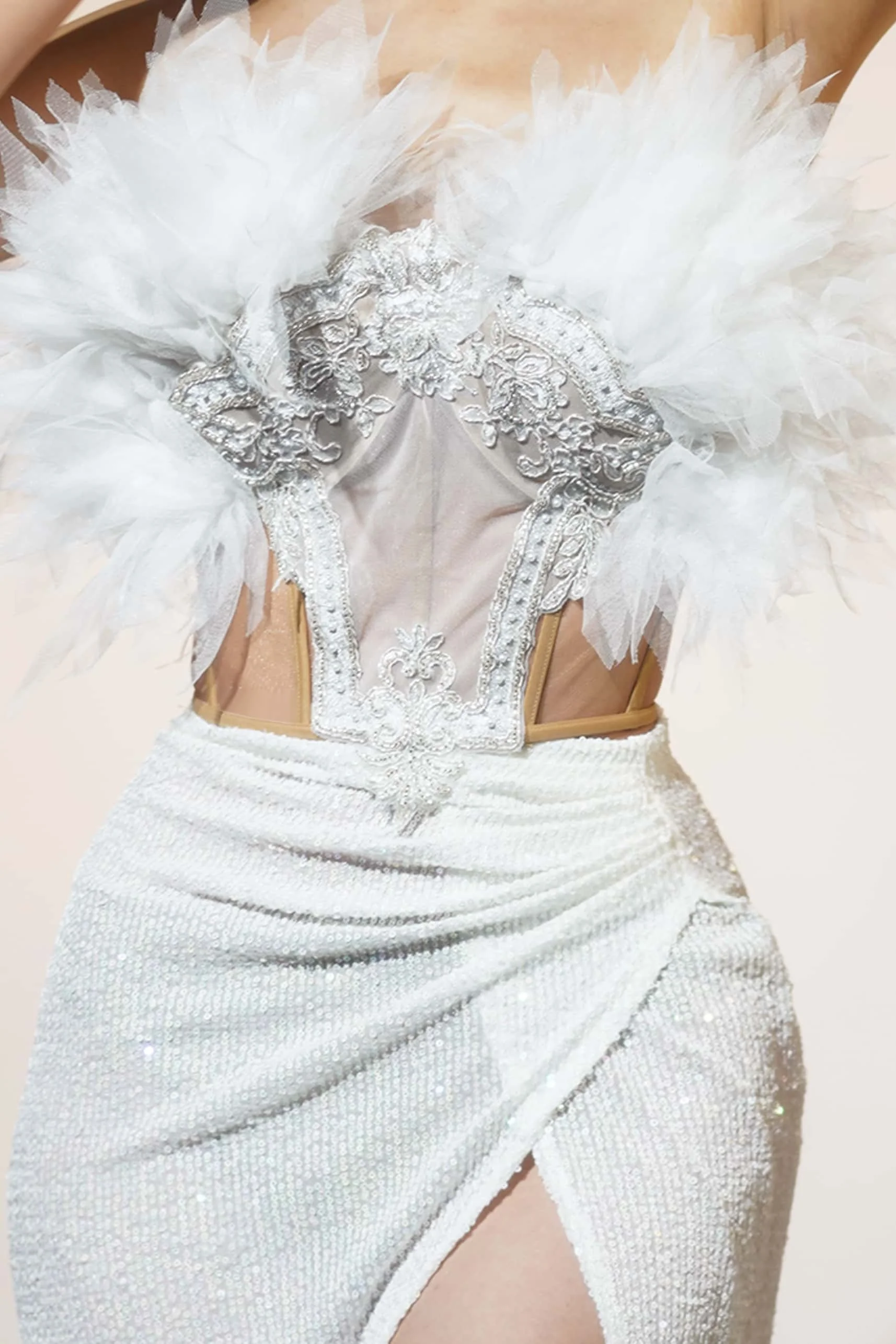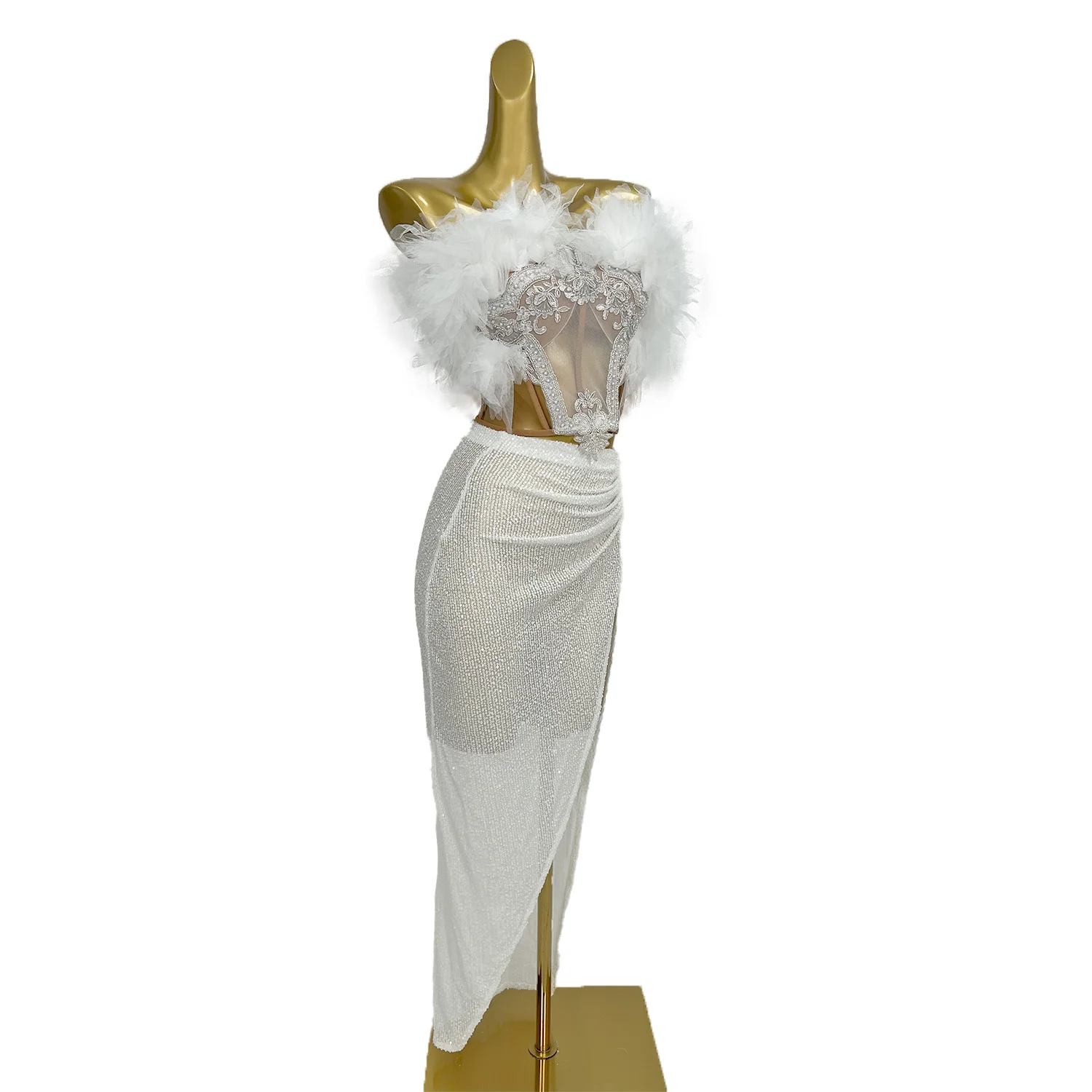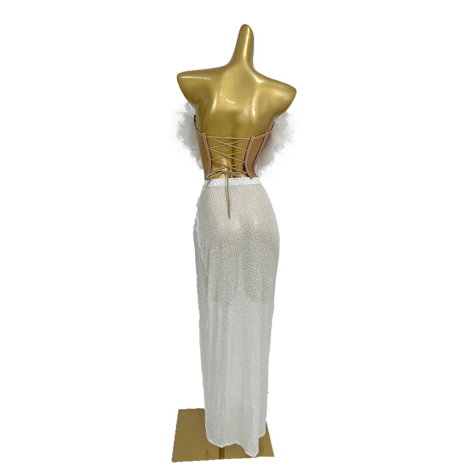 Sexy White Strapless Long Skirt 2PCS Set Lace Heavy Embroidery Tight Corset Sequin Irregular Skirt Holiday Party Dress Bailian