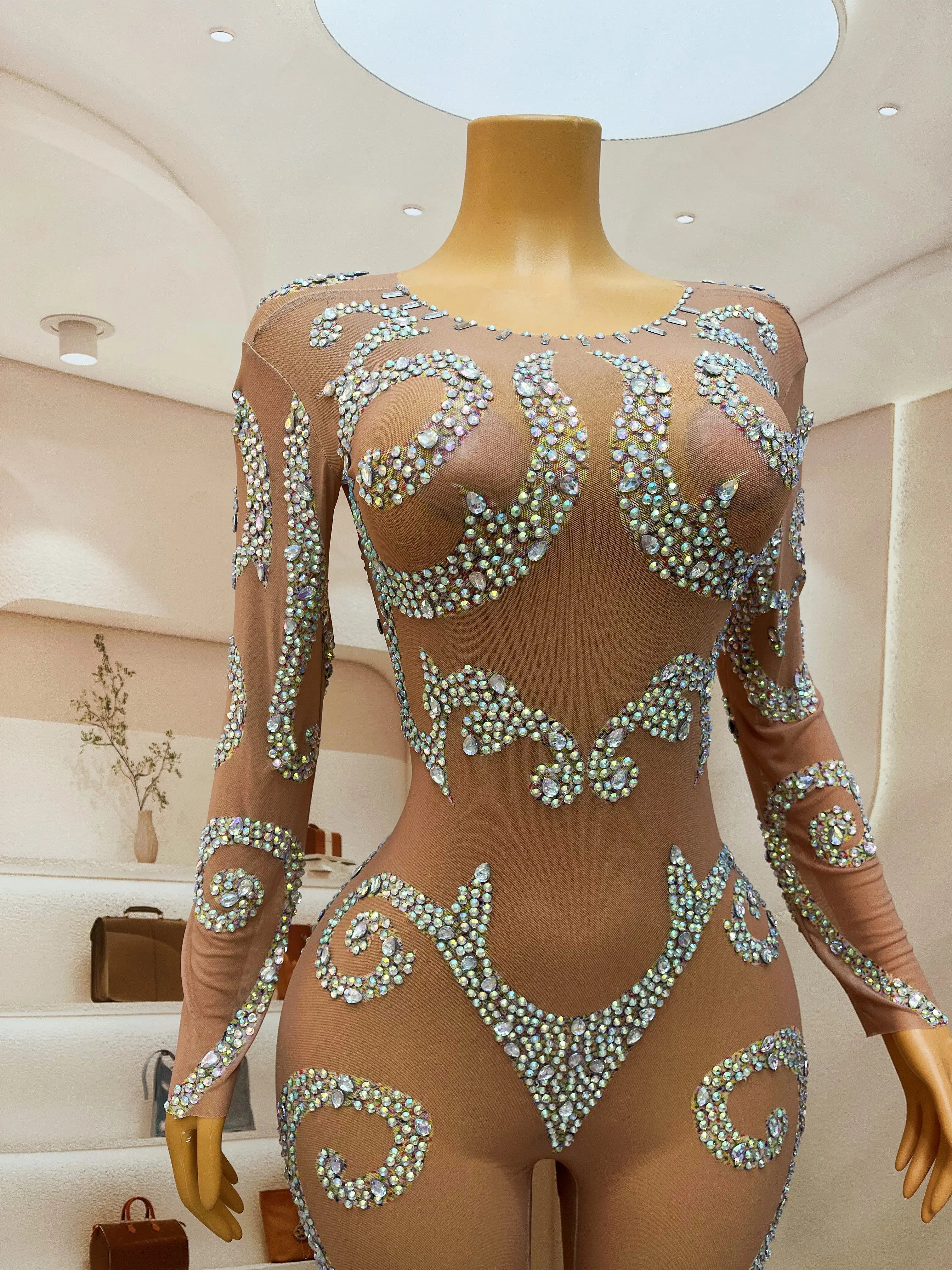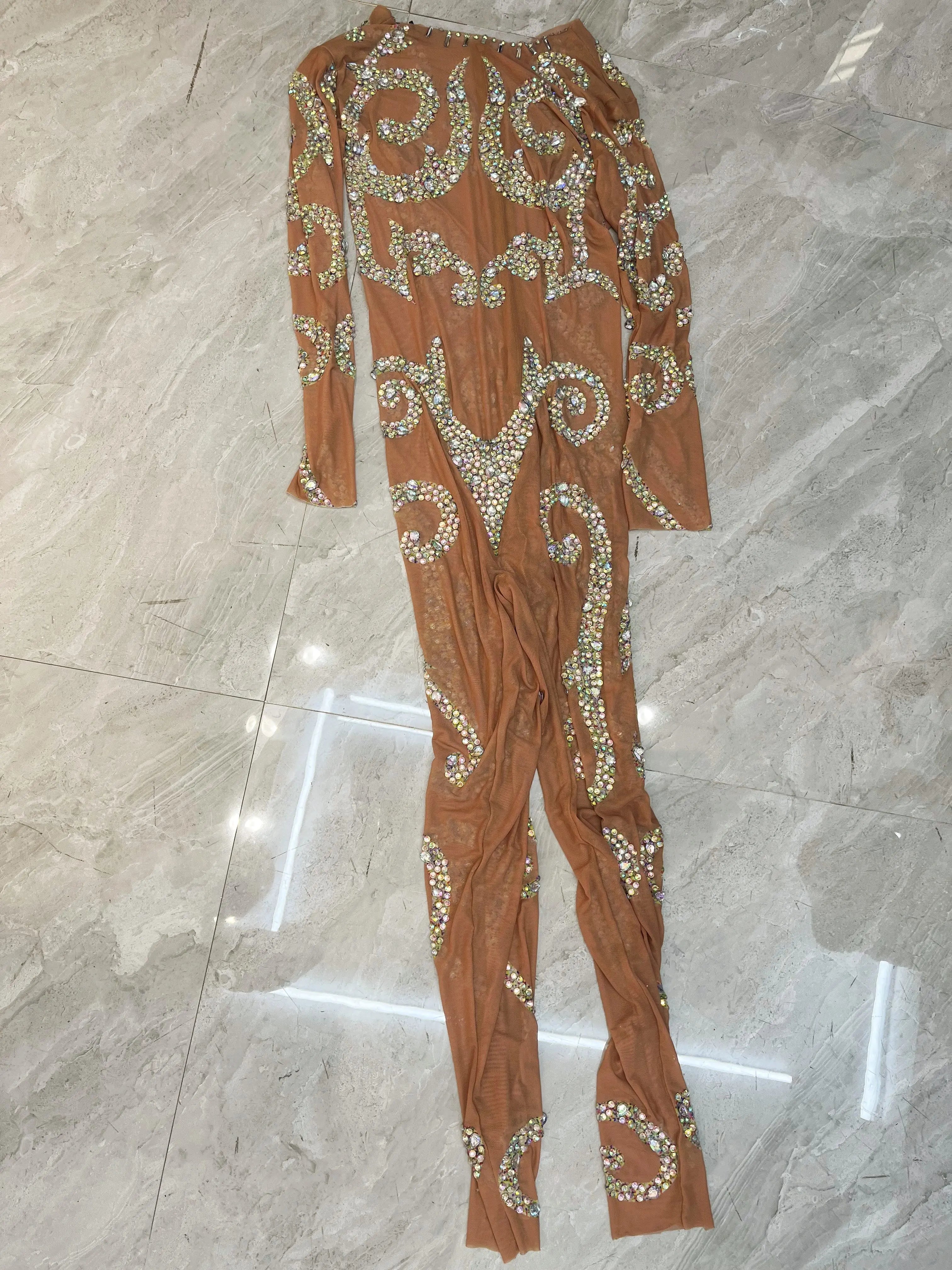 This stunning jumpsuit features AB color rhinestones that shimmer and shine, creating a captivating look. The nude transparent design and sexy bodysuit style make it an ideal outfit for dancers, singers, and performers. Perfect for birthday performances and stage costumes, this jumpsuit is sure to make a statement.??