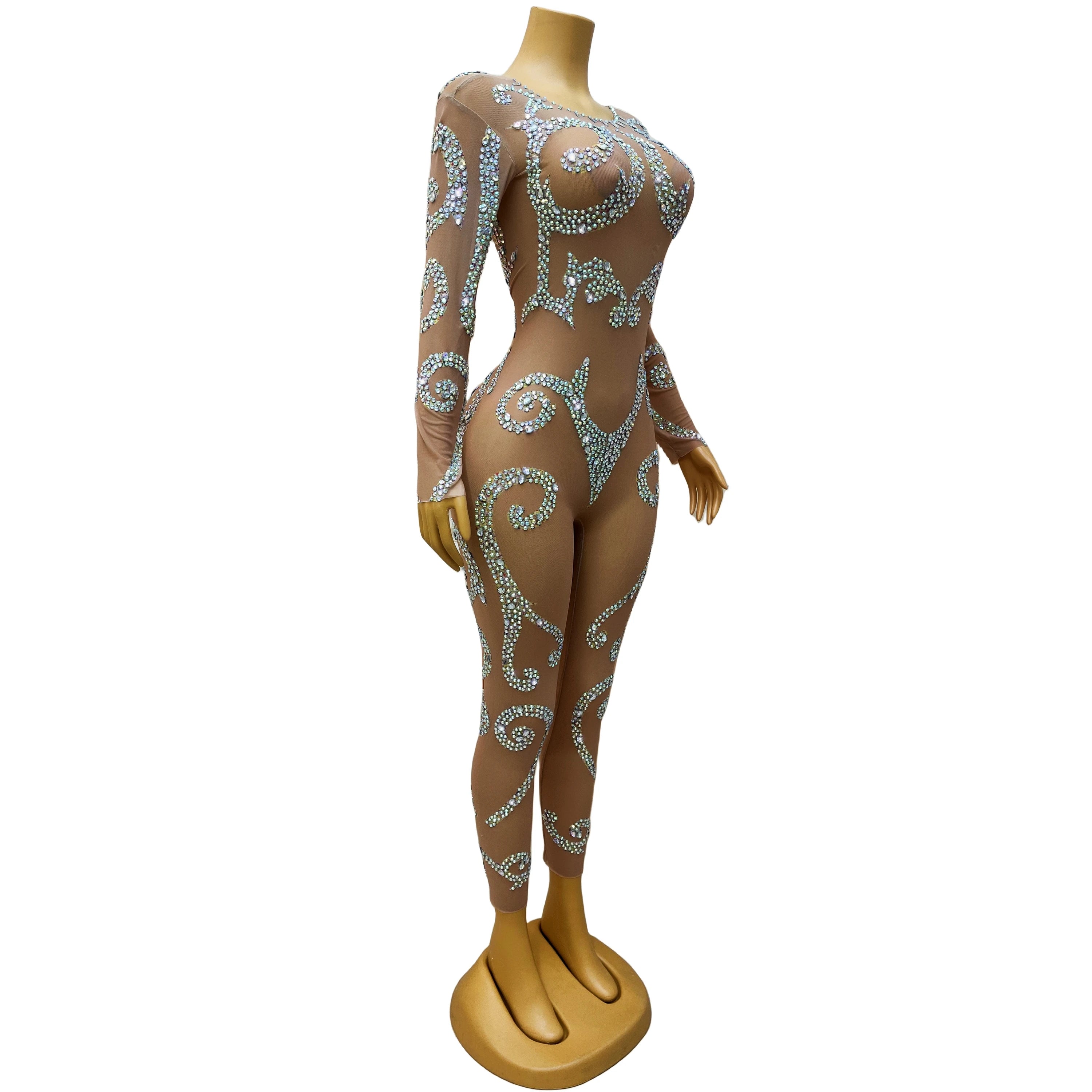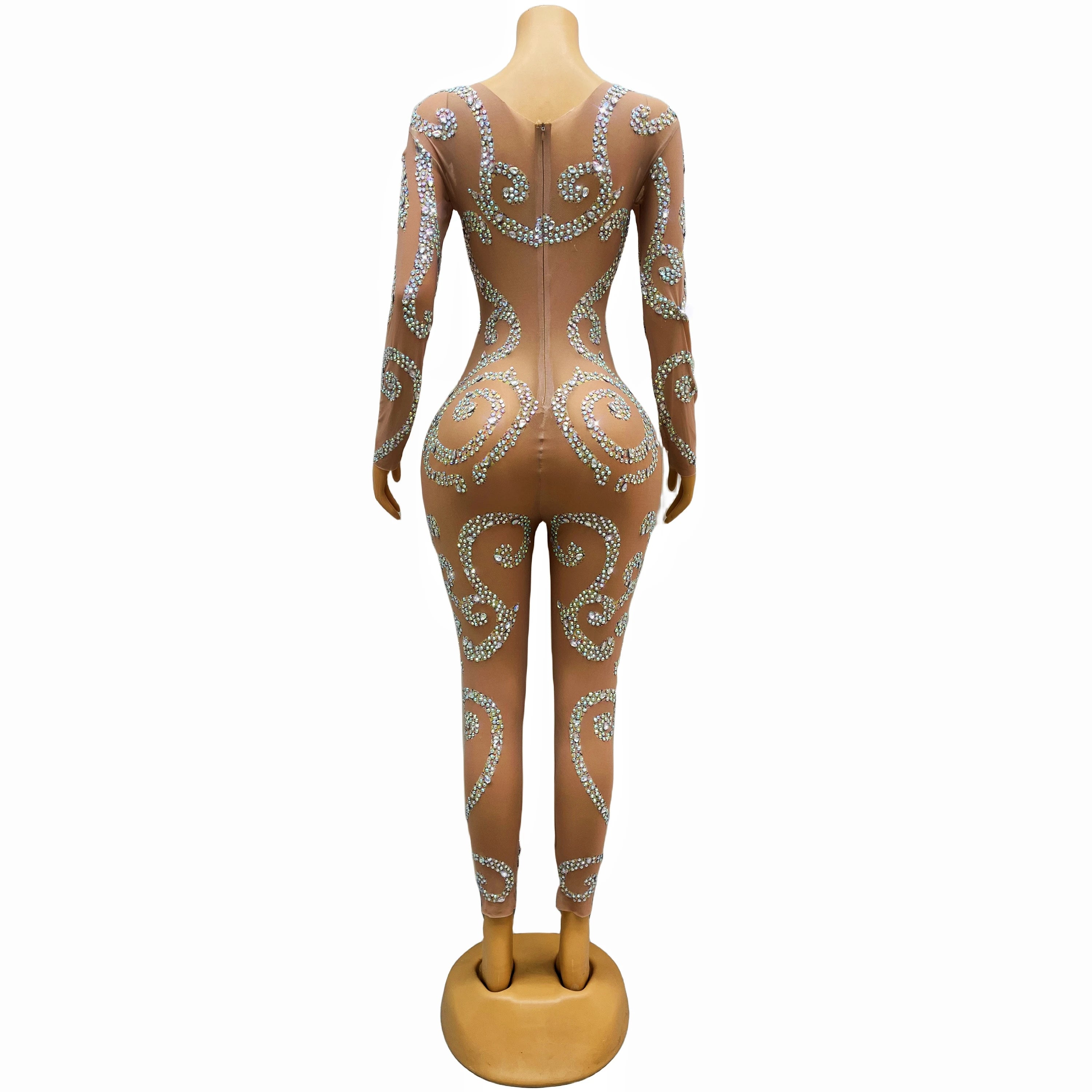 Shining AB Color Rhinestones Nude Transparent Jumpsuit Dance Sexy Bodysuit Outfit Birthday Performance Singer Costume