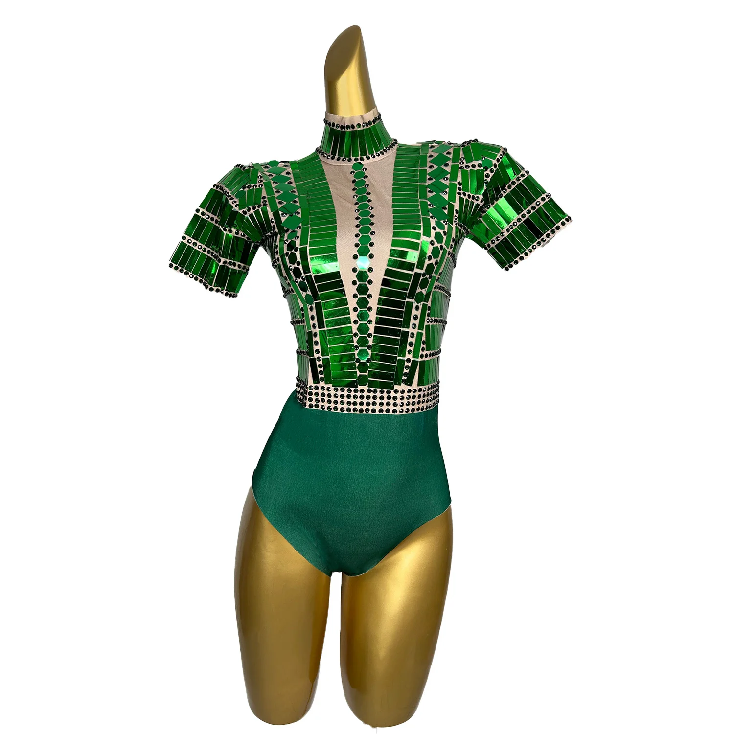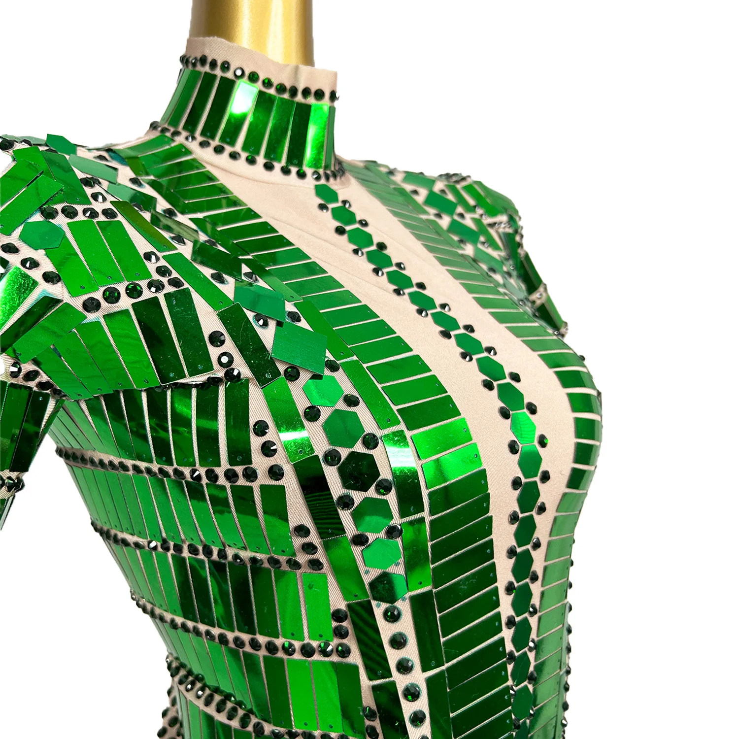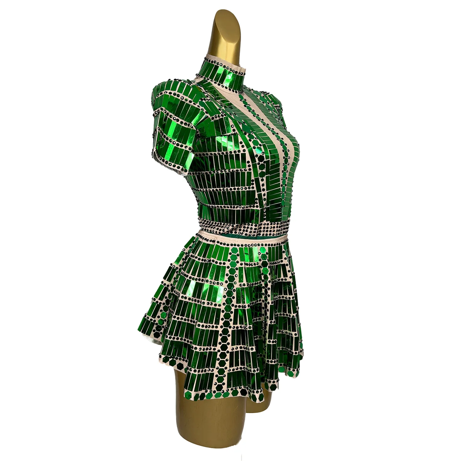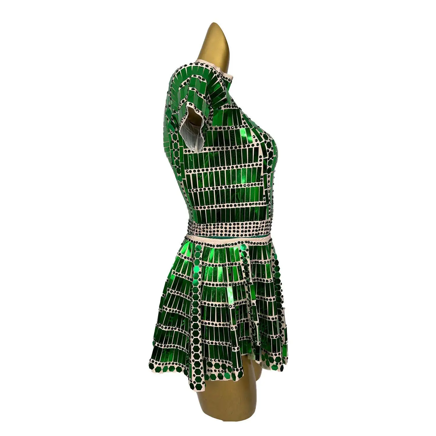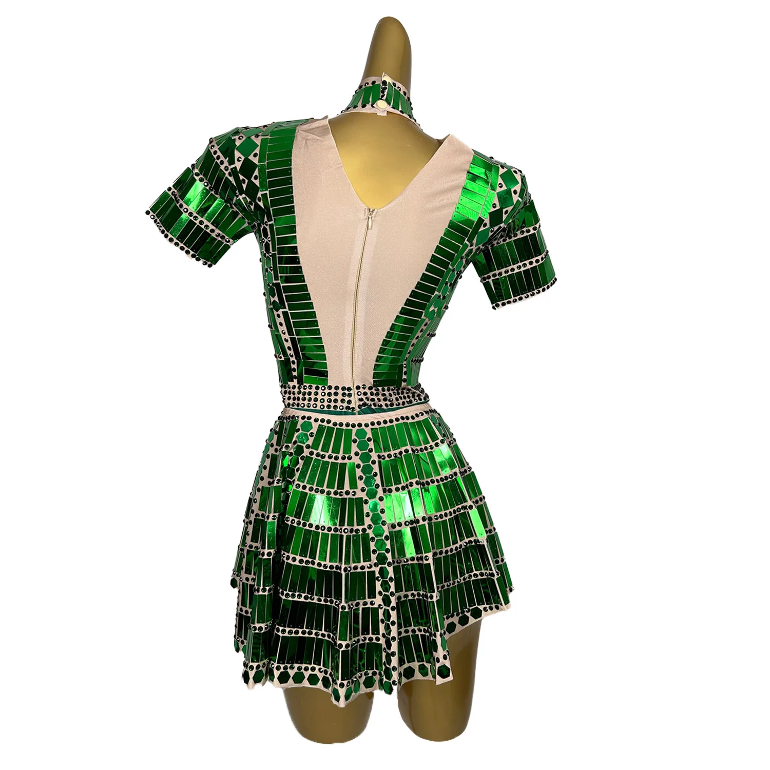 Shining Green Sequins Short Mirrors Dress Lady Bar Nightclub DJ Singer DS Stage 2-piece Performance Outfit Set Lianghuanghuang