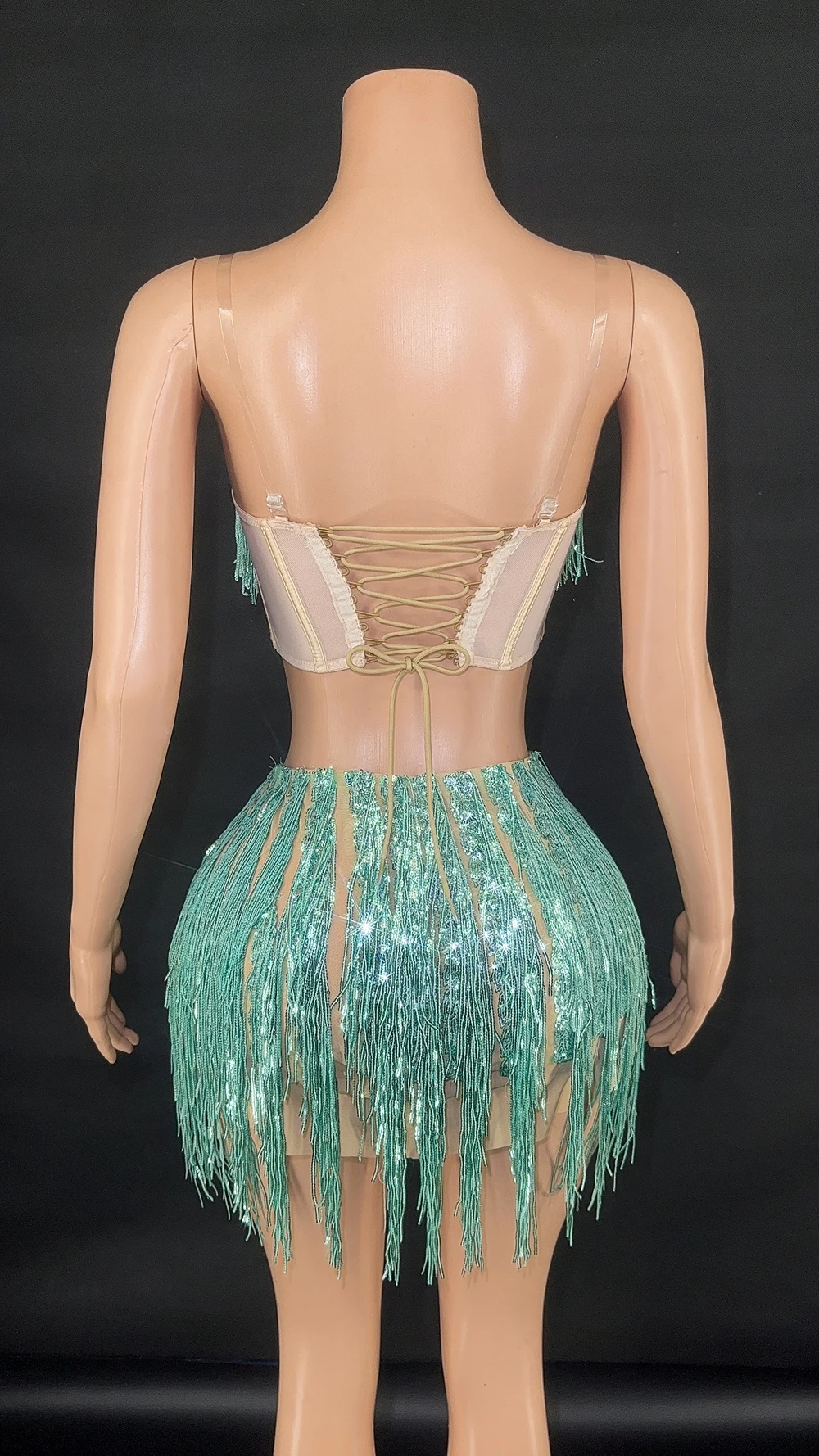 Shining Sequins Fringe Tube Top Short Skirt Two Pieces Women Sexy Party Birthday Dress Performance Dance Costume Show Stage Wear