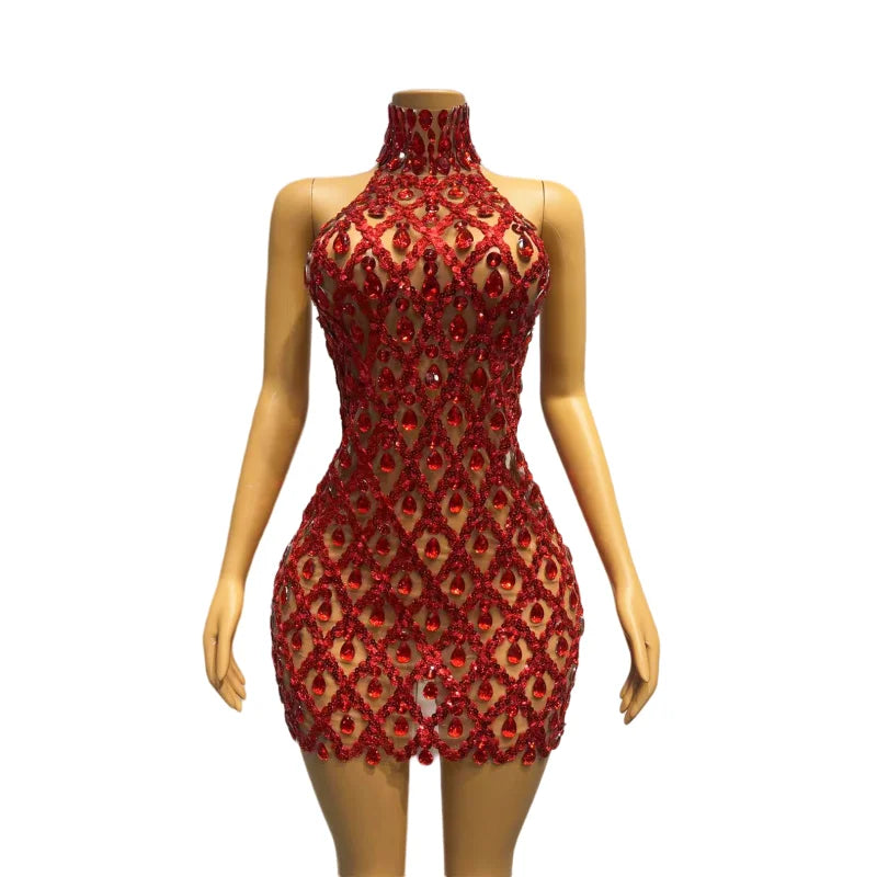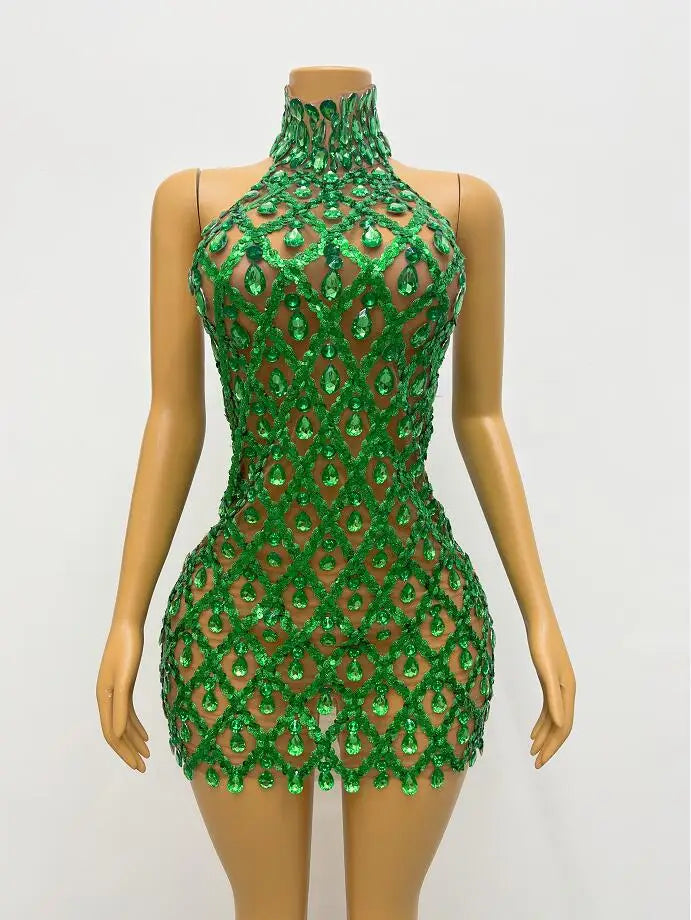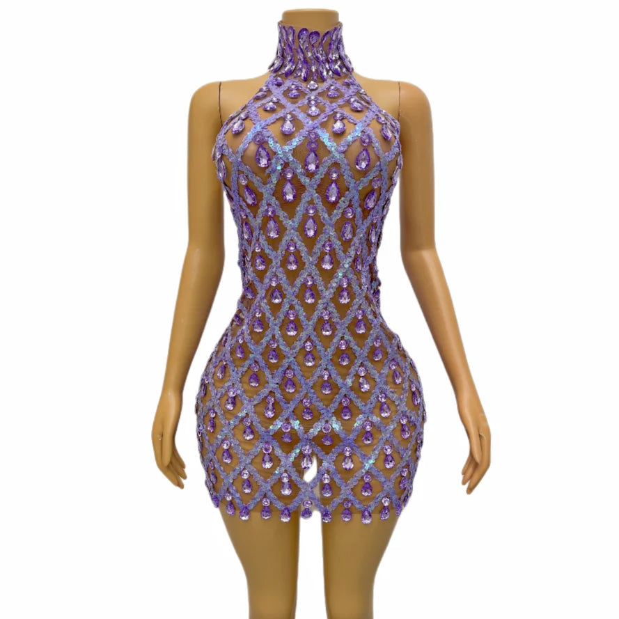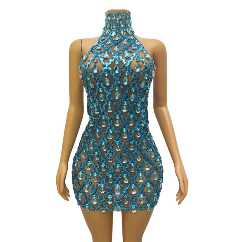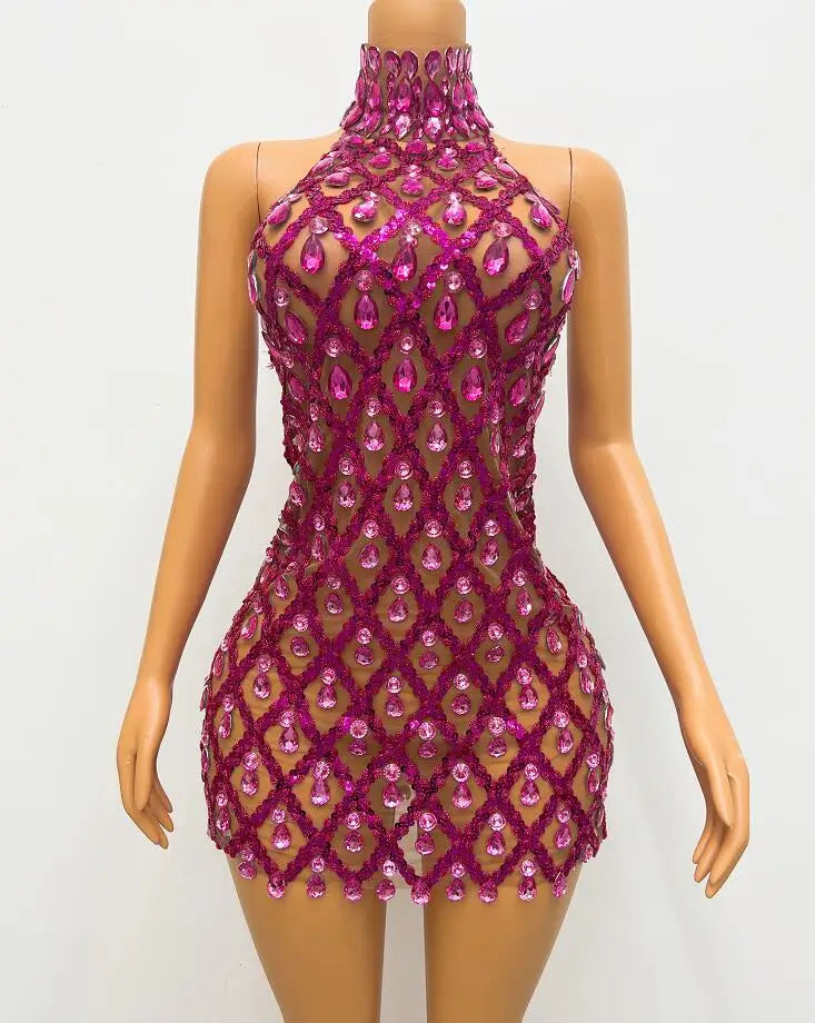 This sleeveless, transparent dress is adorned with shimmering sequins and crystals, making it a perfect outfit for celebrating birthdays or special evenings. The high net design and stretch mesh material add an alluring touch, making it an ideal costume for various performances and events.