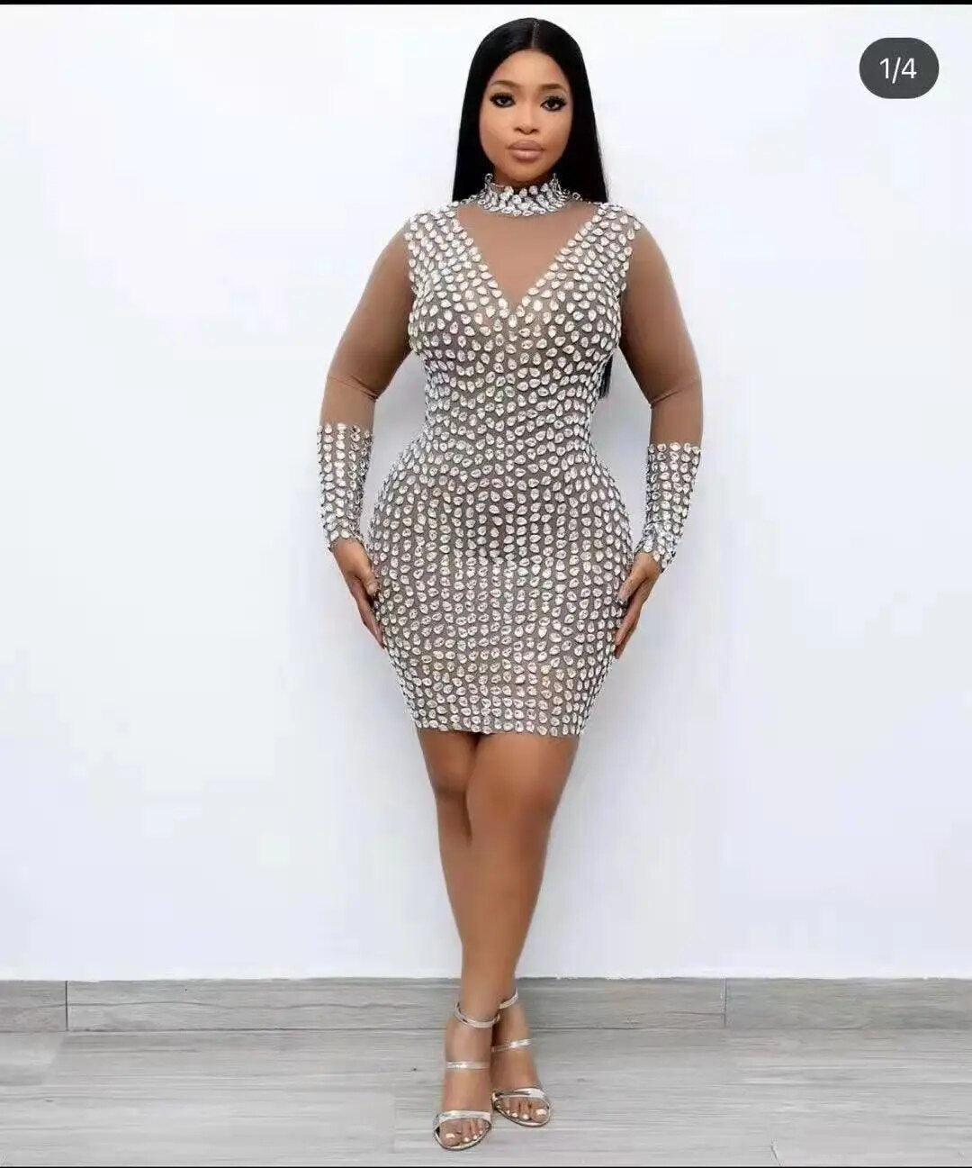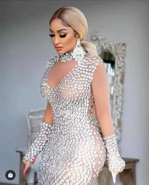 Shining Silver Rhinestones Turtleneck Dress Prom Evening Sexy Mesh Stage Costume Women See Through Birthday Long Sleeves Dresses