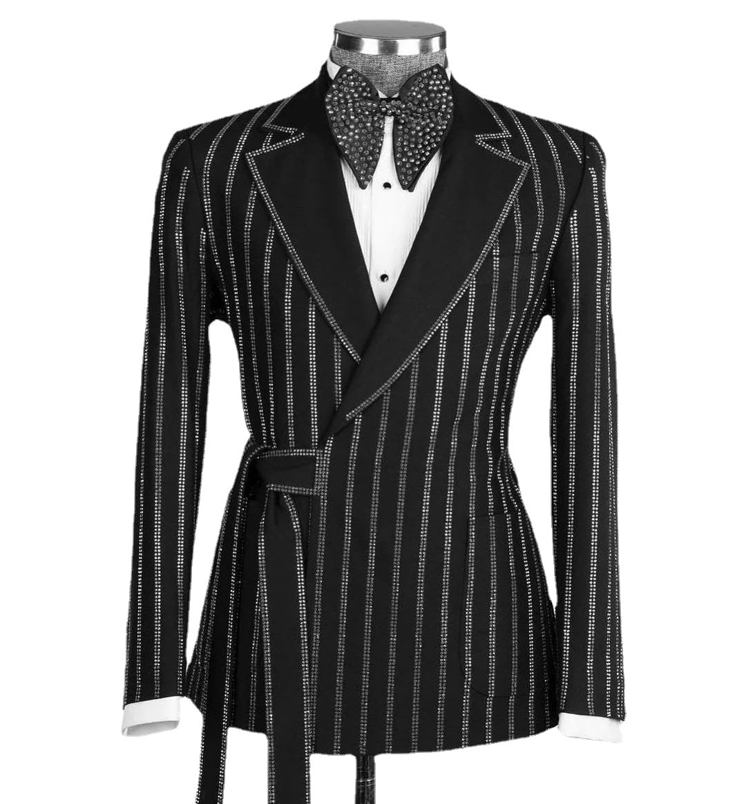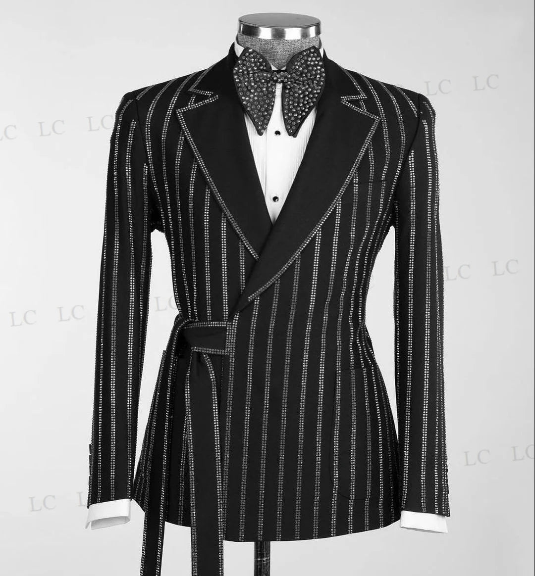 Elevate your formal look with this stylish 2-piece men's suit set featuring a floral jacquard blazer and pants adorned with diamonds and crystals. Ideal for prom, weddings, and groom attire, this set is available in plus sizes and can be customized for a perfect fit.