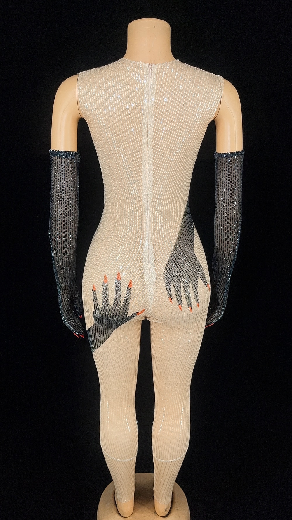 Shiny Sequins Black Hands Printed Jumpsuit Gloves Sexy Performance Costume Singer Dancer Show Stage Wear Party Birthday Outfit