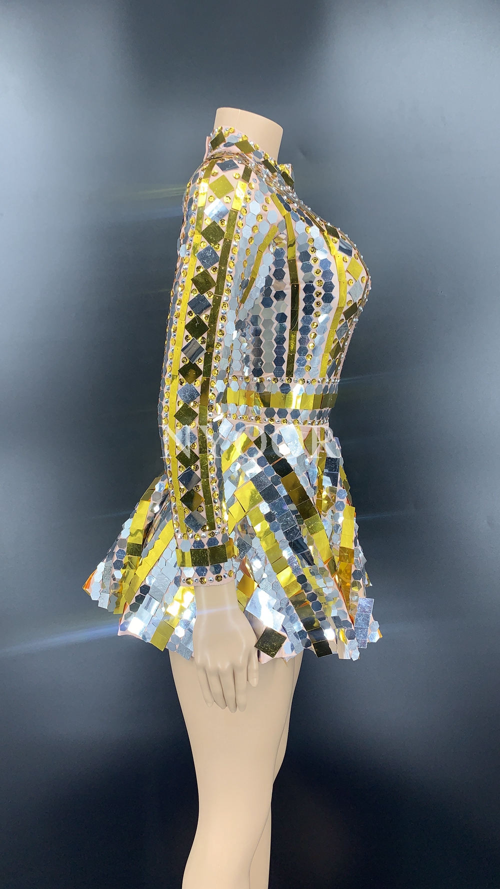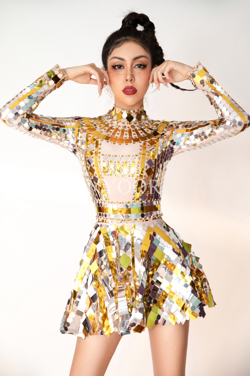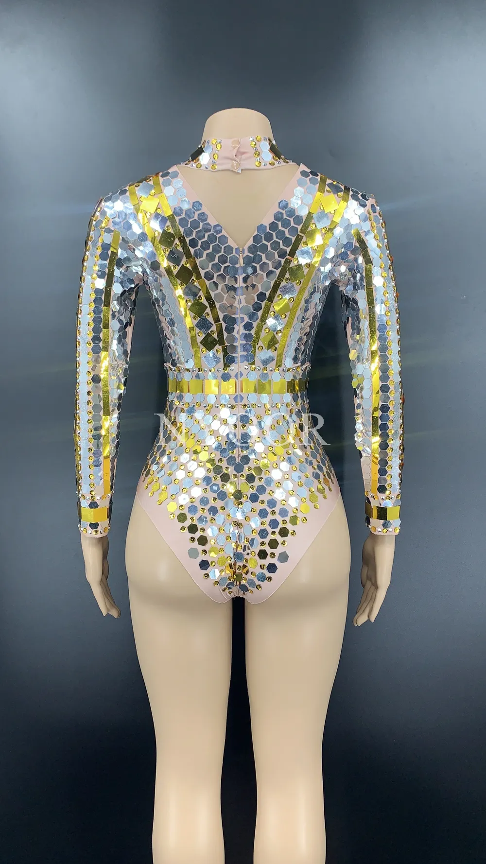 ShinySilver Gold Rhinestone Sequined Dance Costume Bodysuit Skirt Two Pieces Set Birthday Celebrate Prom Party Outfit Stage Wear