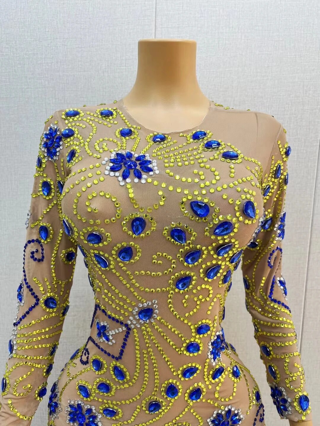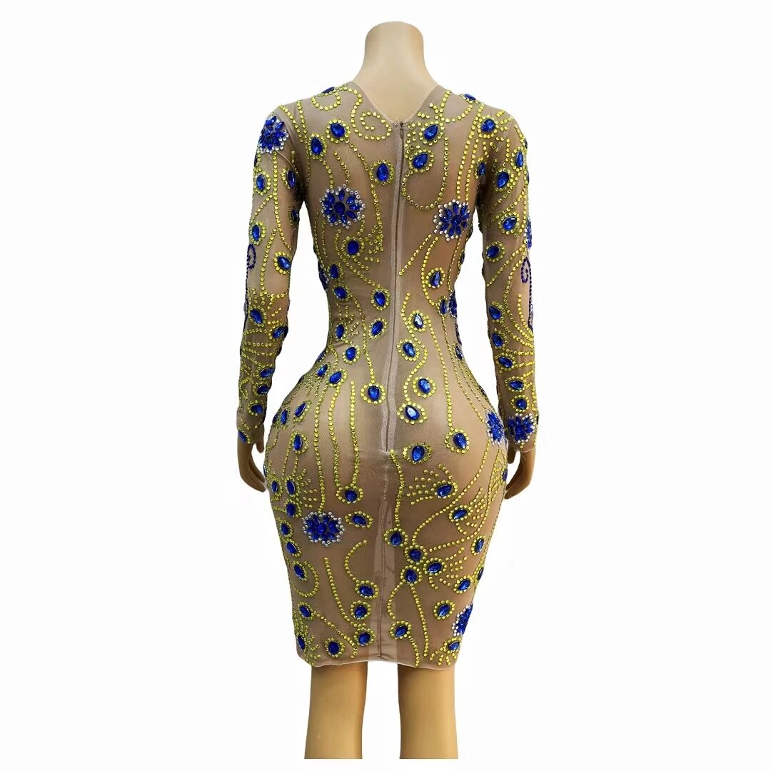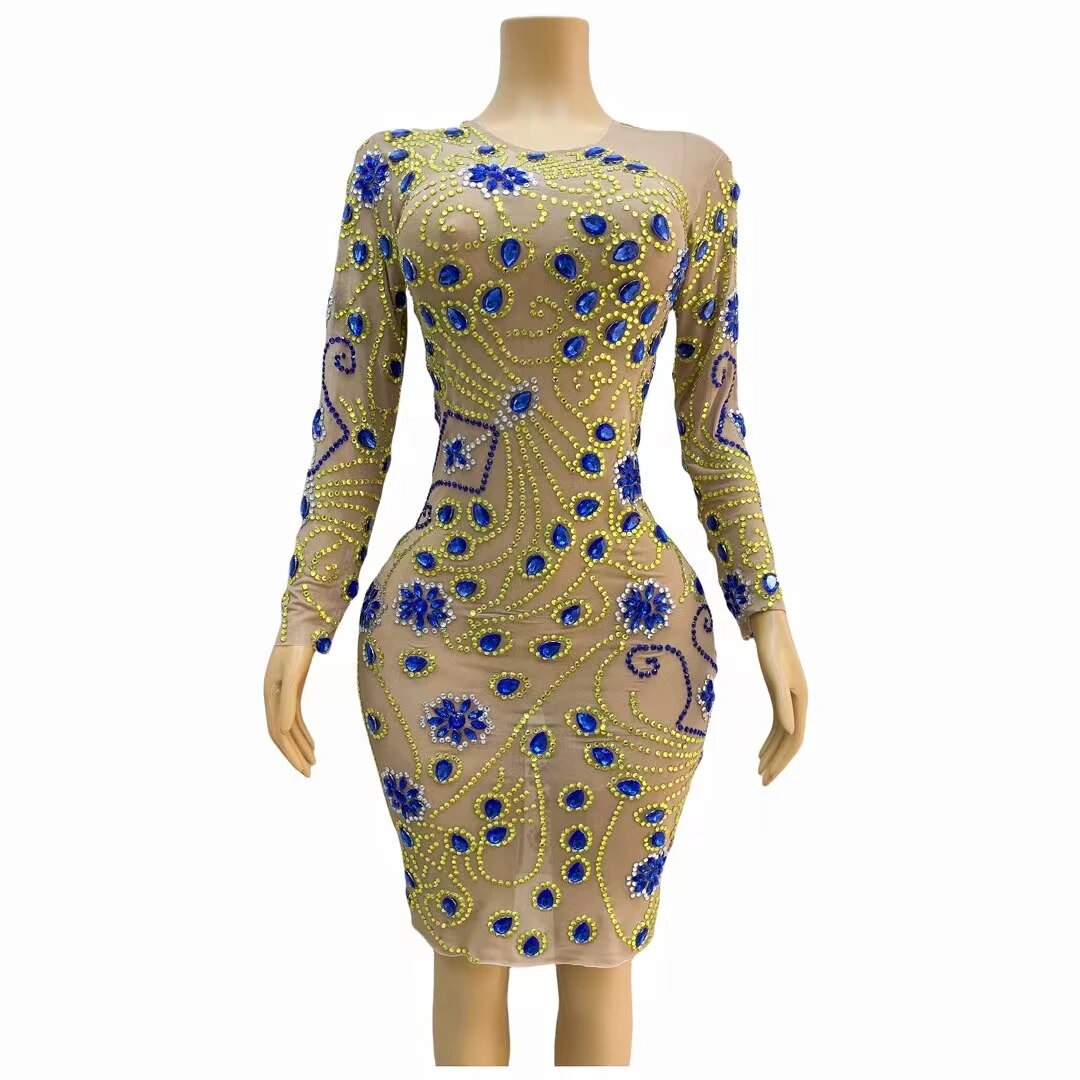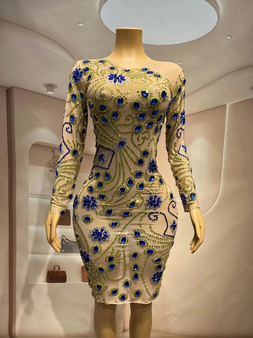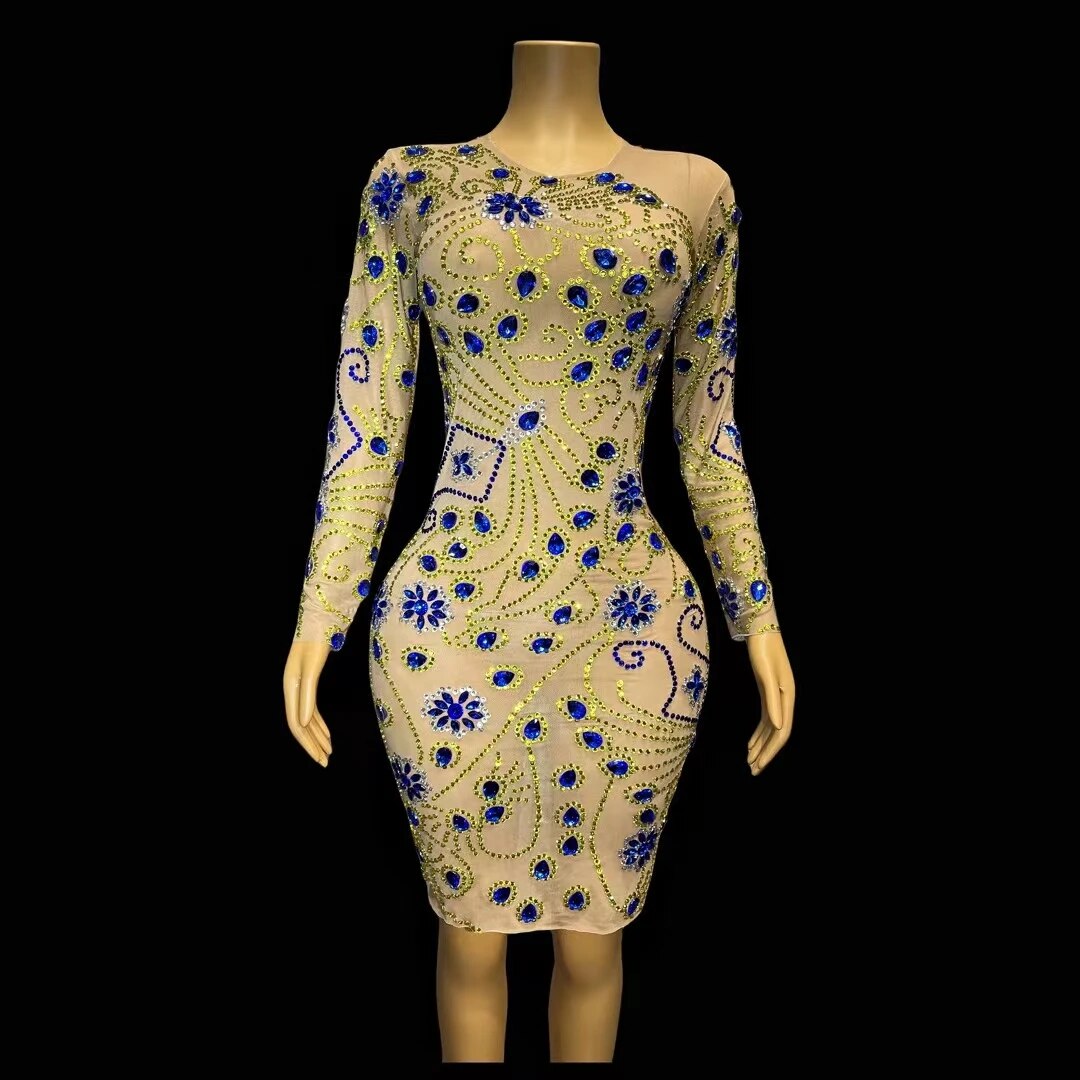 Short Dress Fashion Birthday Prom Rhinestones Floral Elastic Long Sleeve Tight Singer Host Concert Stage Costume