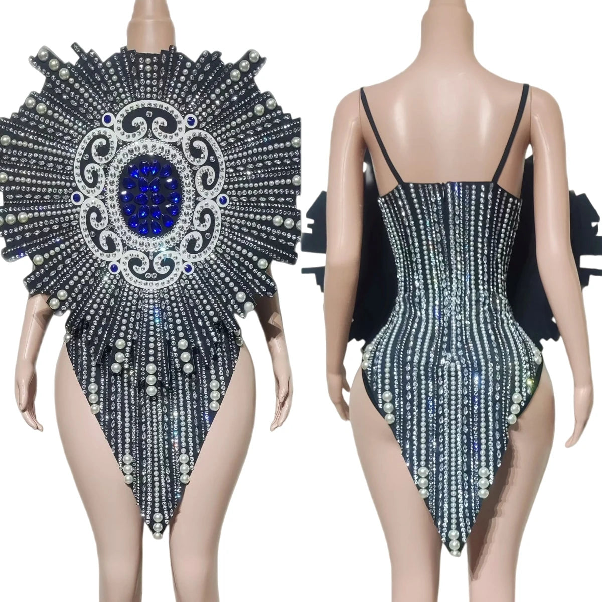 Showgirl Dance Sparkly Rhinestone White Pearls Black Bodysuit Club Drag Queen Performer Wear Masquerade Dress-up Outfit