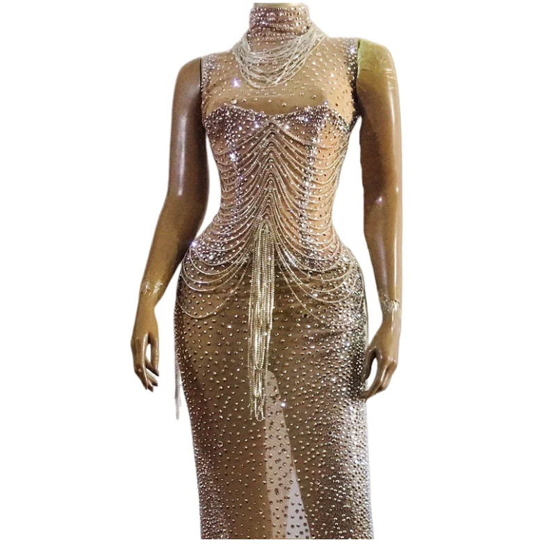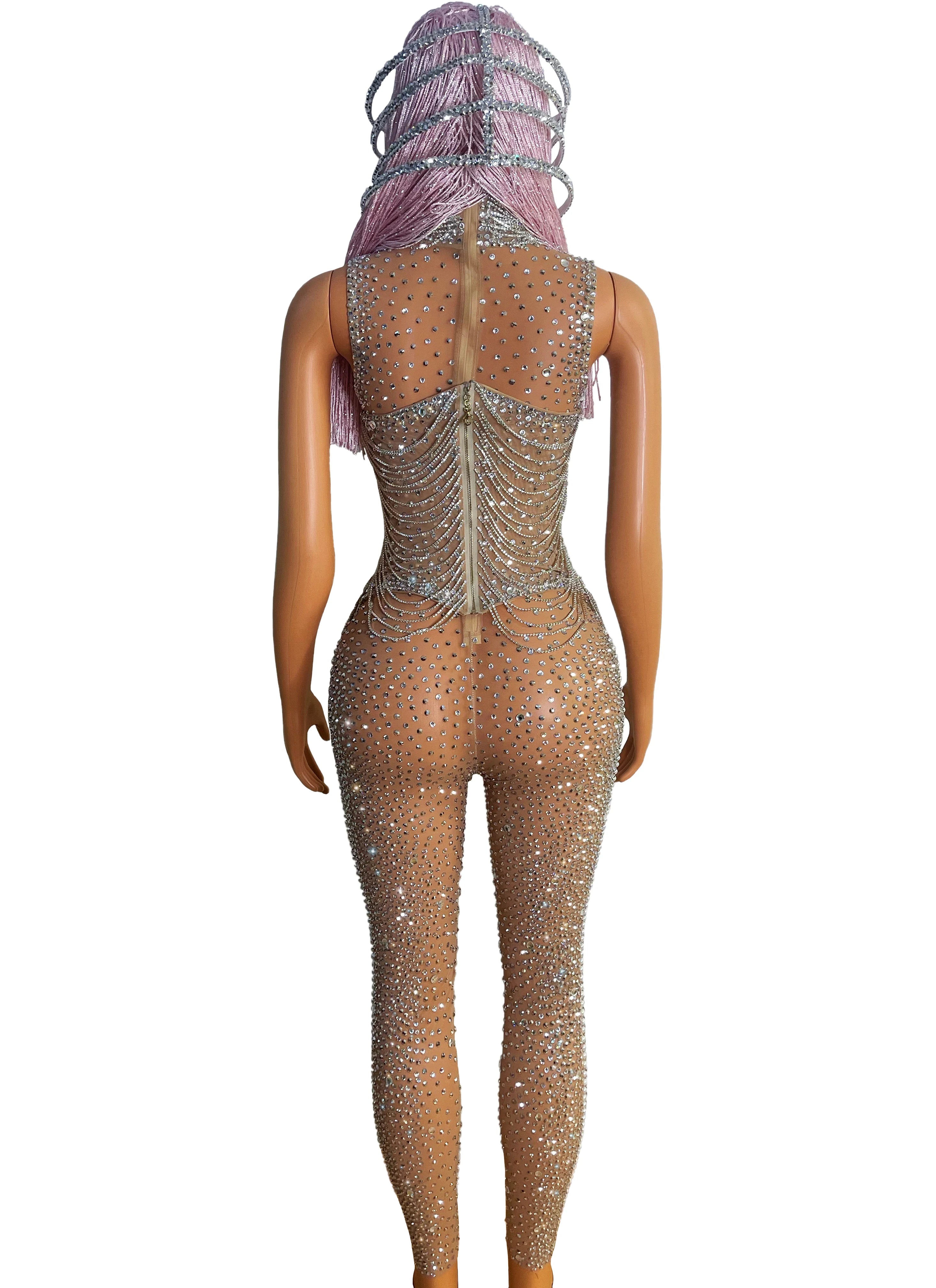 It seems like you're describing a dazzling outfit. A silver crystals girdle jumpsuit with transparent mesh and rhinestones bodysuit sounds like a stunning and eye-catching choice for birthday celebrations, evening events, or any occasion where you want to stand out in a sexy and stylish costume.