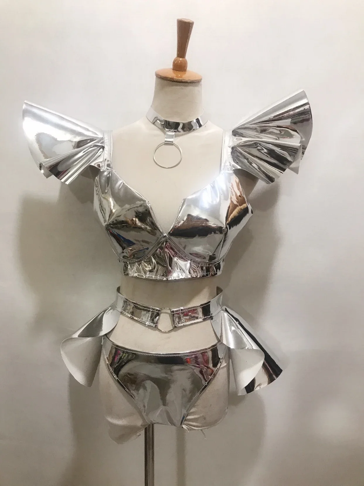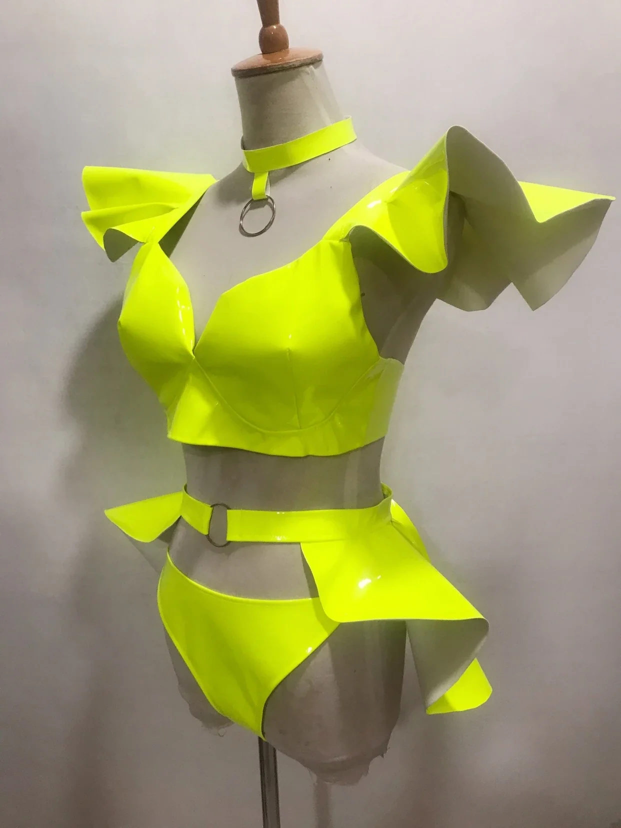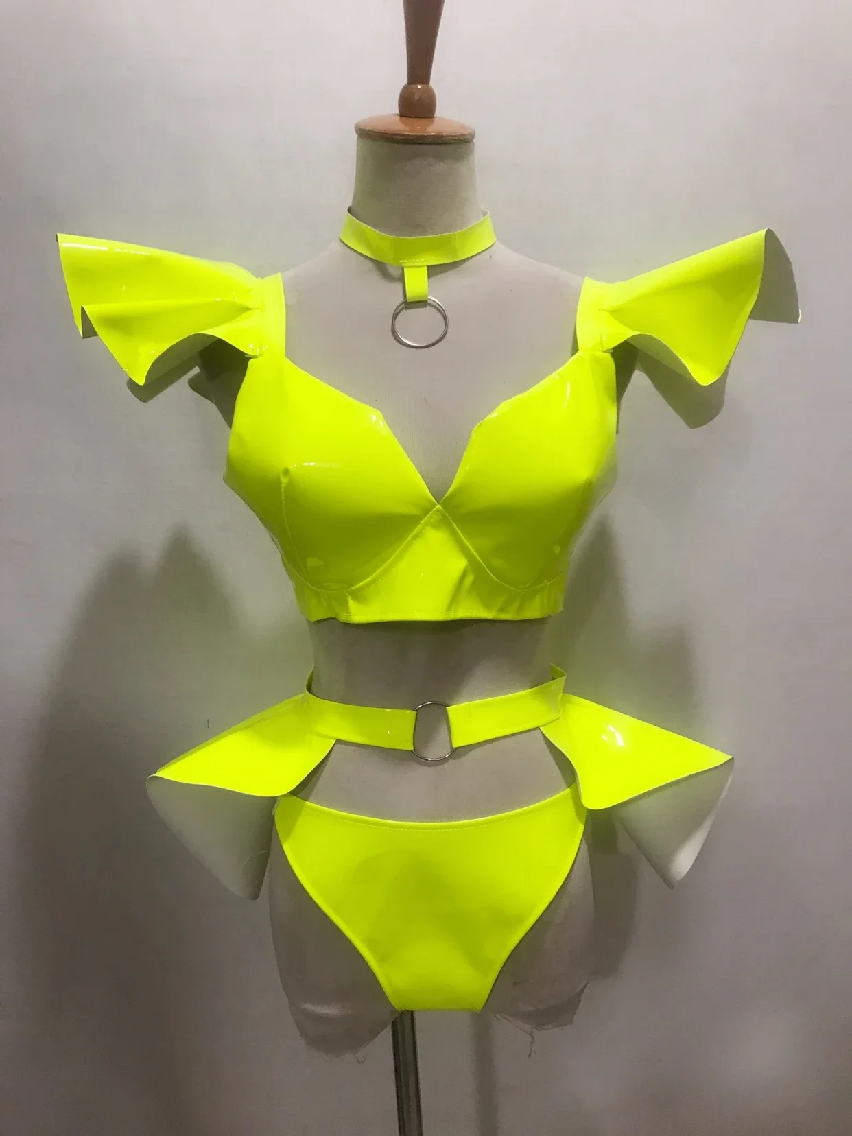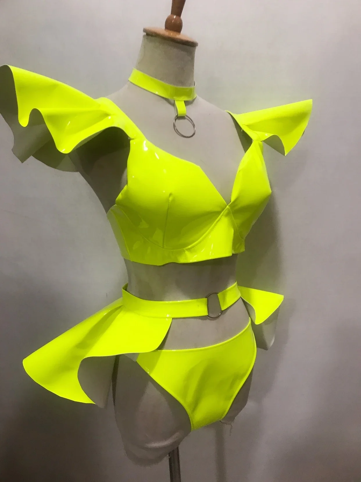 Silver Patent Leather Bikini Mini Skirt Festival Party Show Rave Dance Outfit Fluorescent Yellow Sexy Stage Performance Costume
