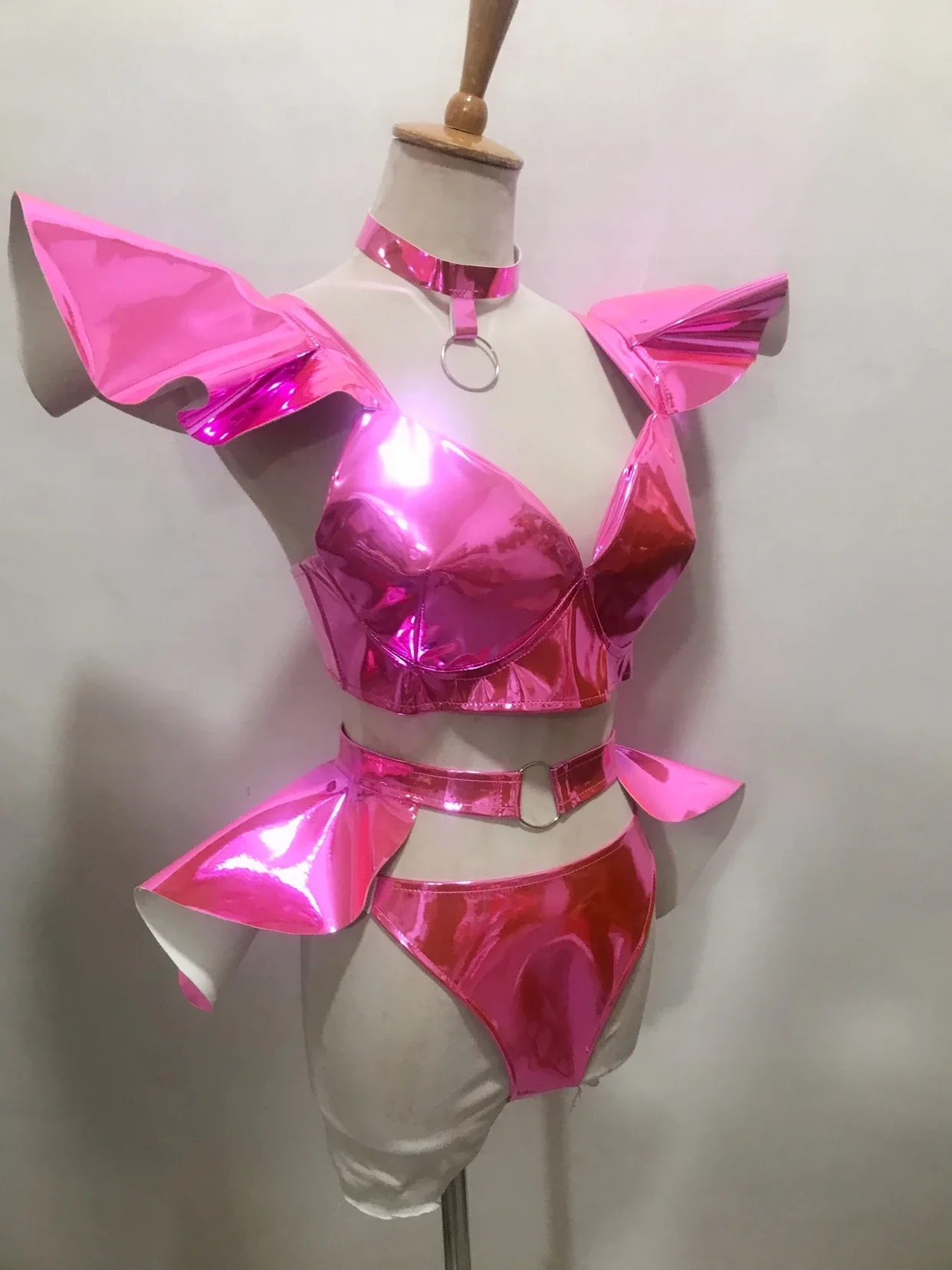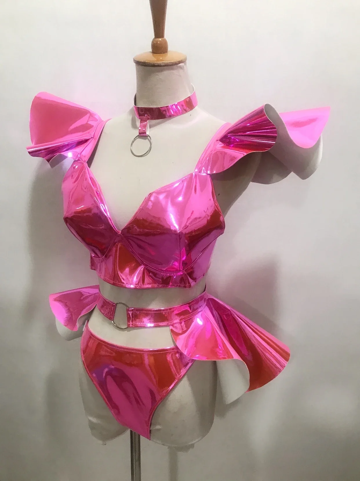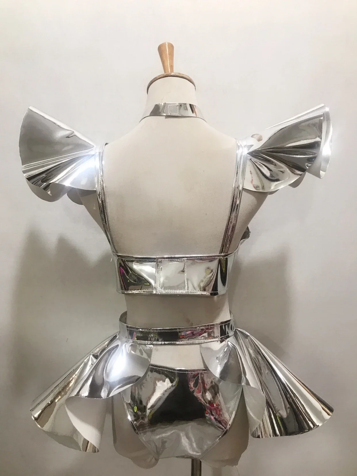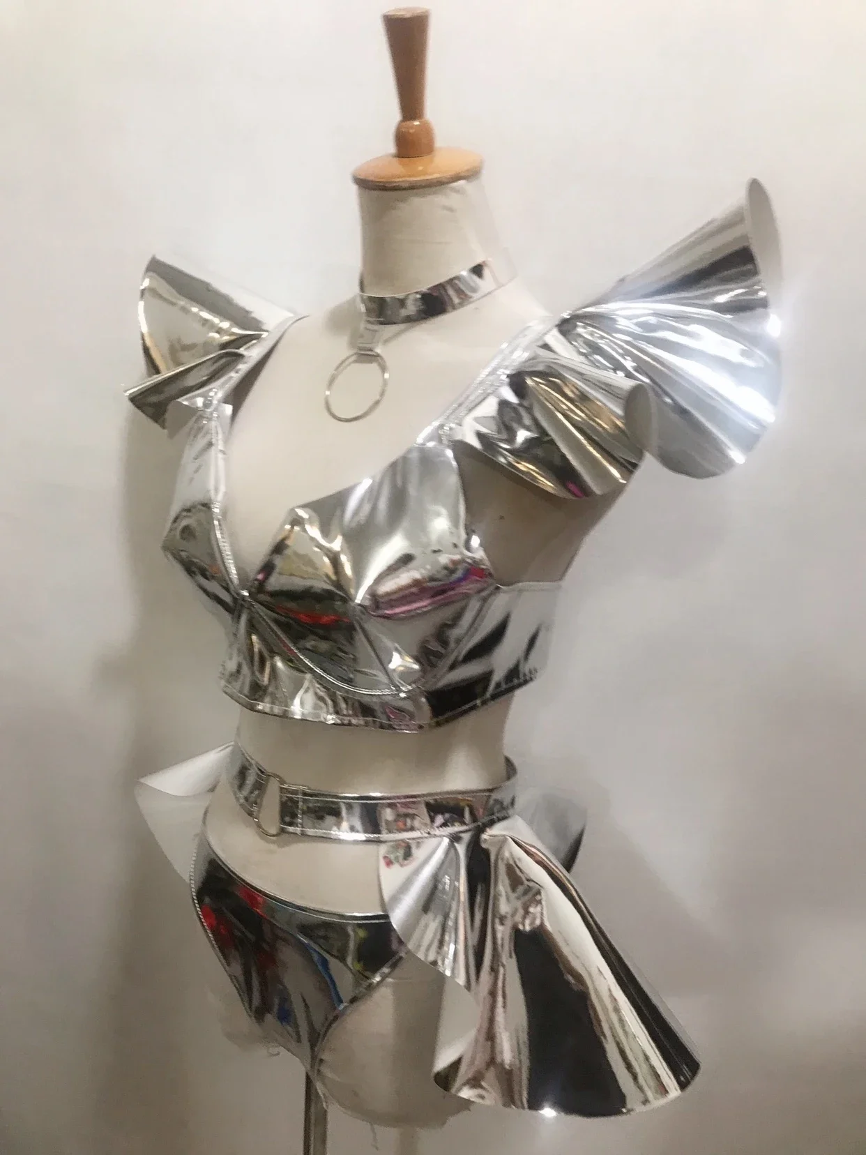 Silver Patent Leather Bikini Mini Skirt Festival Party Show Rave Dance Outfit Fluorescent Yellow Sexy Stage Performance Costume