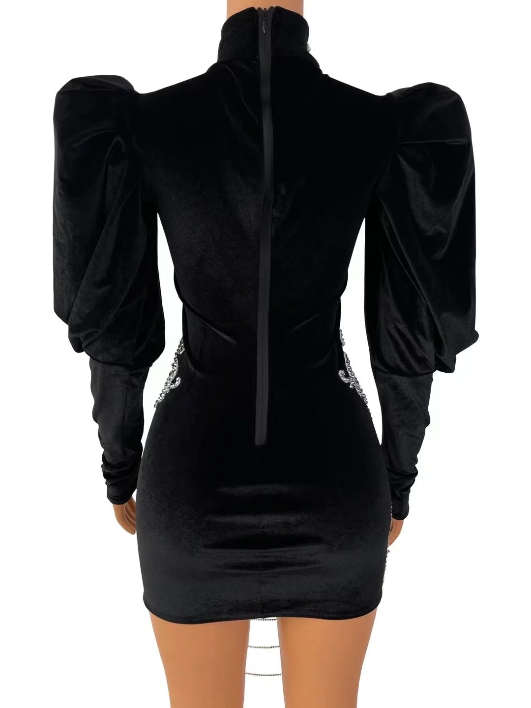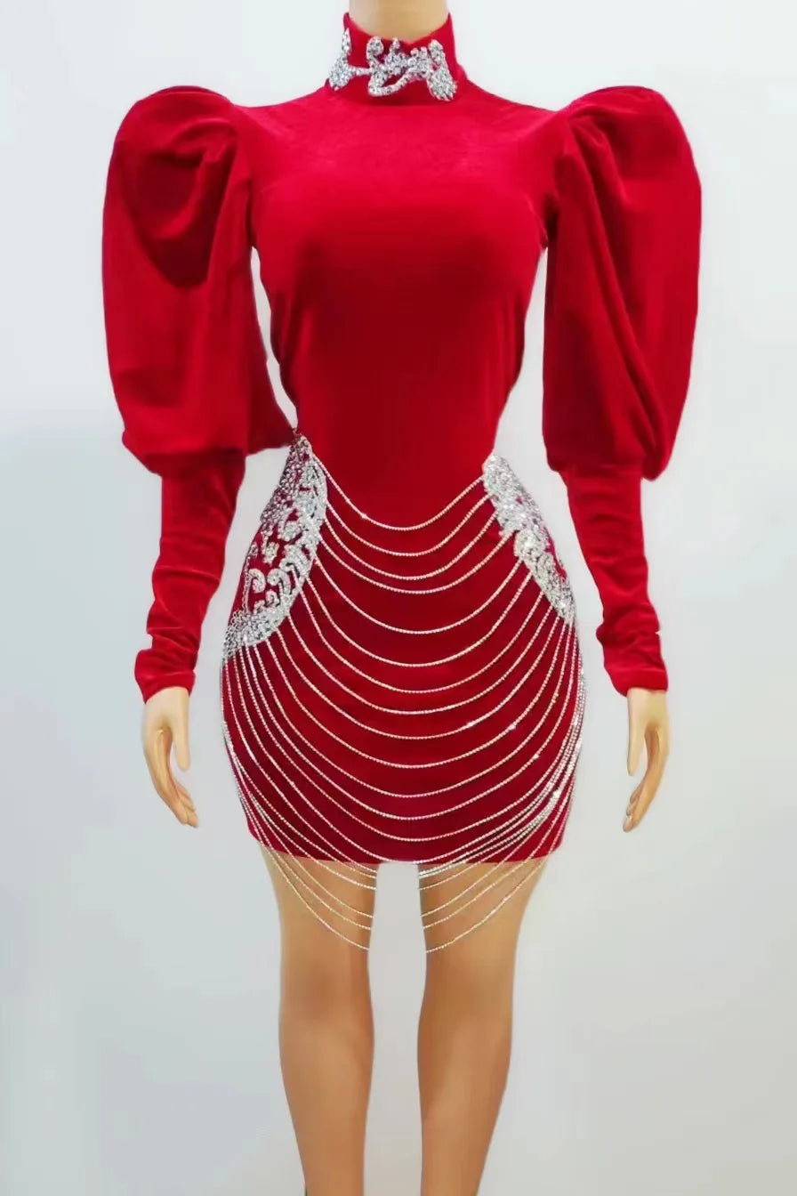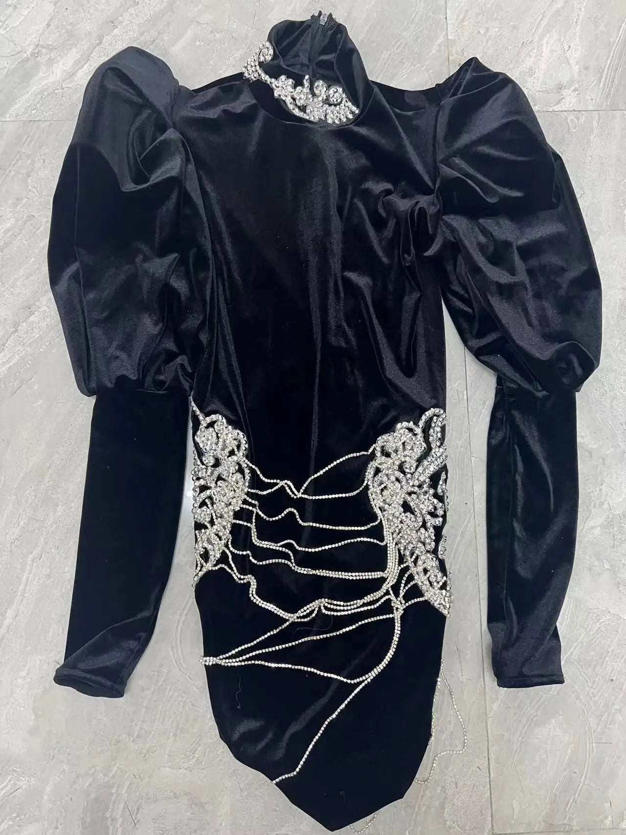 This sexy outfit, adorned with rhinestones, is perfect for prom, shows, and birthday celebrations. The costume features a stylish black velvet design, making it an ideal choice for a glamorous and eye-catching look.