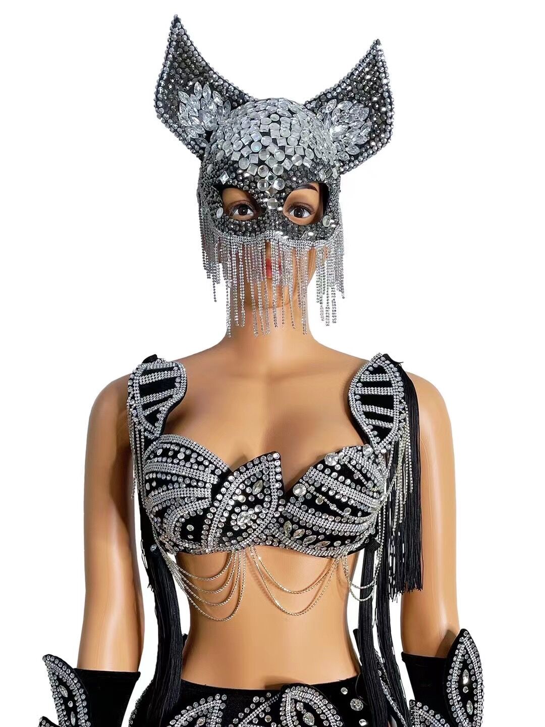 Silver Rhinestones Black Tassels Bra Short Outfit Set Summer Bikini Show Prom Party Evening Singer Costume Set