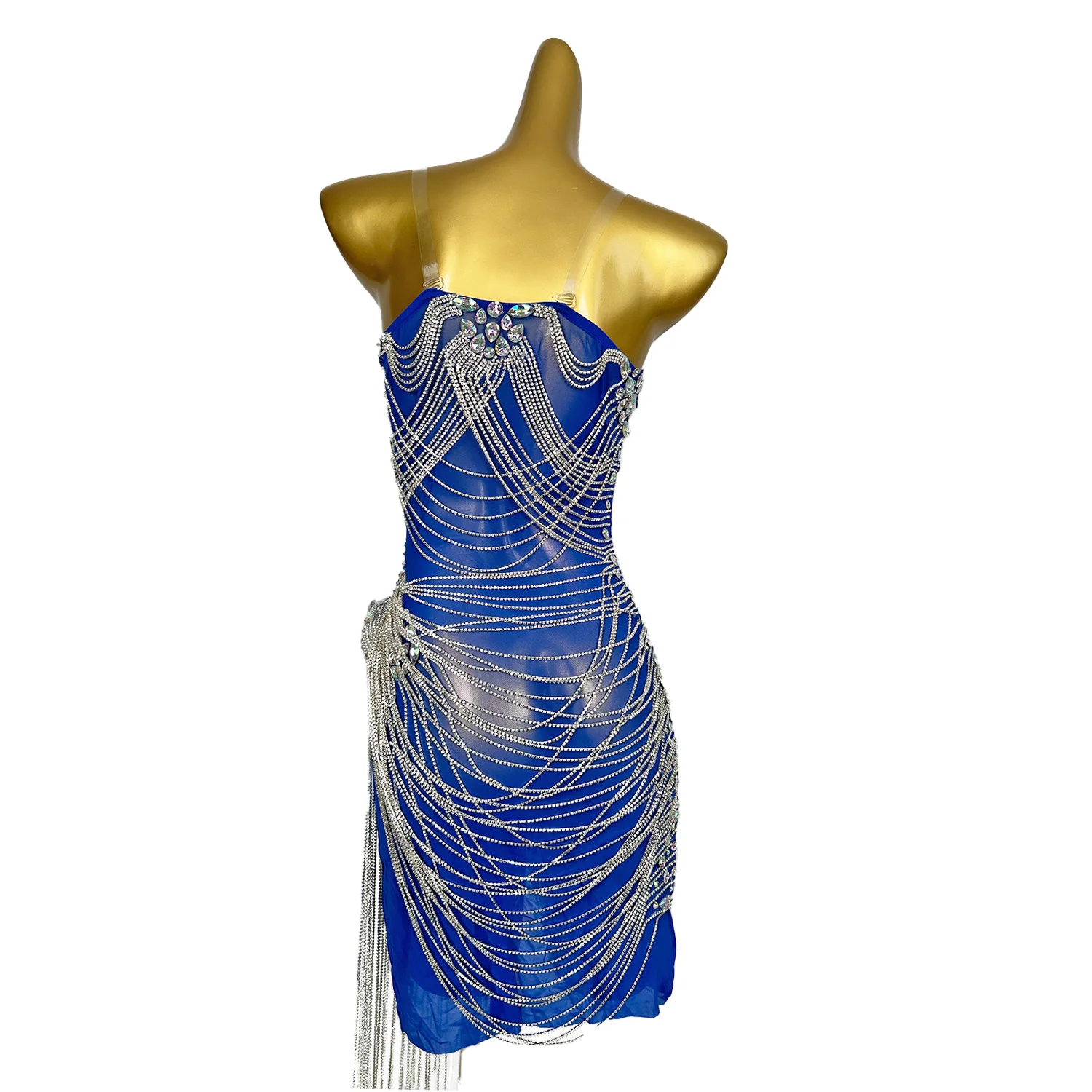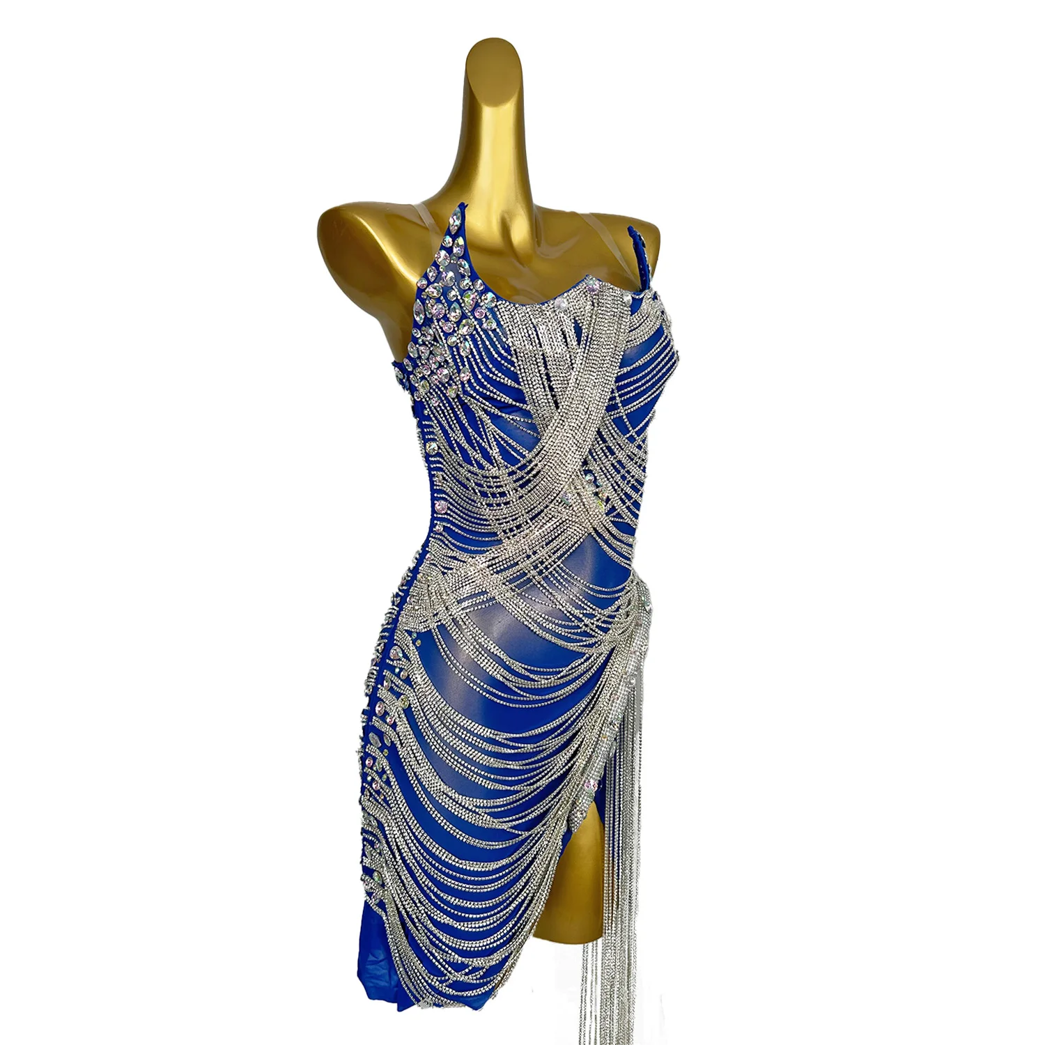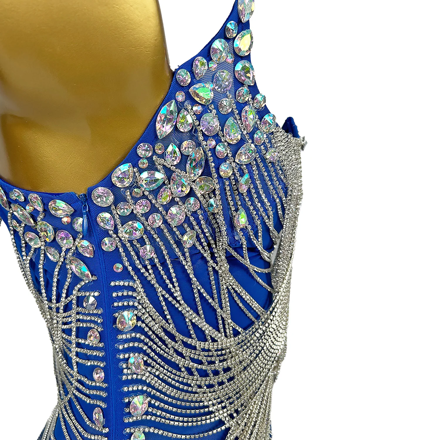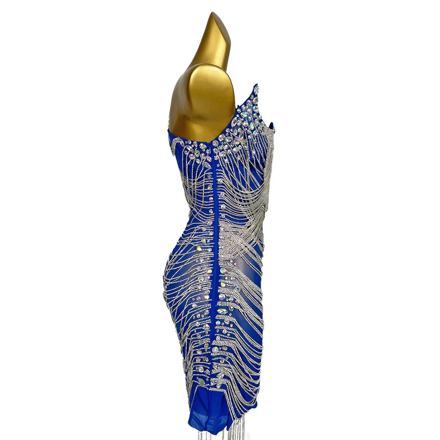 Silver Rhinestones Fringes Transparent Blue Mesh Stretch Dress Evening Birthday Celebrate Outfit Sexy Performance Costume Luoli