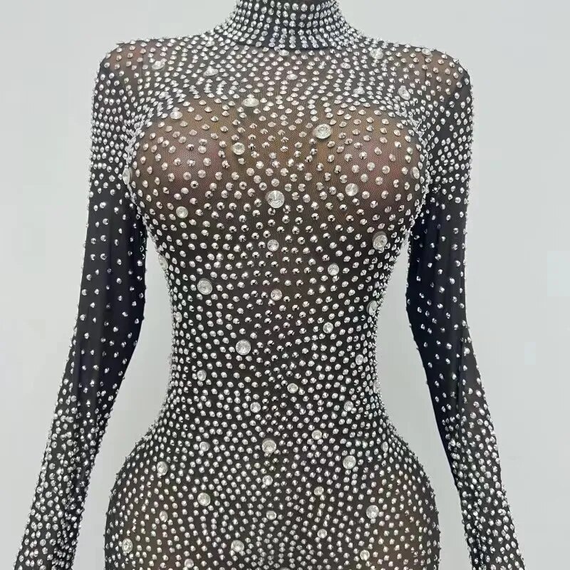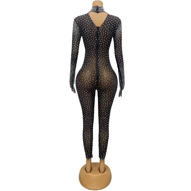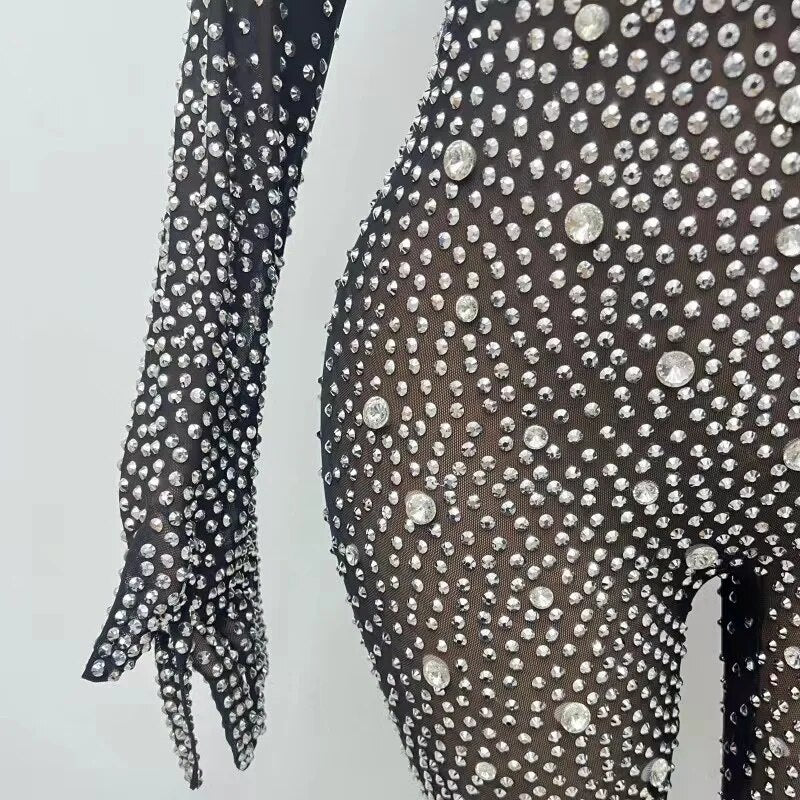 Silver Rhinestones Gloves Jumpsuit TransparentMesh Stones Bodysuit Pants Birthday CelebrateOutfit Evening Sexy Dance Costumes