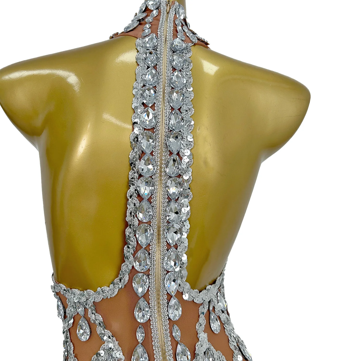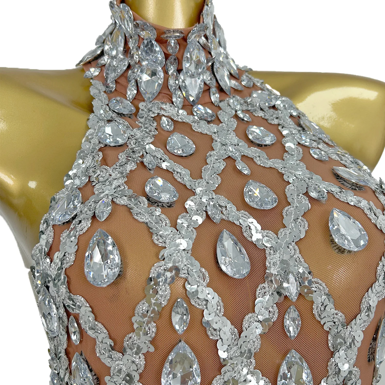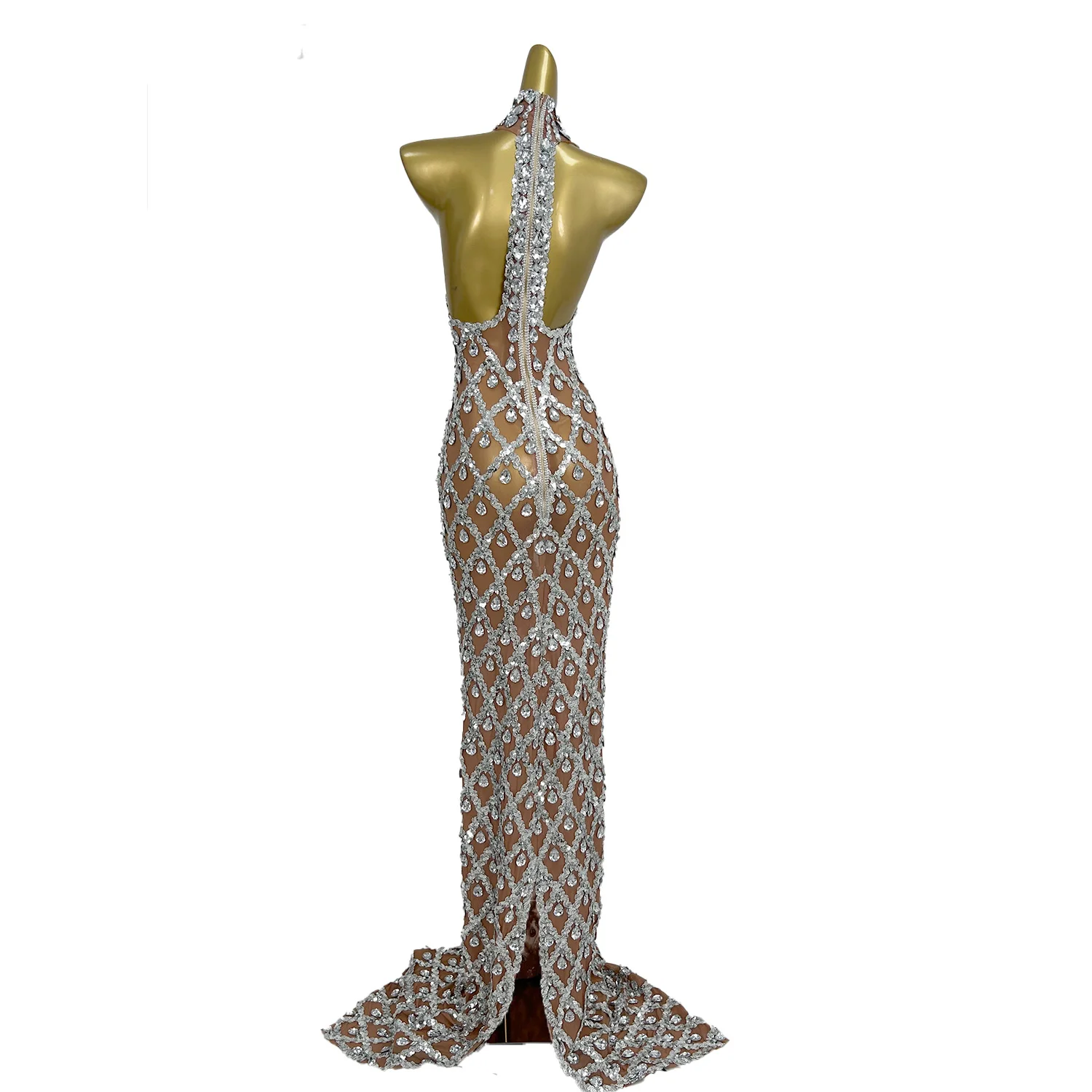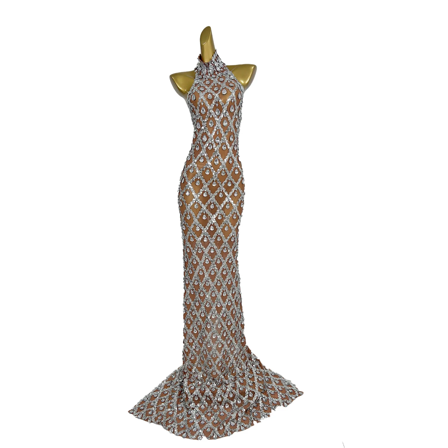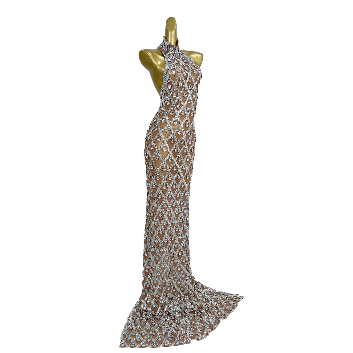 Silver Sequins Crystals Stretch Mesh Celebrate Evening Prom Gowns Long Dress Birthday Party Outfit Singer Stage Wear Shaokaojia