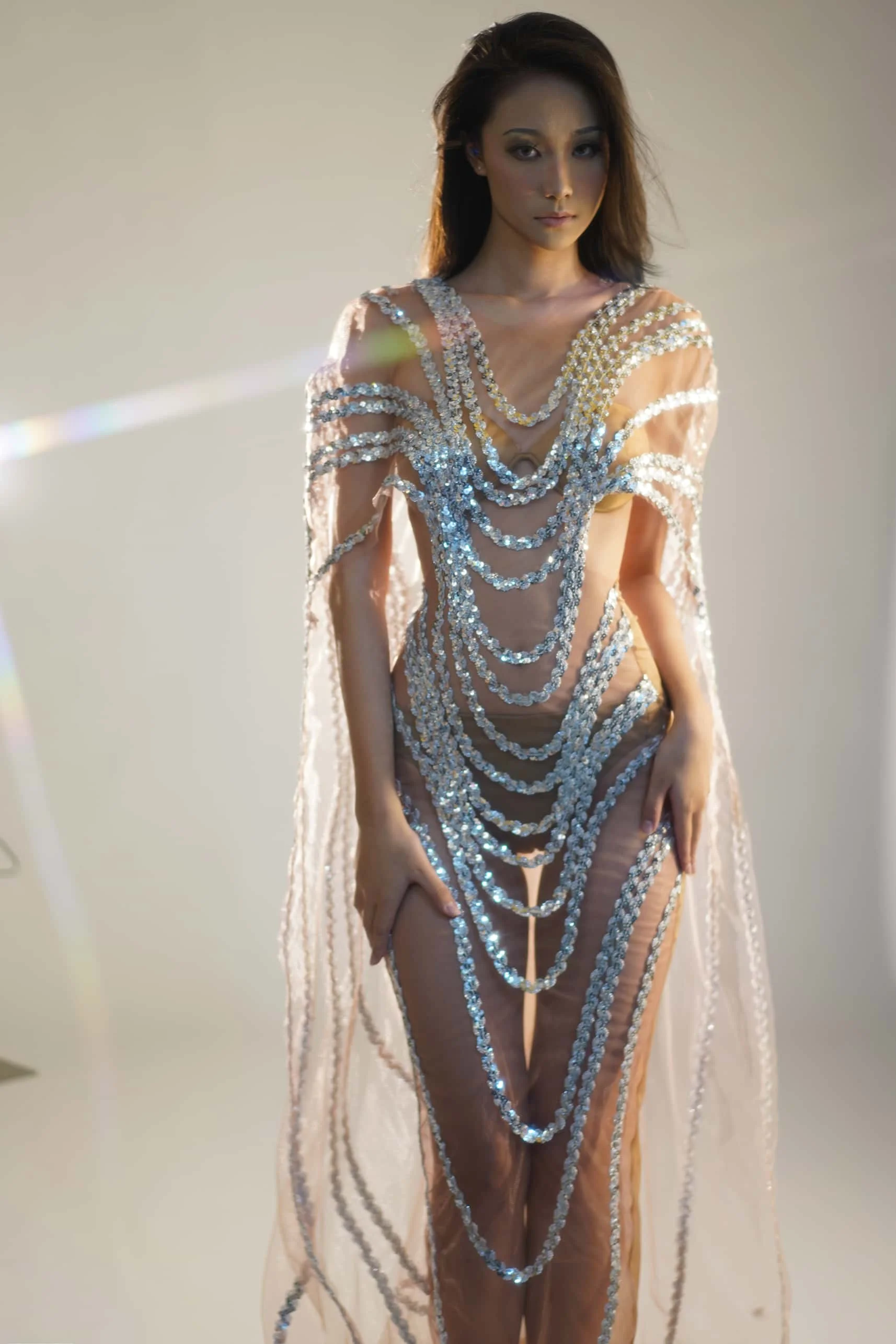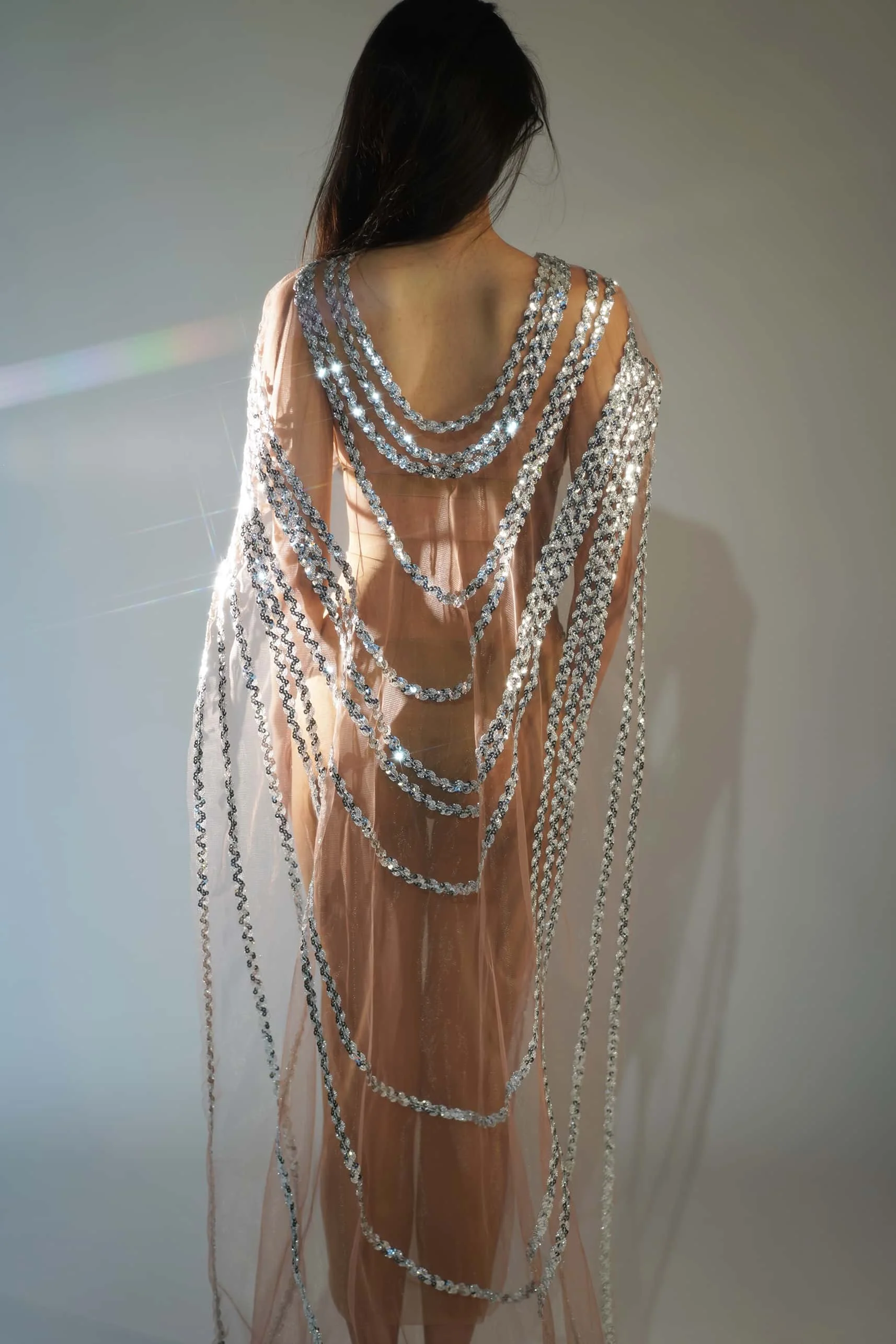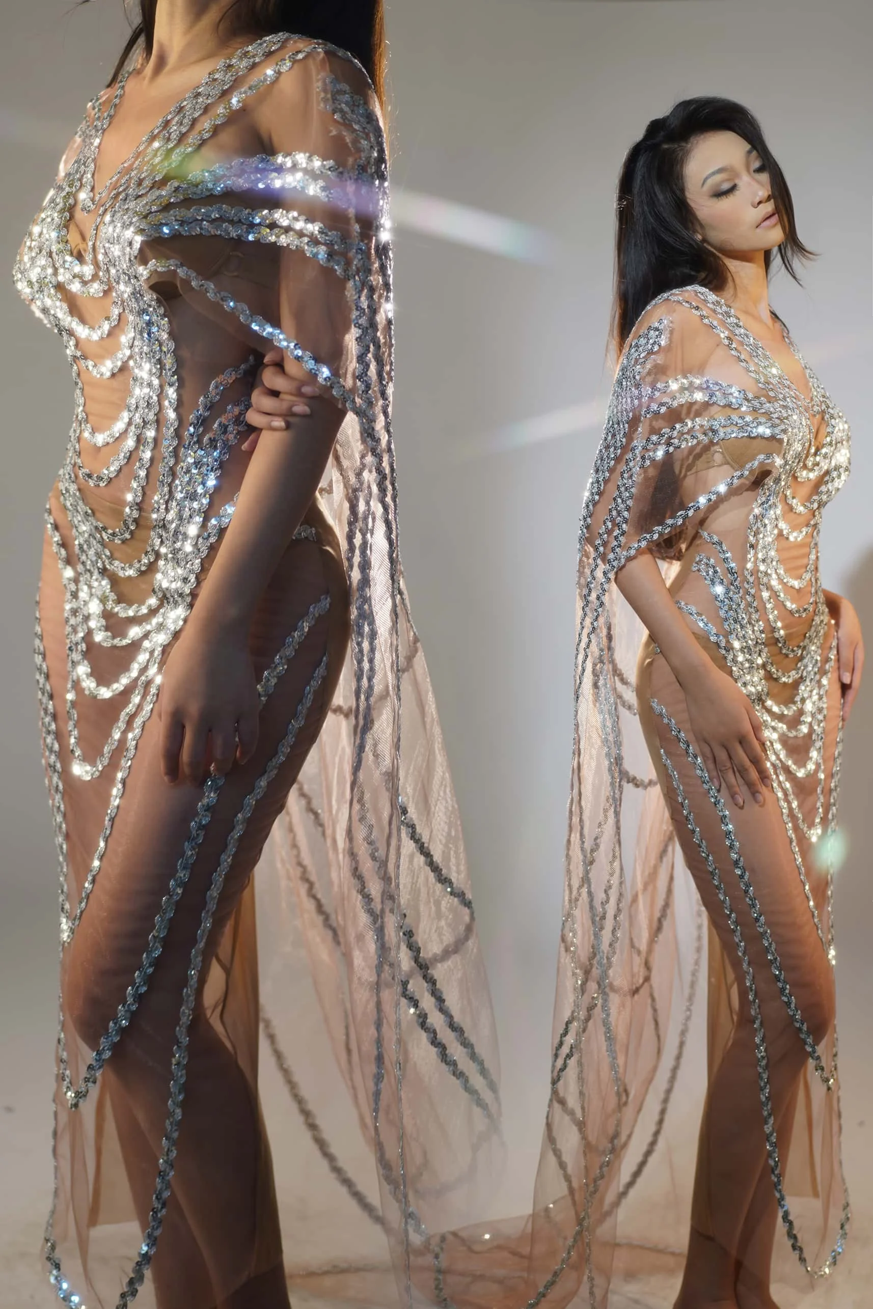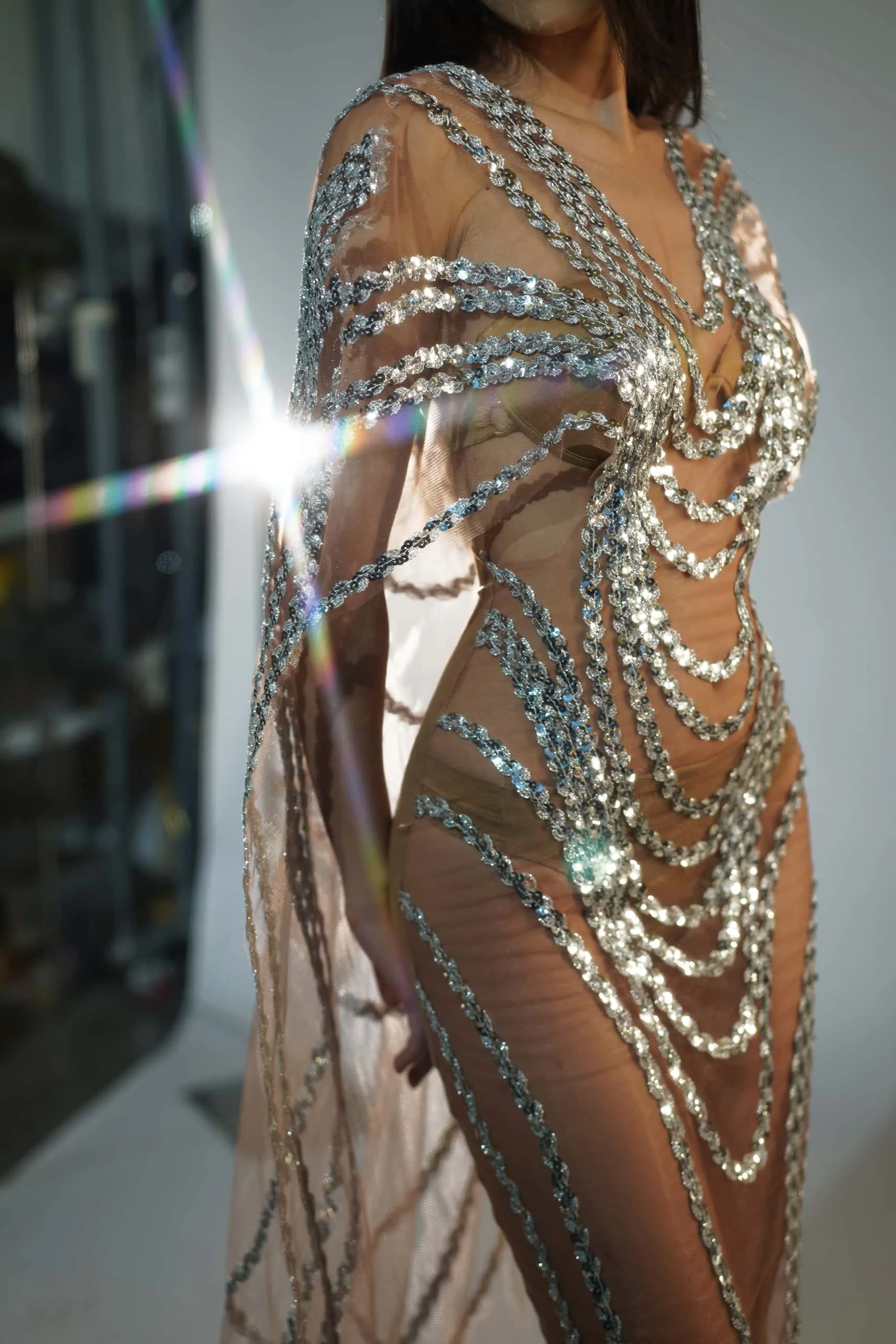 Silver Sequins Dress Birthday Party Long Dress Transparent Mesh Rave Outfit Showgirl Costume Stage Wear for Women Fengshui