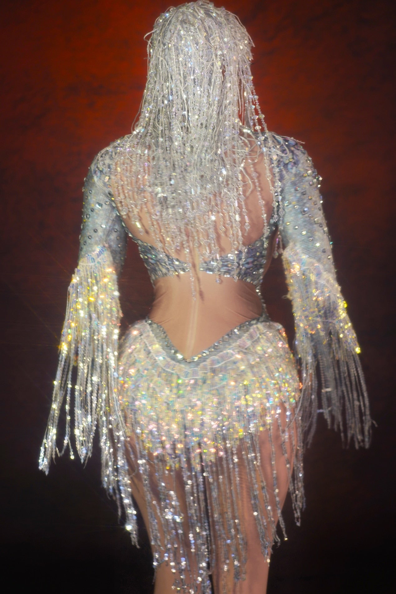 Silver Sequins Fringes Nude Bodysuit Long Sleeves Evening Celebrate Dance Wear Birthday Celebrate Dance Outfit