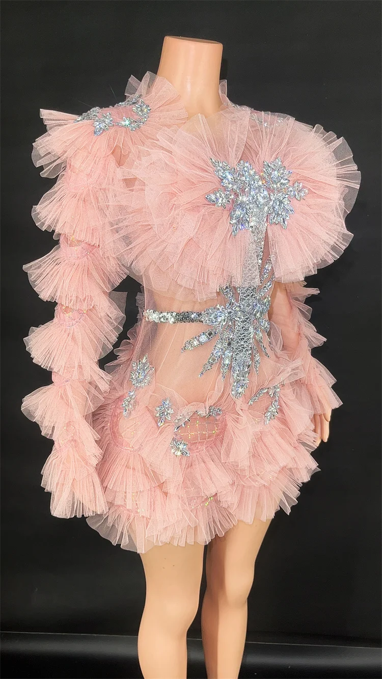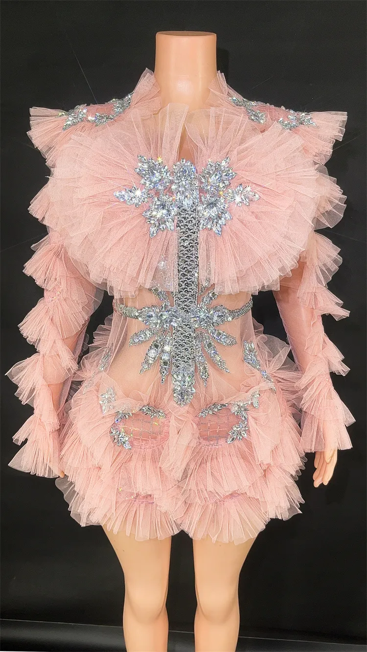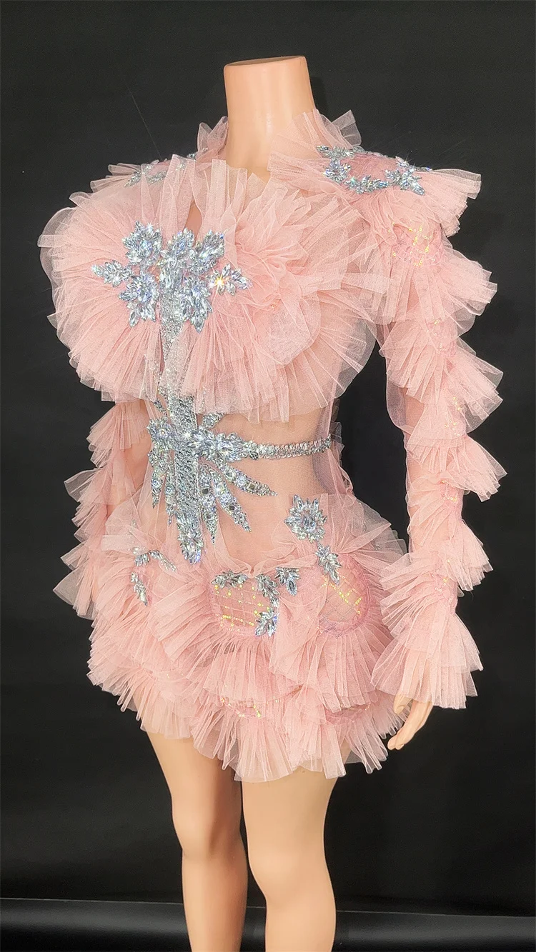This stunning bodycon mini dress features sparkling diamonds and crystal embellishments, with a sexy mesh see-through design. Perfect for women to wear at birthday parties, celebrations, and performances. It's the ultimate costume for making a statement and turning heads.