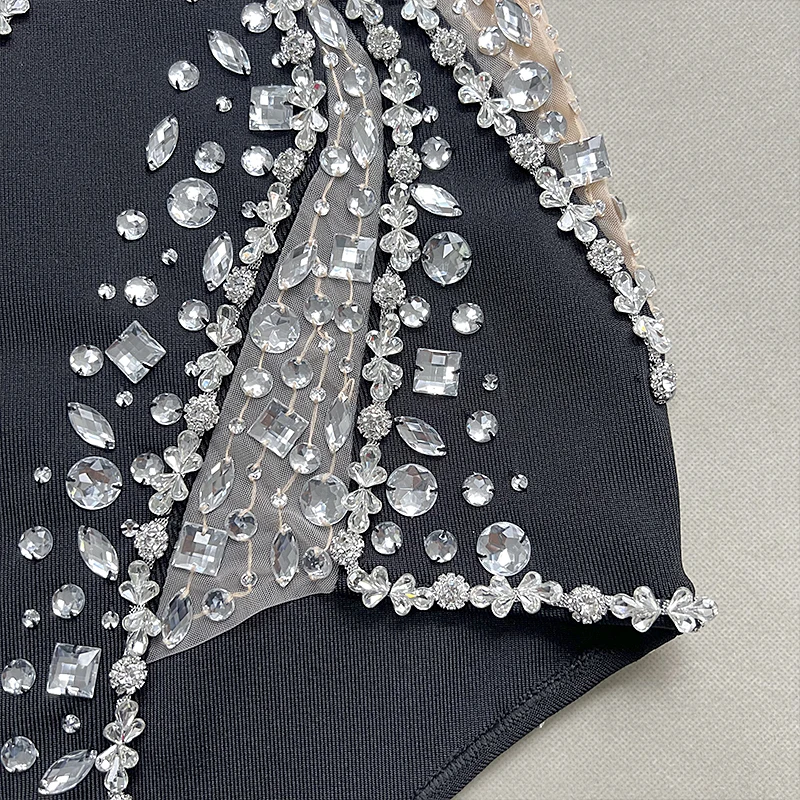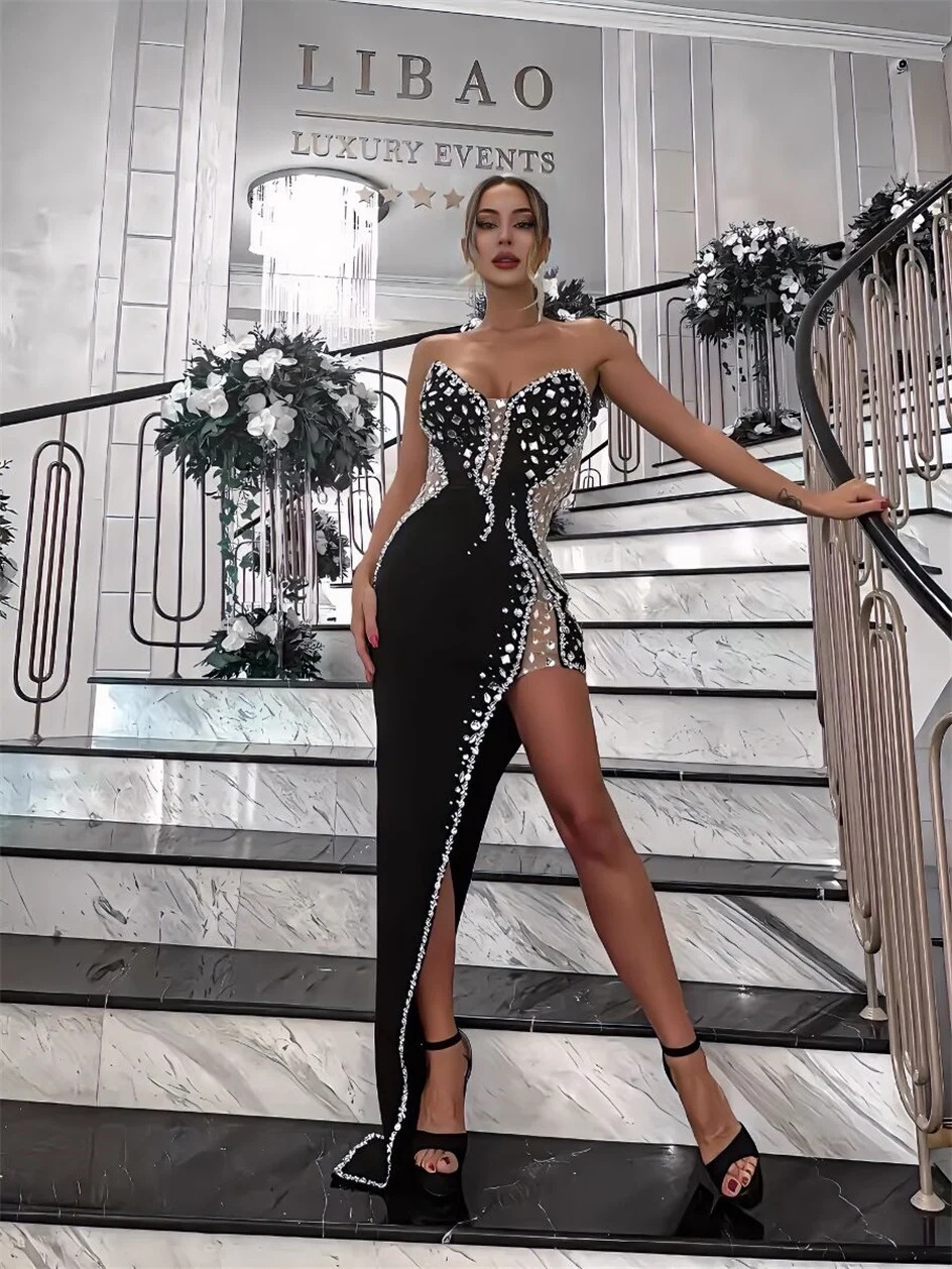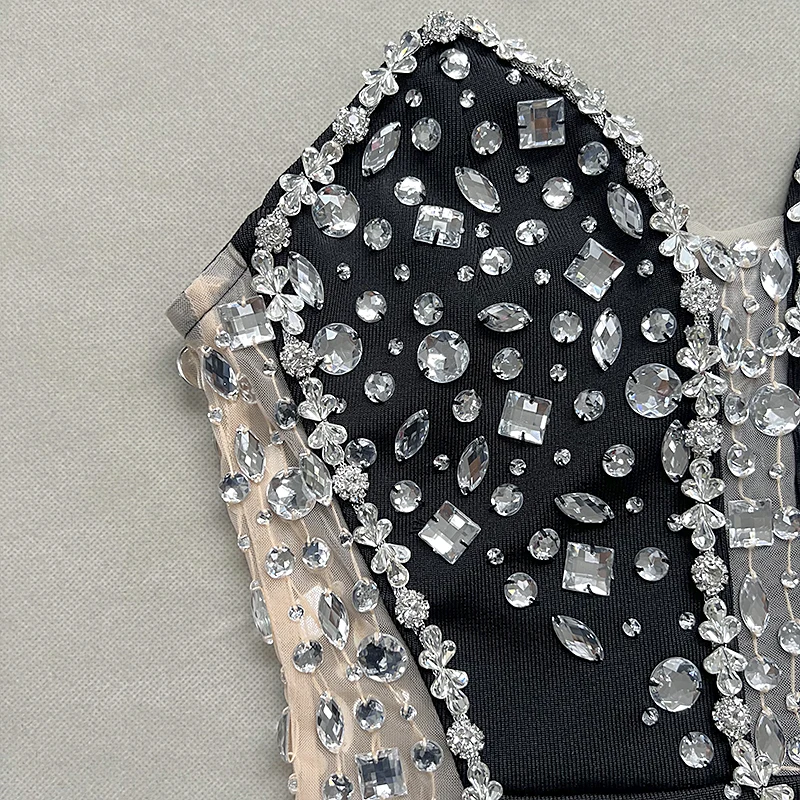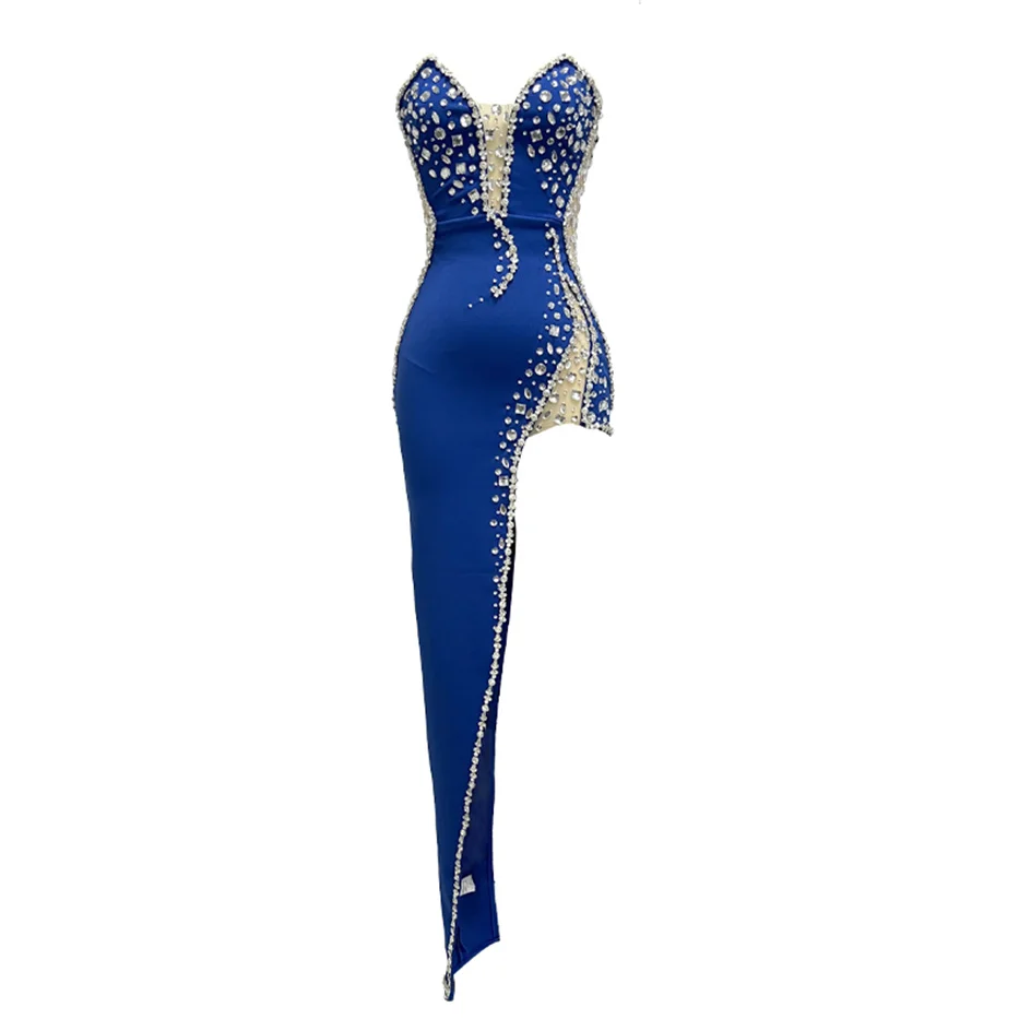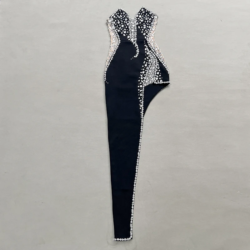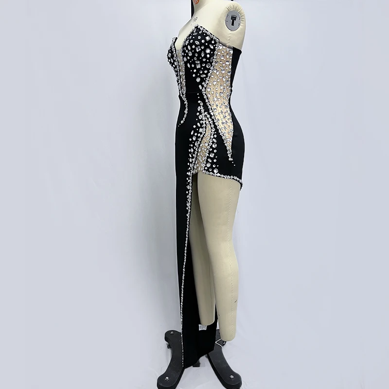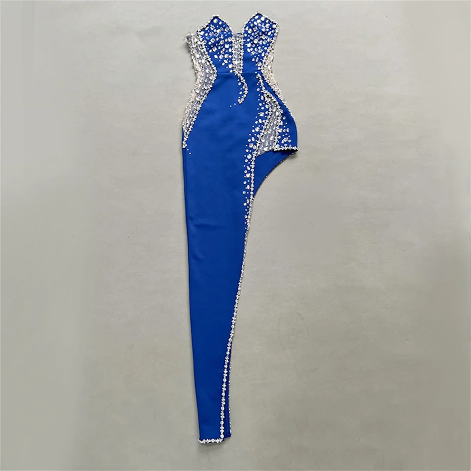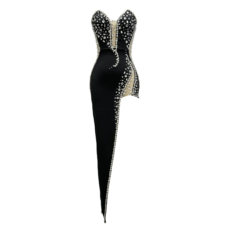 Sparking Rhinestone Diamond Inlay Women Strapless Sexy Mesh Splicing Bandage Irregularity Bodycon Dress Evening Party Dress