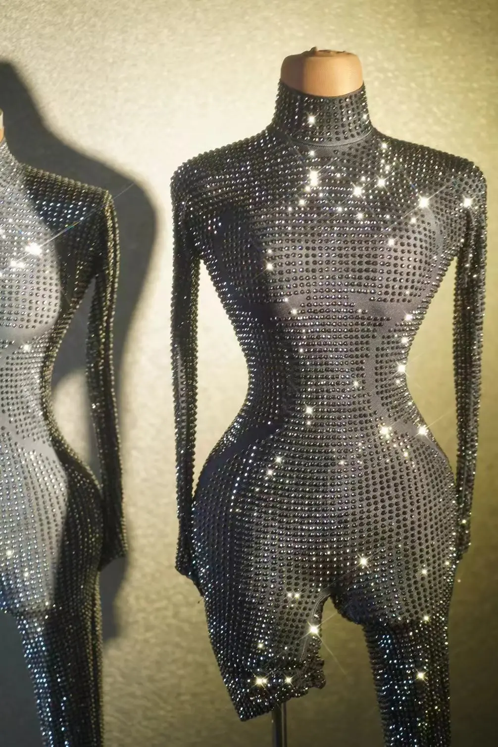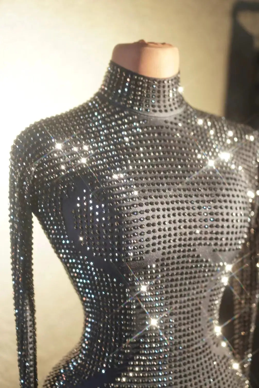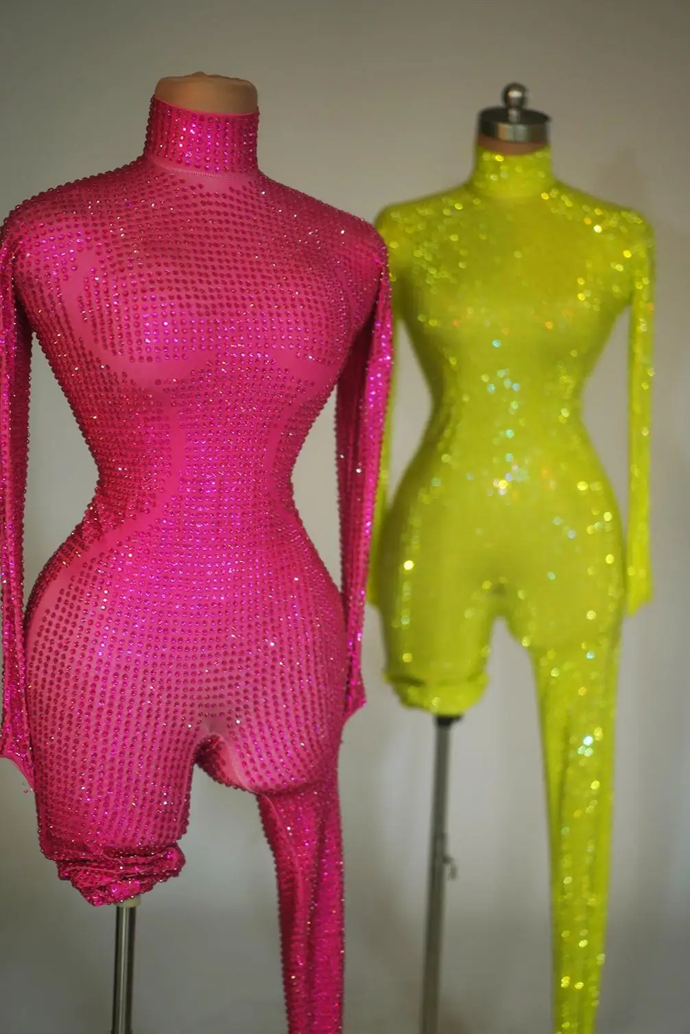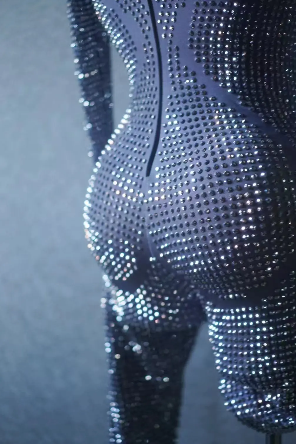 Sparkle Long Sleeve Party Romper Dancer Festival Outfit Skinny One Piece Bodysuit Women Sexy Full Diamond Jumpsuit Jingdian