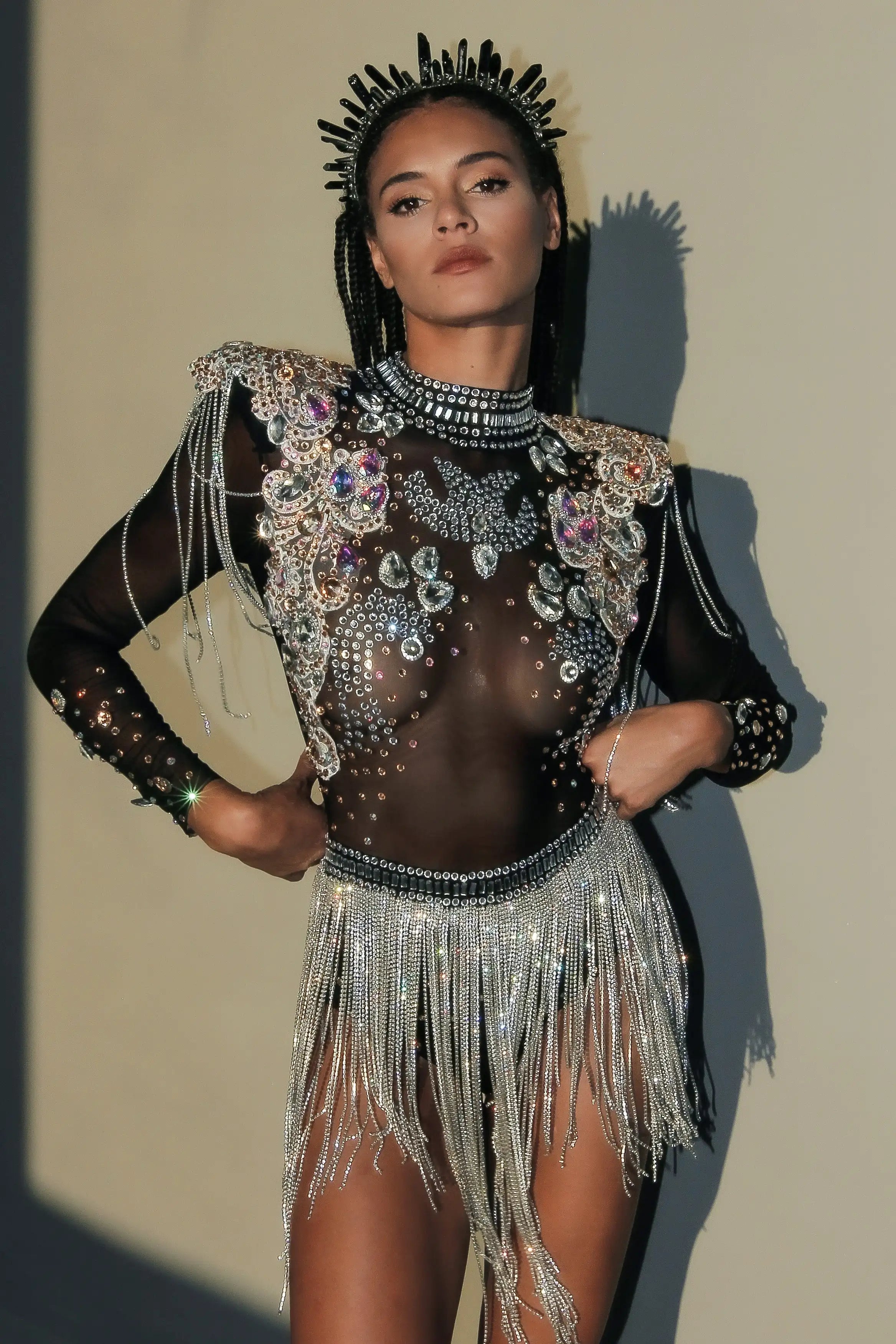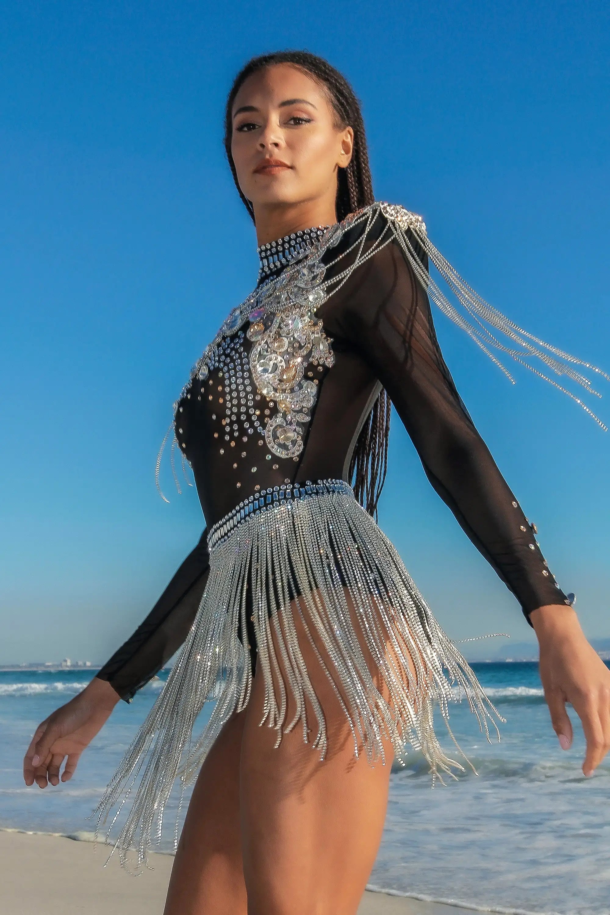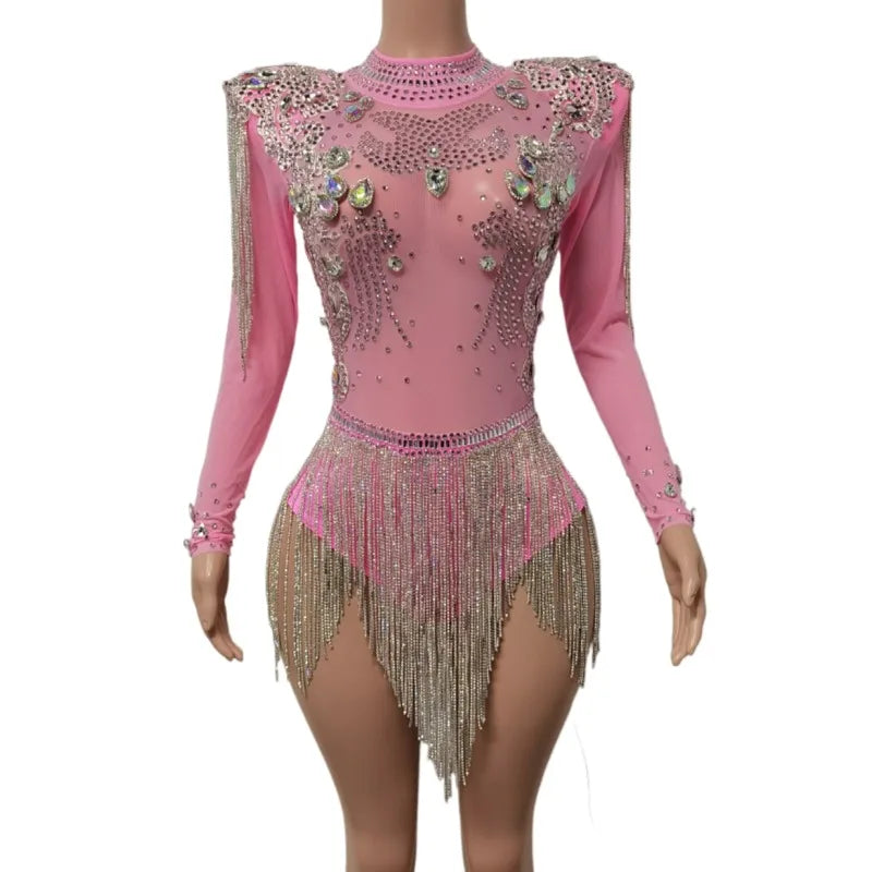 Shine bright on stage with this stunning sparkle rhinestones one-piece short jumpsuit. Designed for female dancers, this sexy mesh bodysuit is adorned with dazzling diamond tassels that catch the light beautifully with every movement. Perfect for performances, nightclub appearances, or special events, this outfit combines style and comfort, ensuring you look and feel your best while captivating the audience. Elevate your stage presence with this eye-catching jumpsuit!